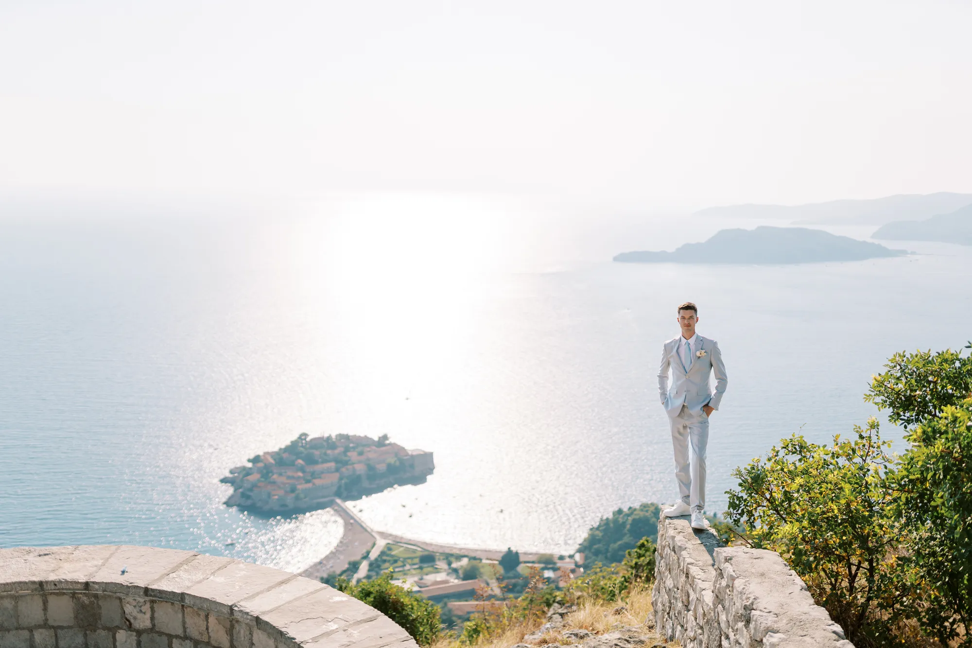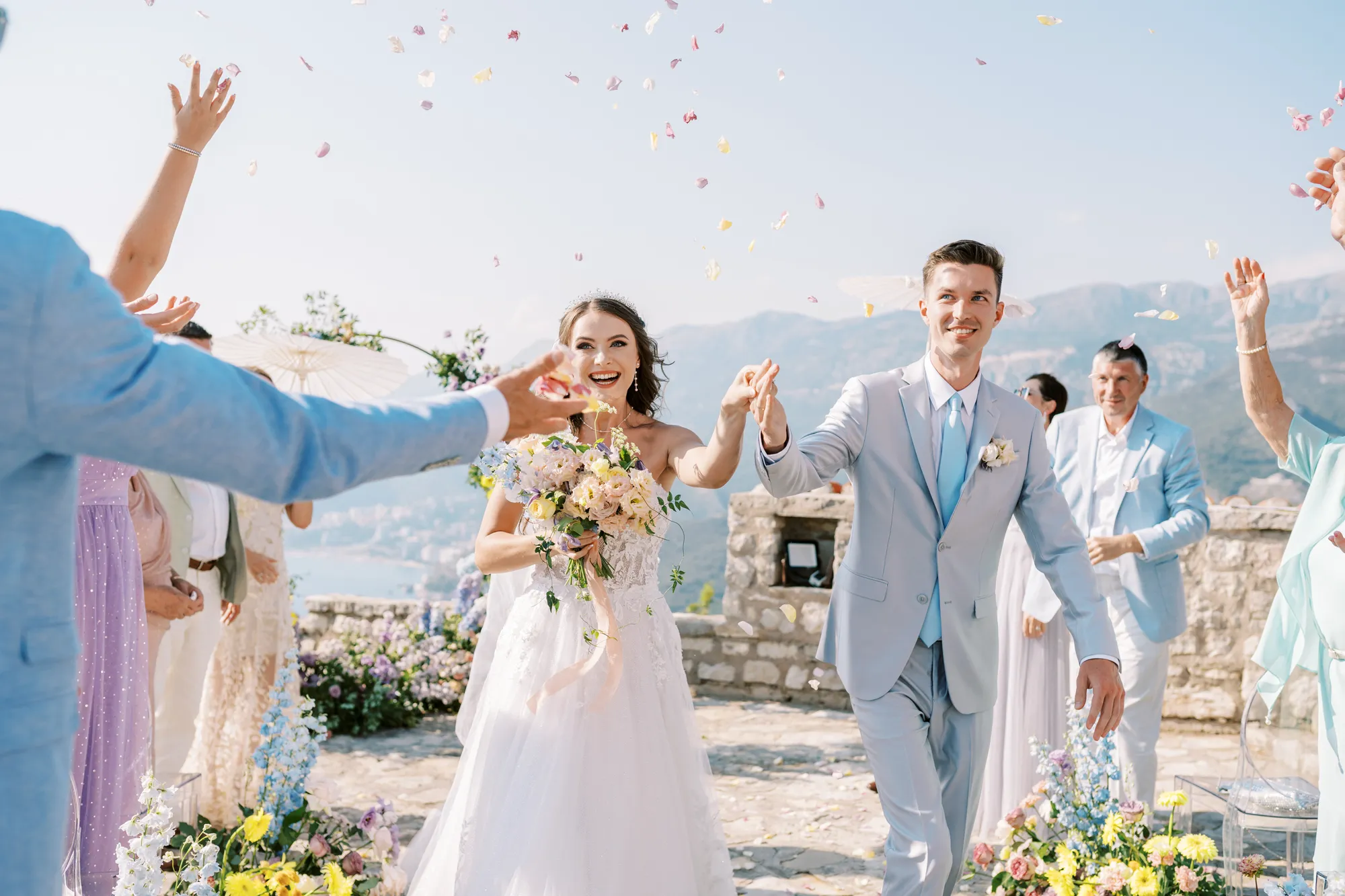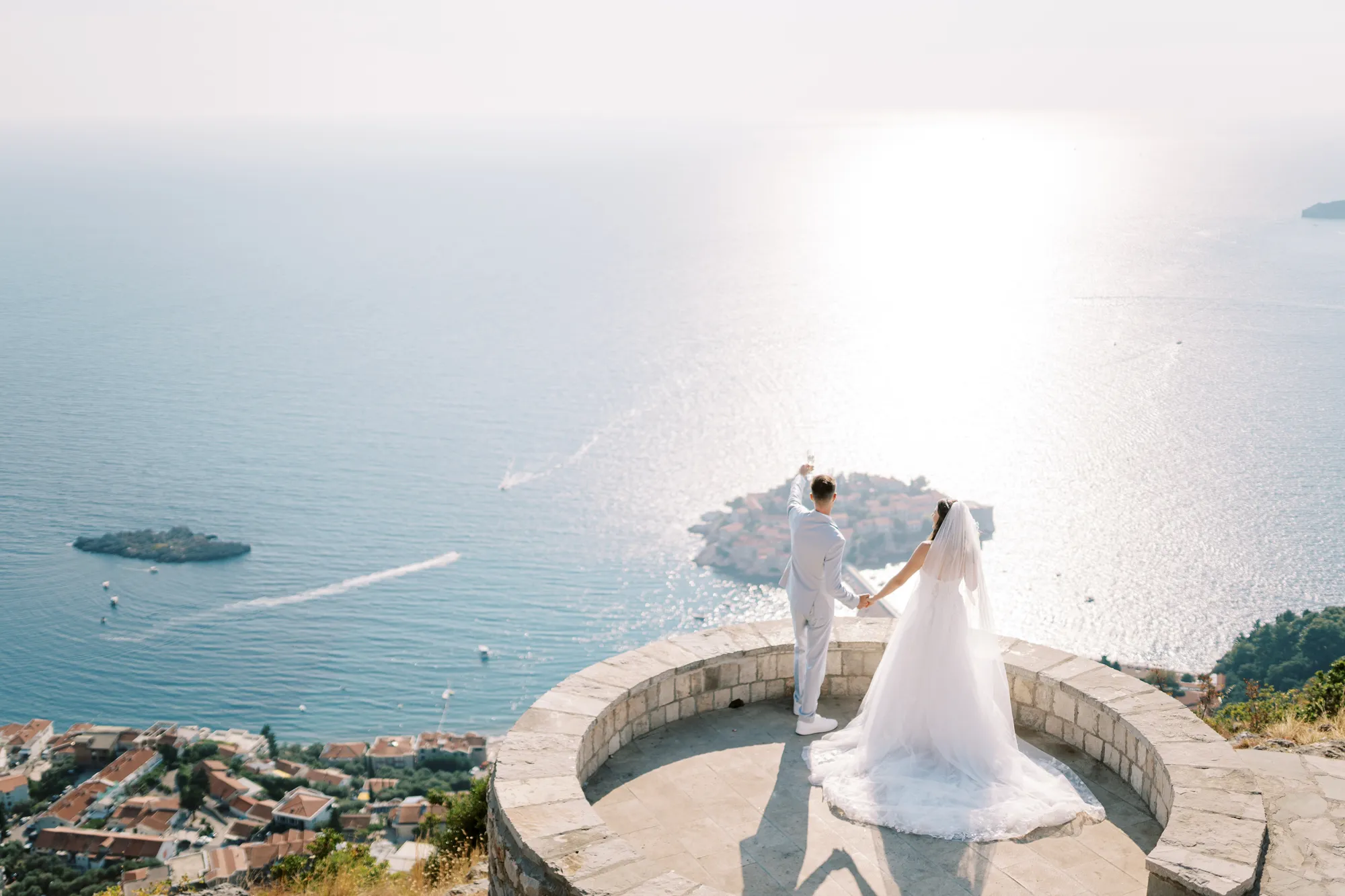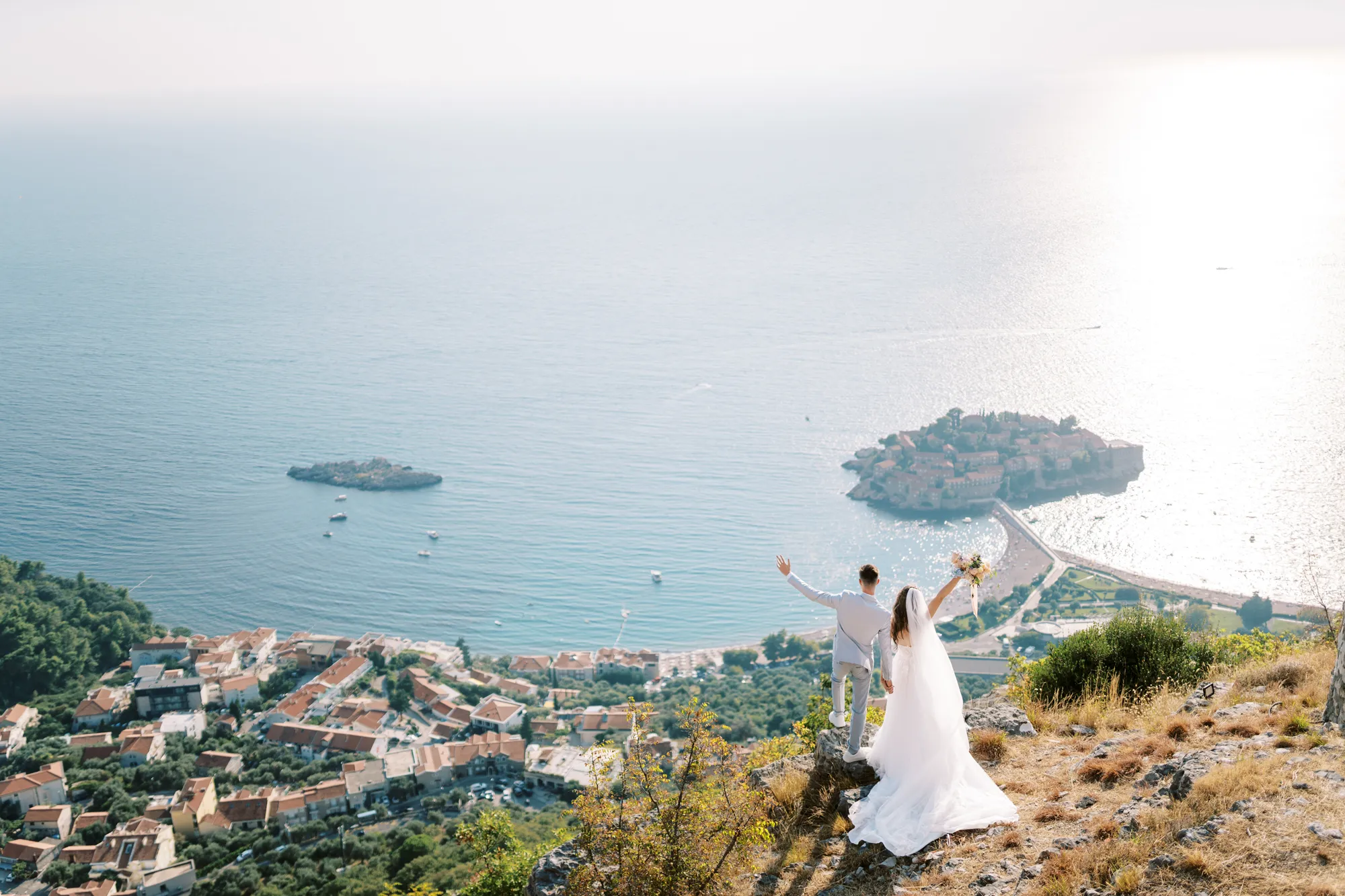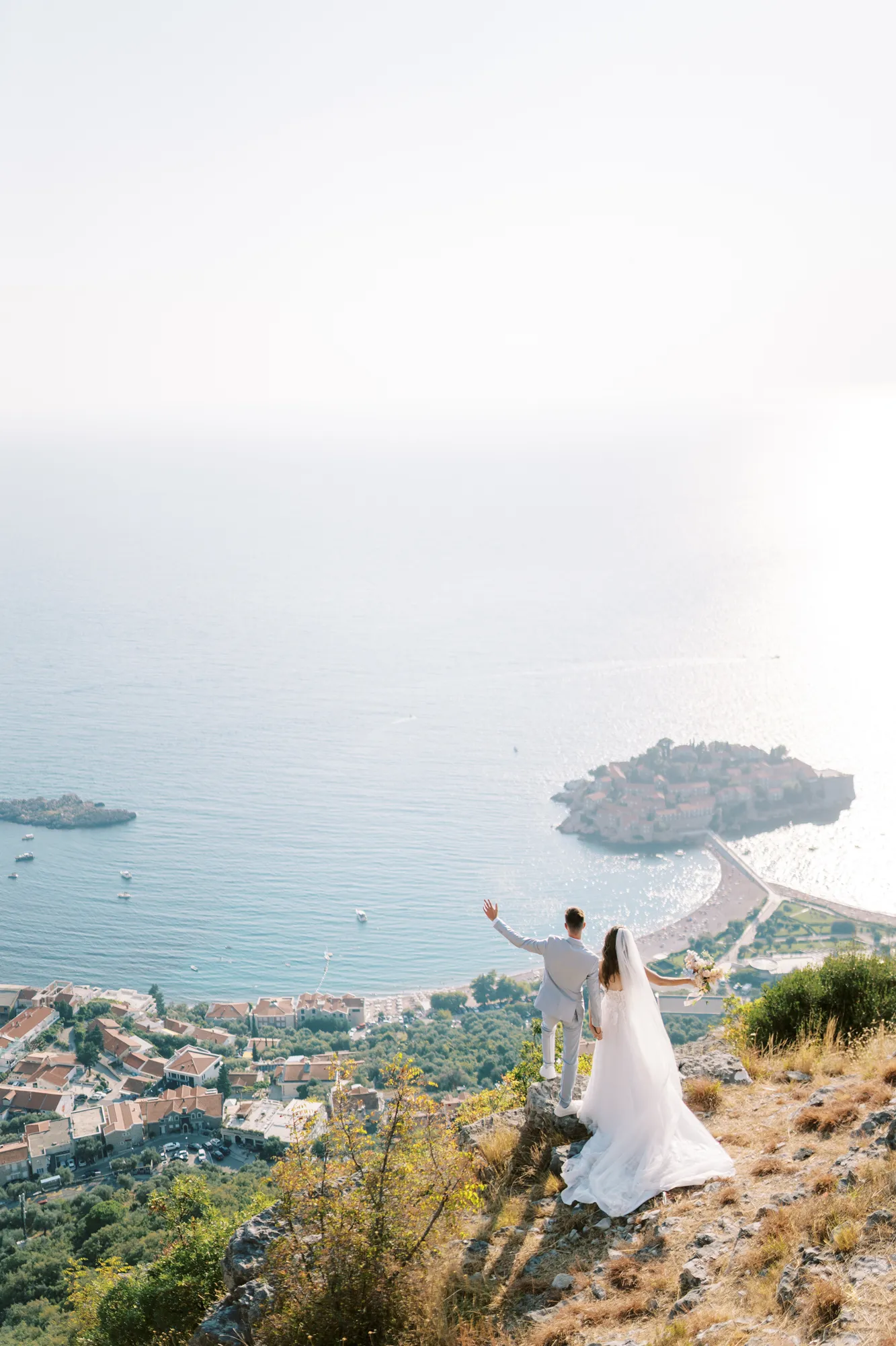 The ceremony took place on a panoramic terrace overlooking the iconic island of Sveti Stefan, one of the most picturesque locations for a wedding in Montenegro. This romantic spot became the symbol of their new life together.