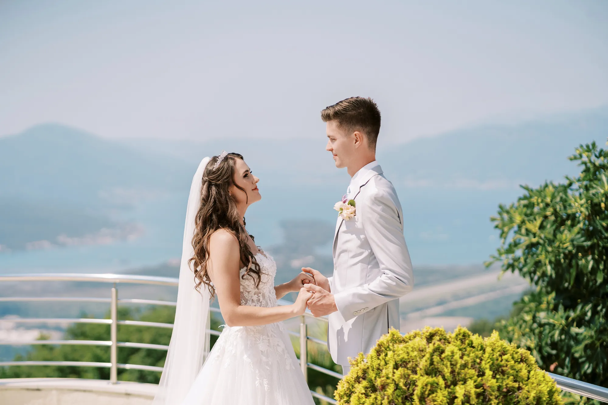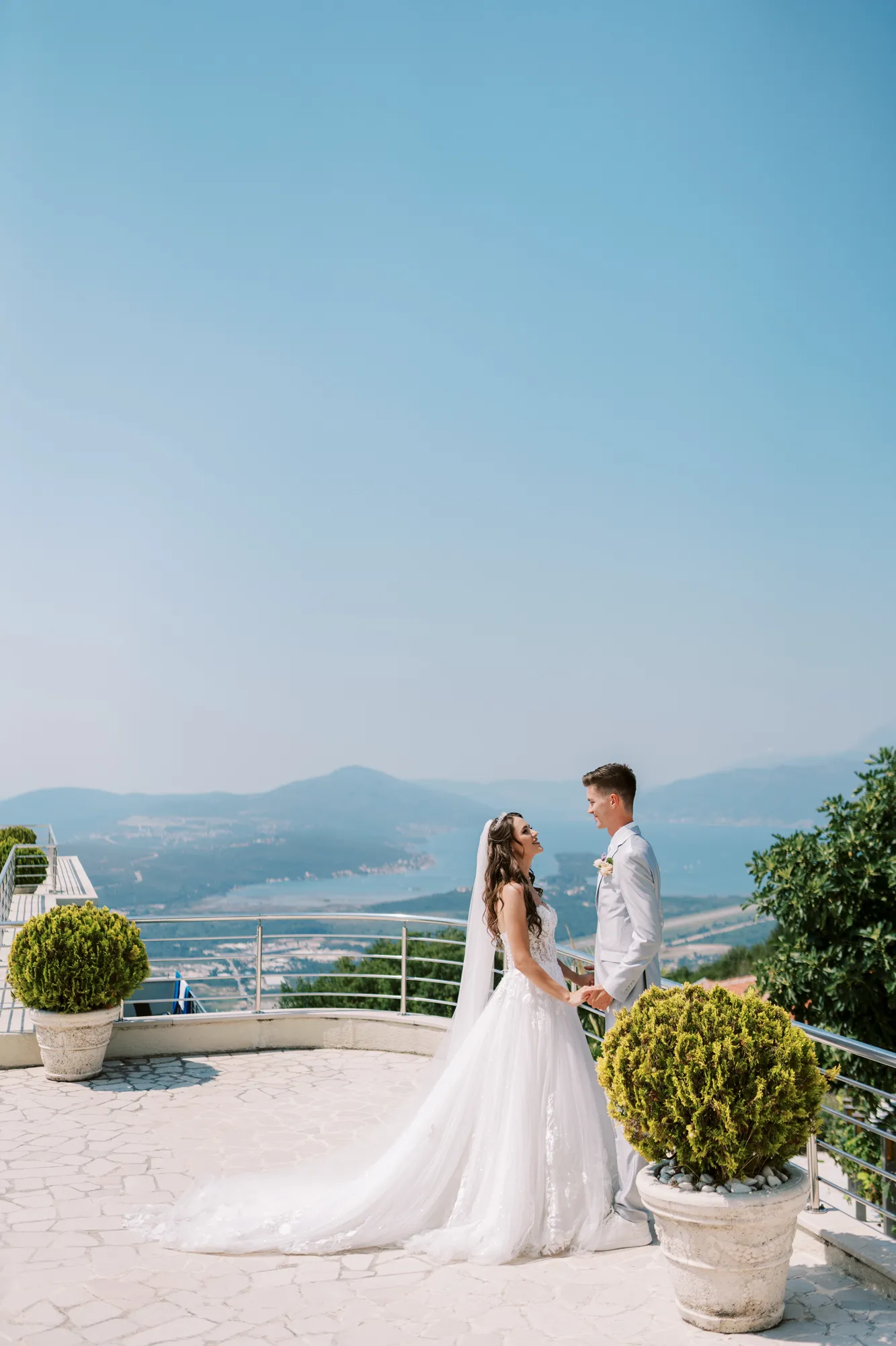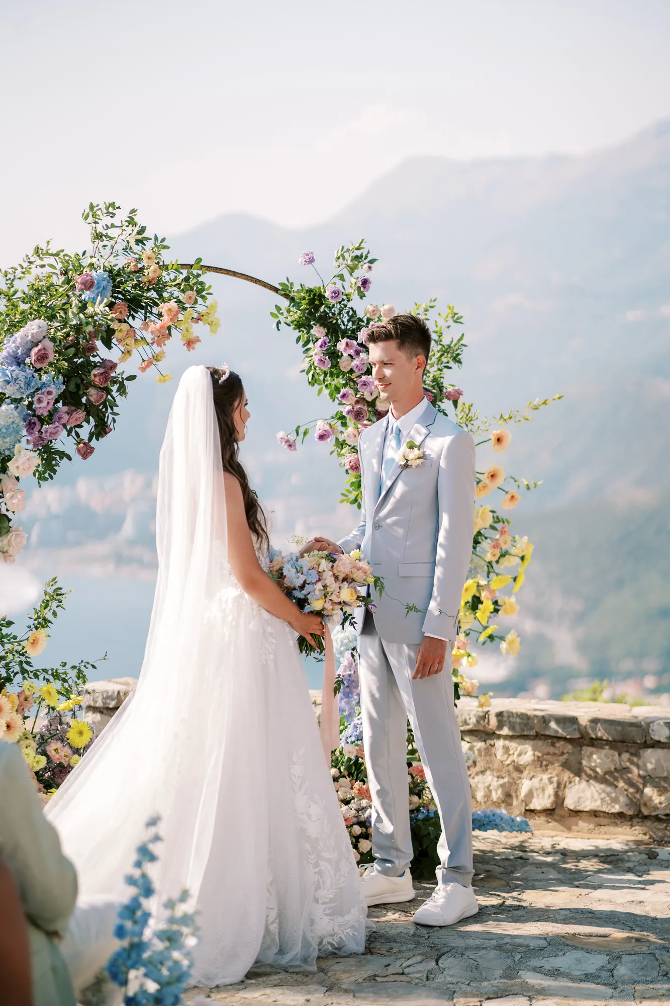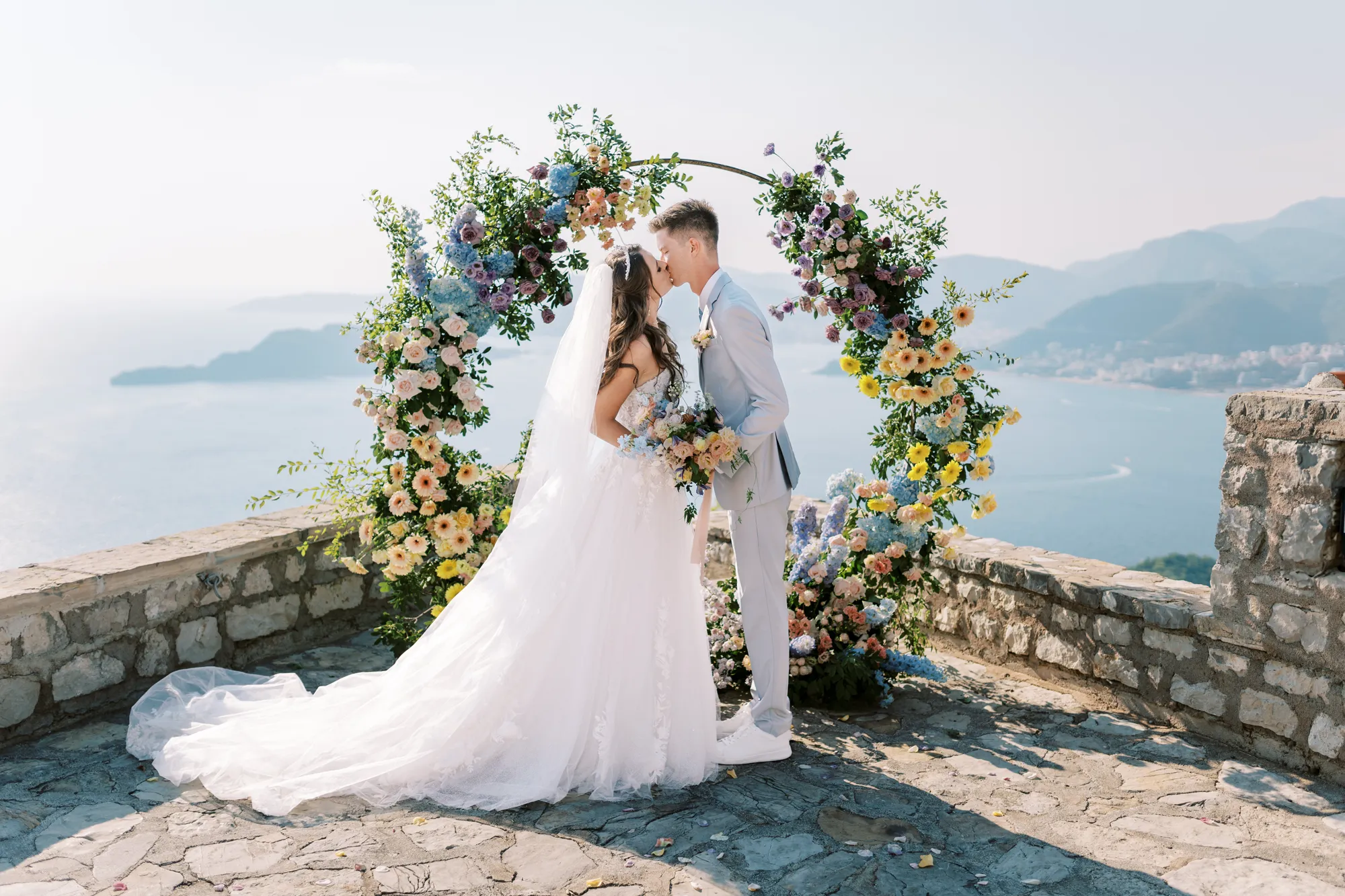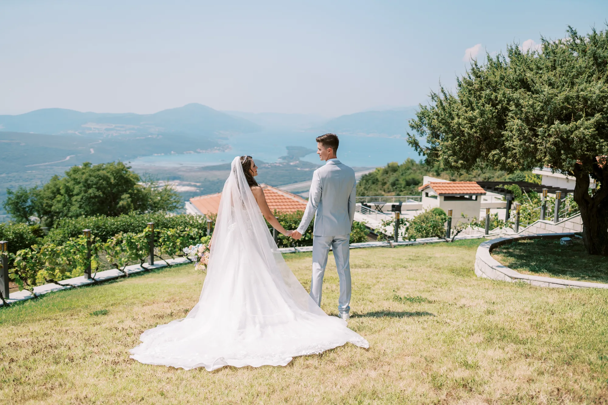 The ceremony took place on a panoramic terrace overlooking the iconic island of Sveti Stefan, one of the most picturesque locations for a wedding in Montenegro. This romantic spot became the symbol of their new life together.