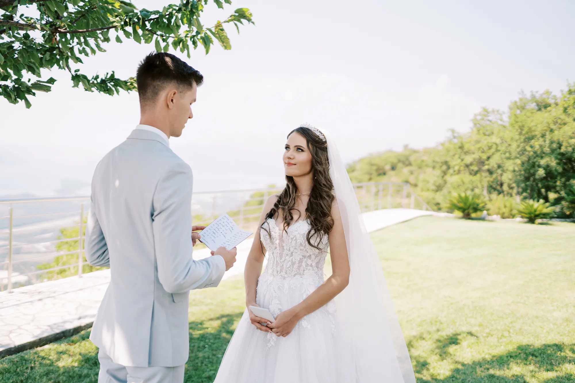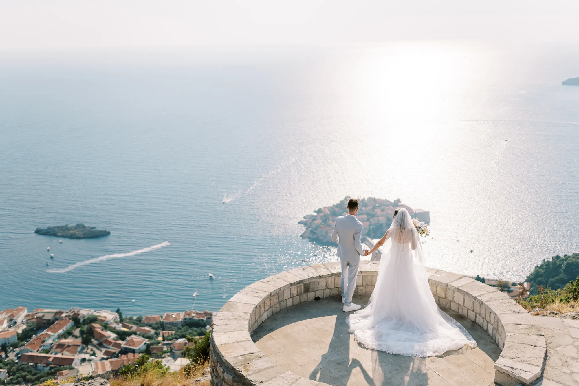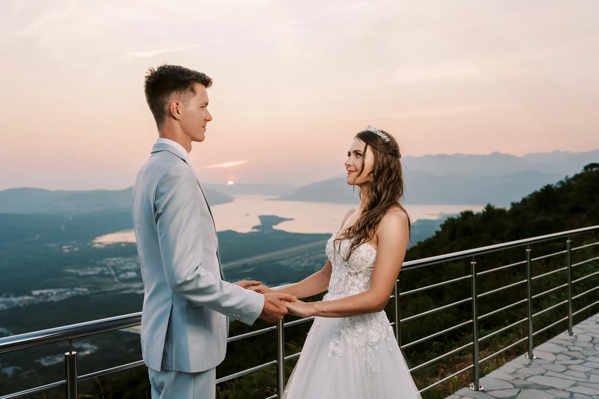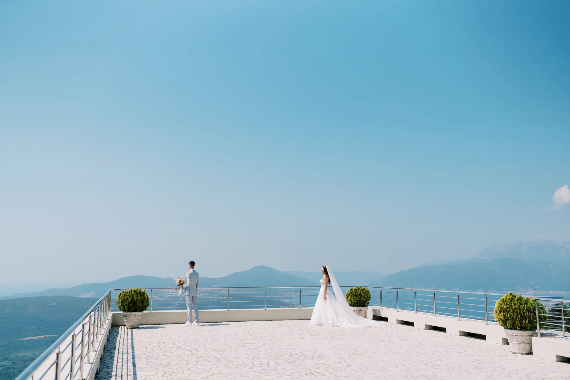 The ceremony took place on a panoramic terrace overlooking the iconic island of Sveti Stefan, one of the most picturesque locations for a wedding in Montenegro. This romantic spot became the symbol of their new life together.