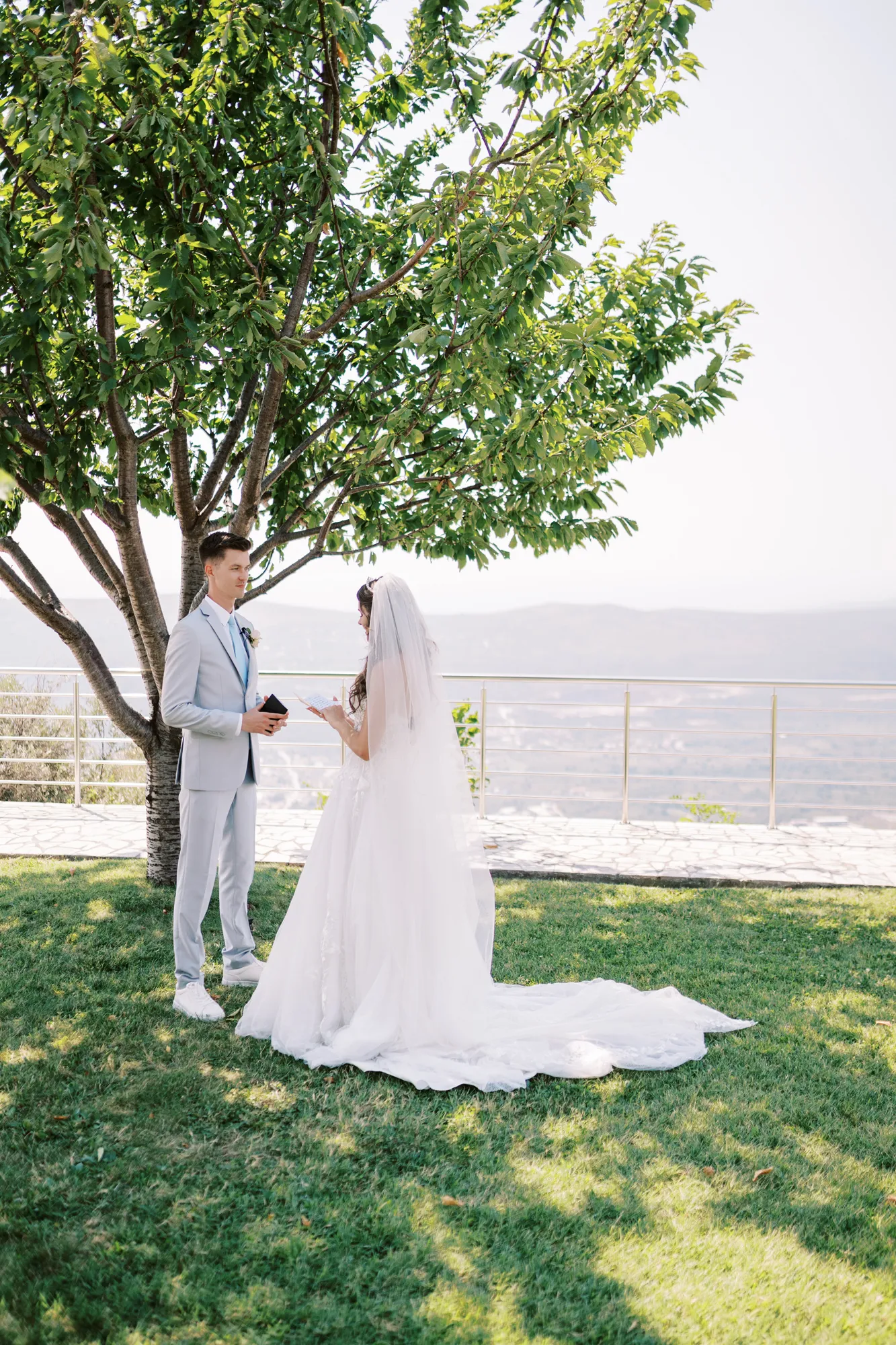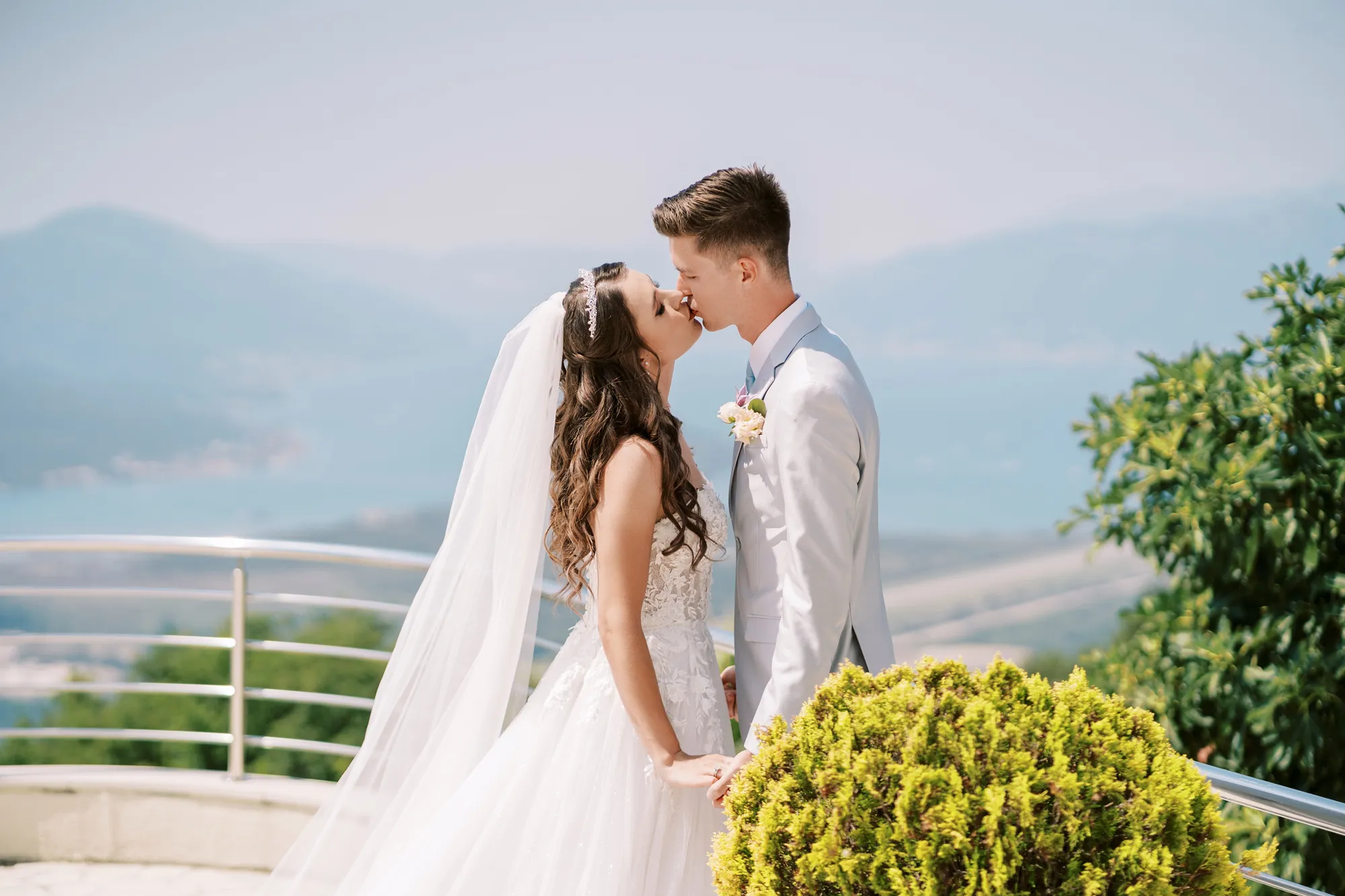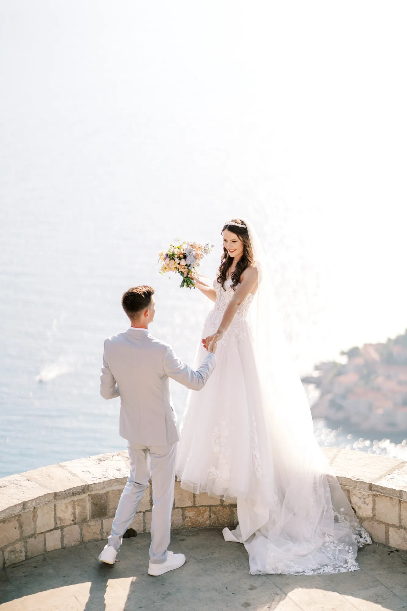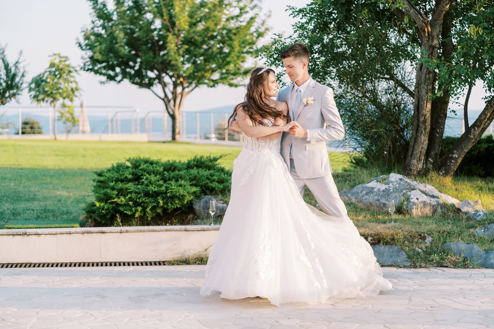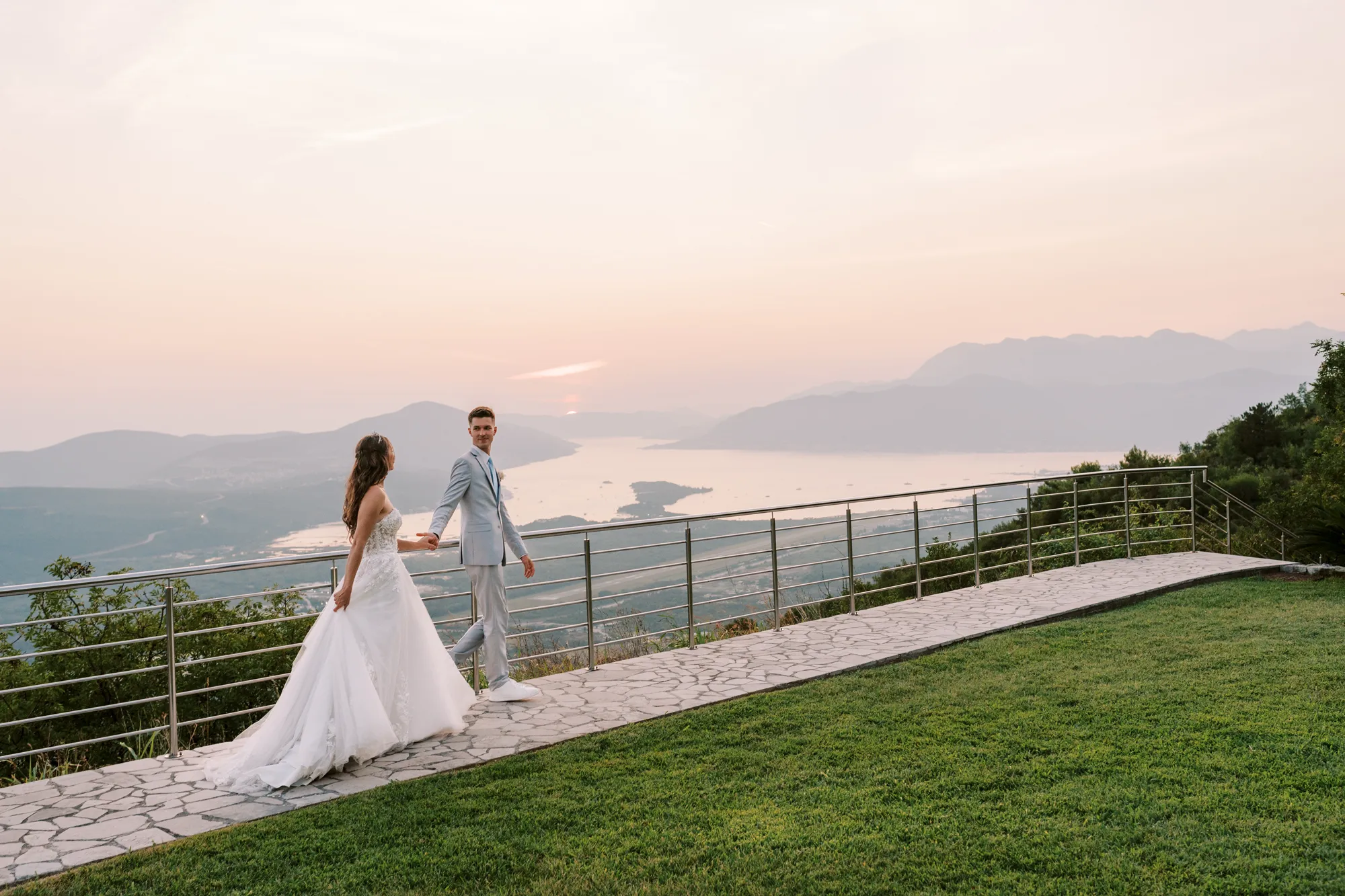 The ceremony took place on a panoramic terrace overlooking the iconic island of Sveti Stefan, one of the most picturesque locations for a wedding in Montenegro. This romantic spot became the symbol of their new life together.