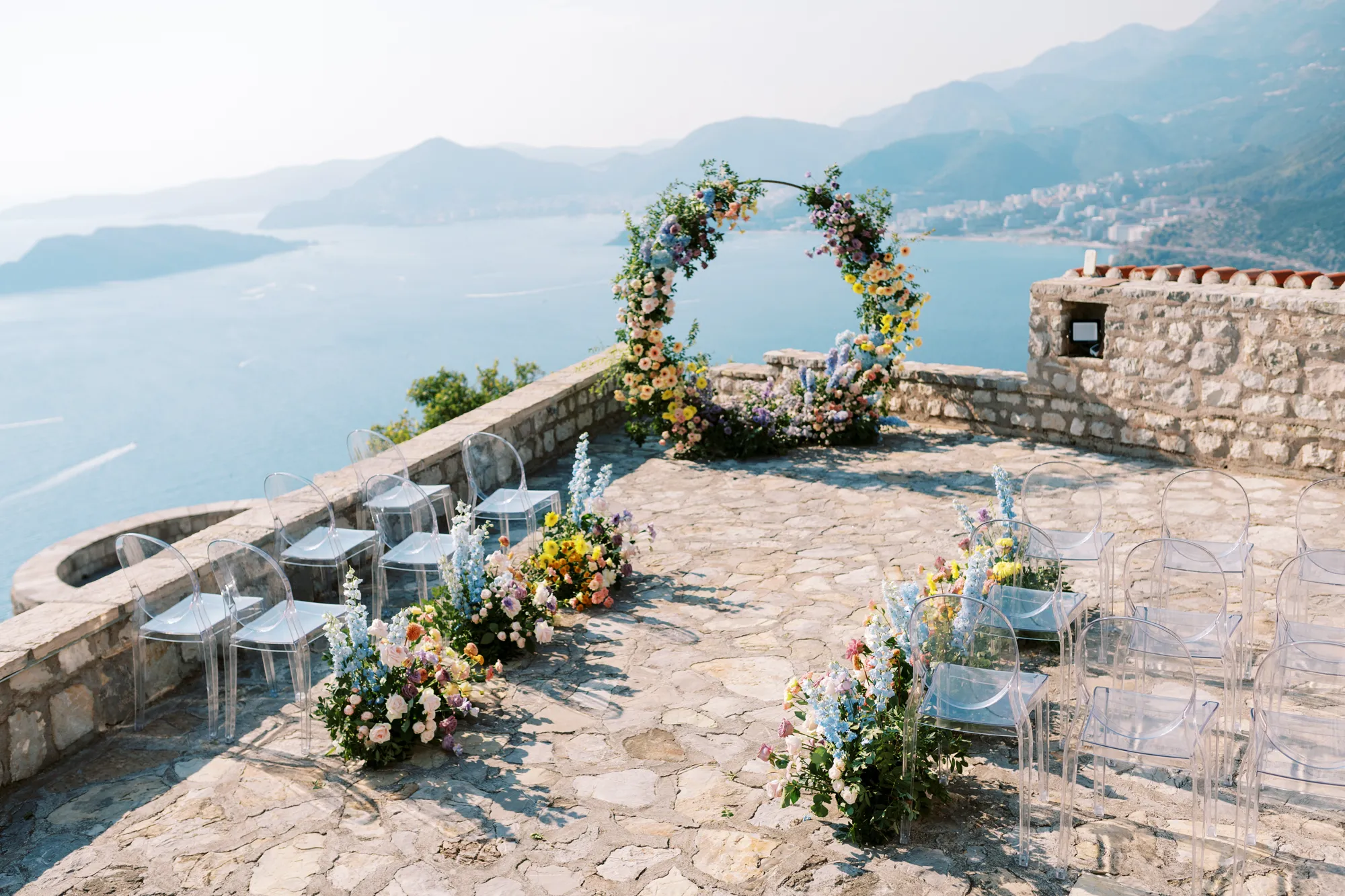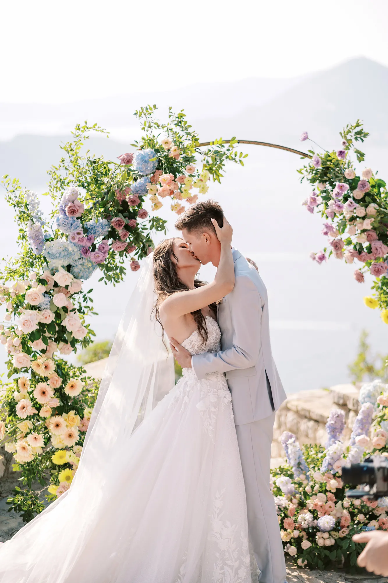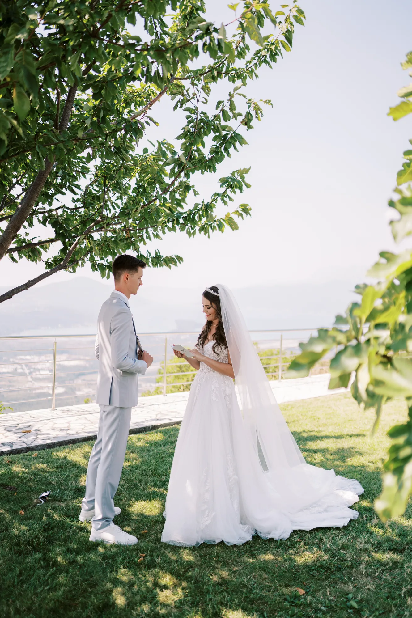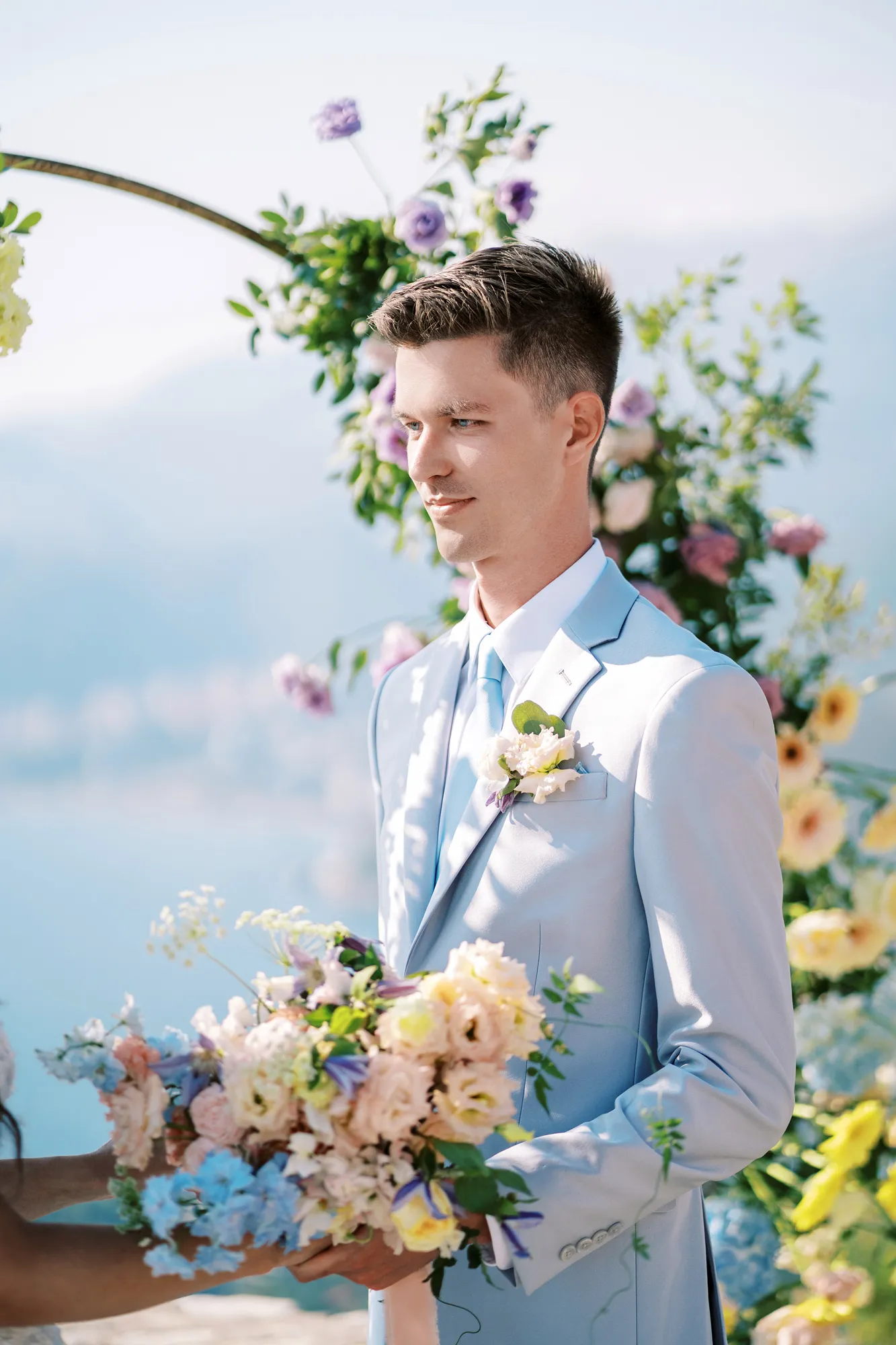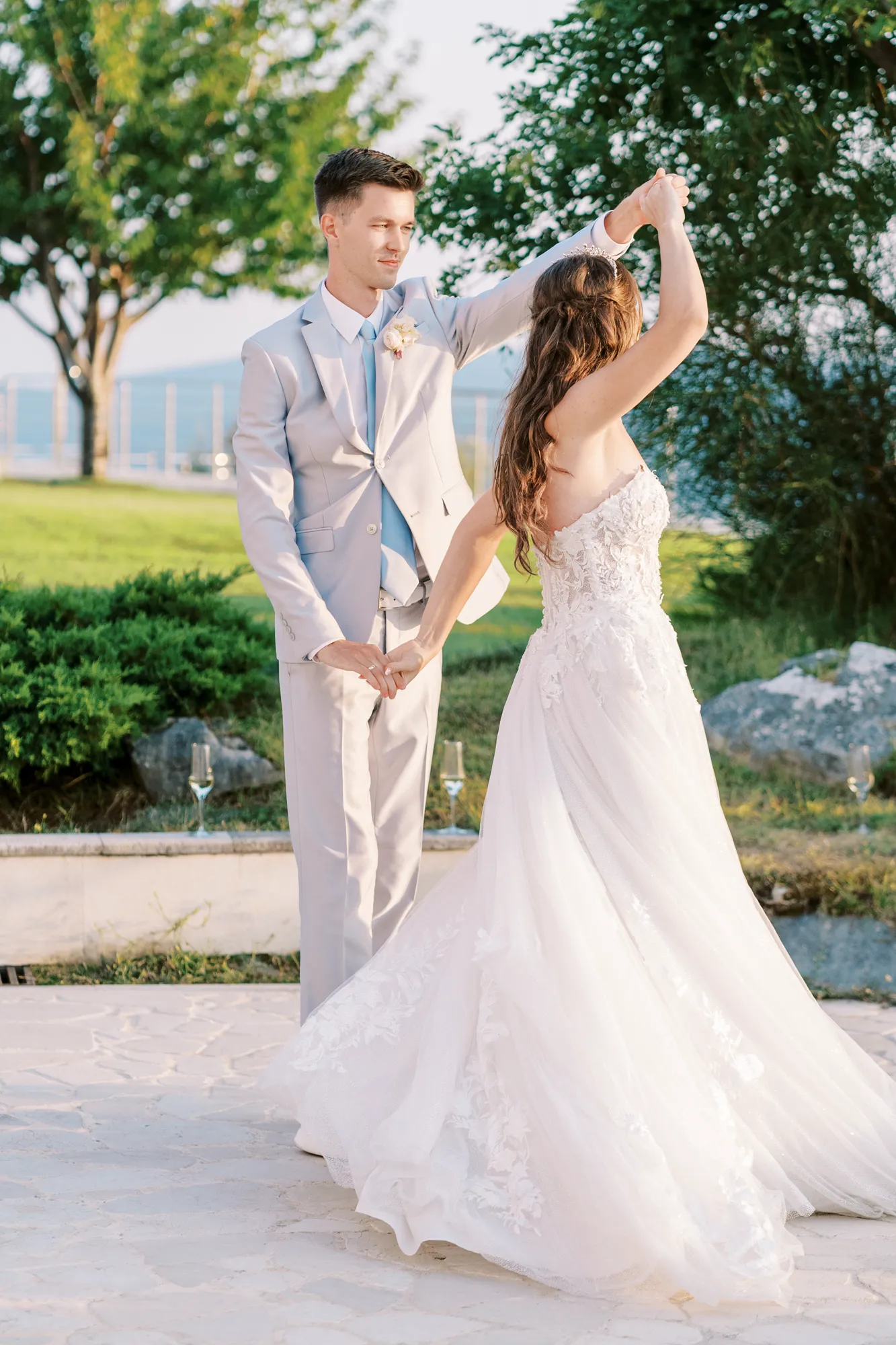 The ceremony took place on a panoramic terrace overlooking the iconic island of Sveti Stefan, one of the most picturesque locations for a wedding in Montenegro. This romantic spot became the symbol of their new life together.