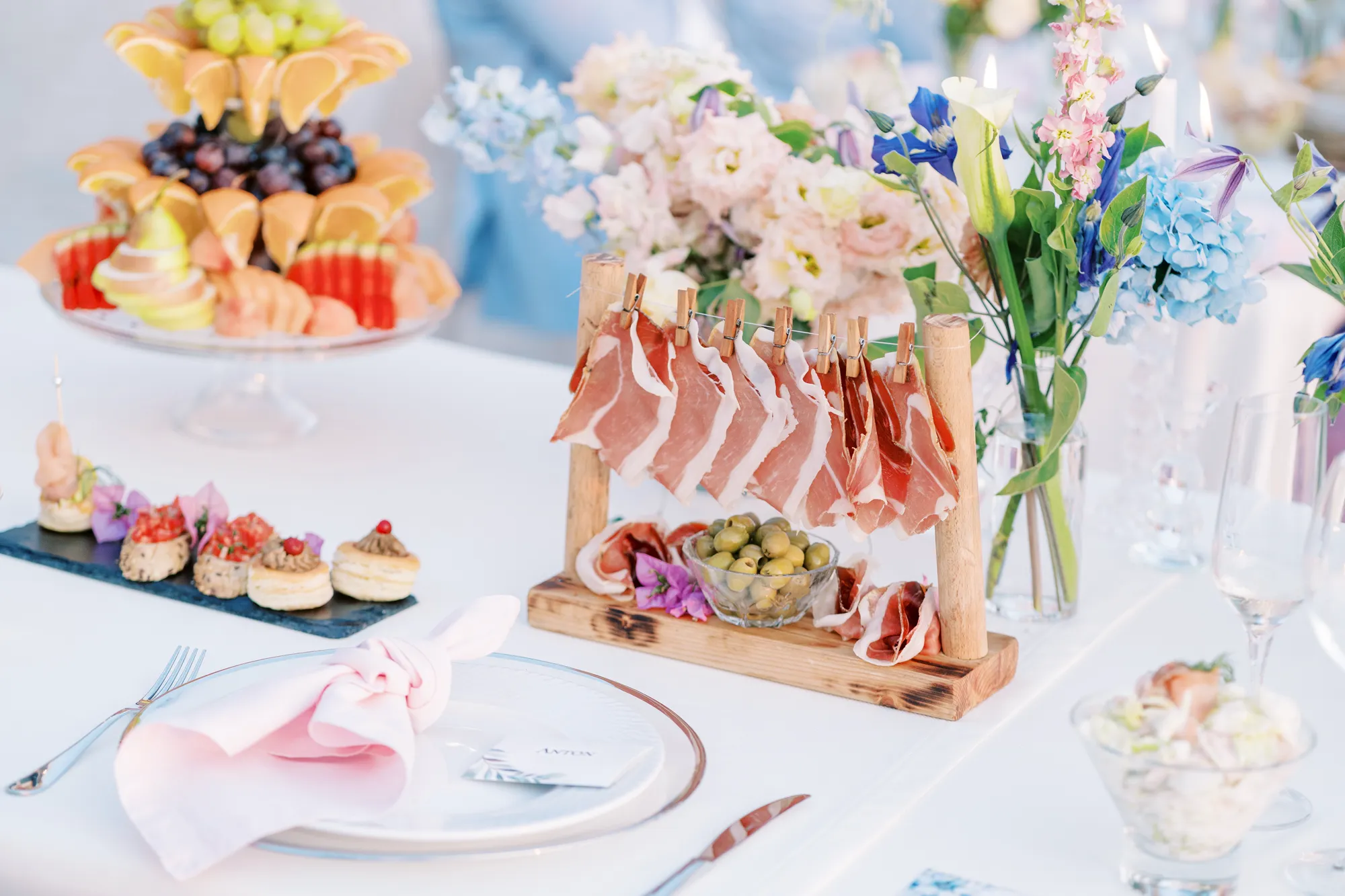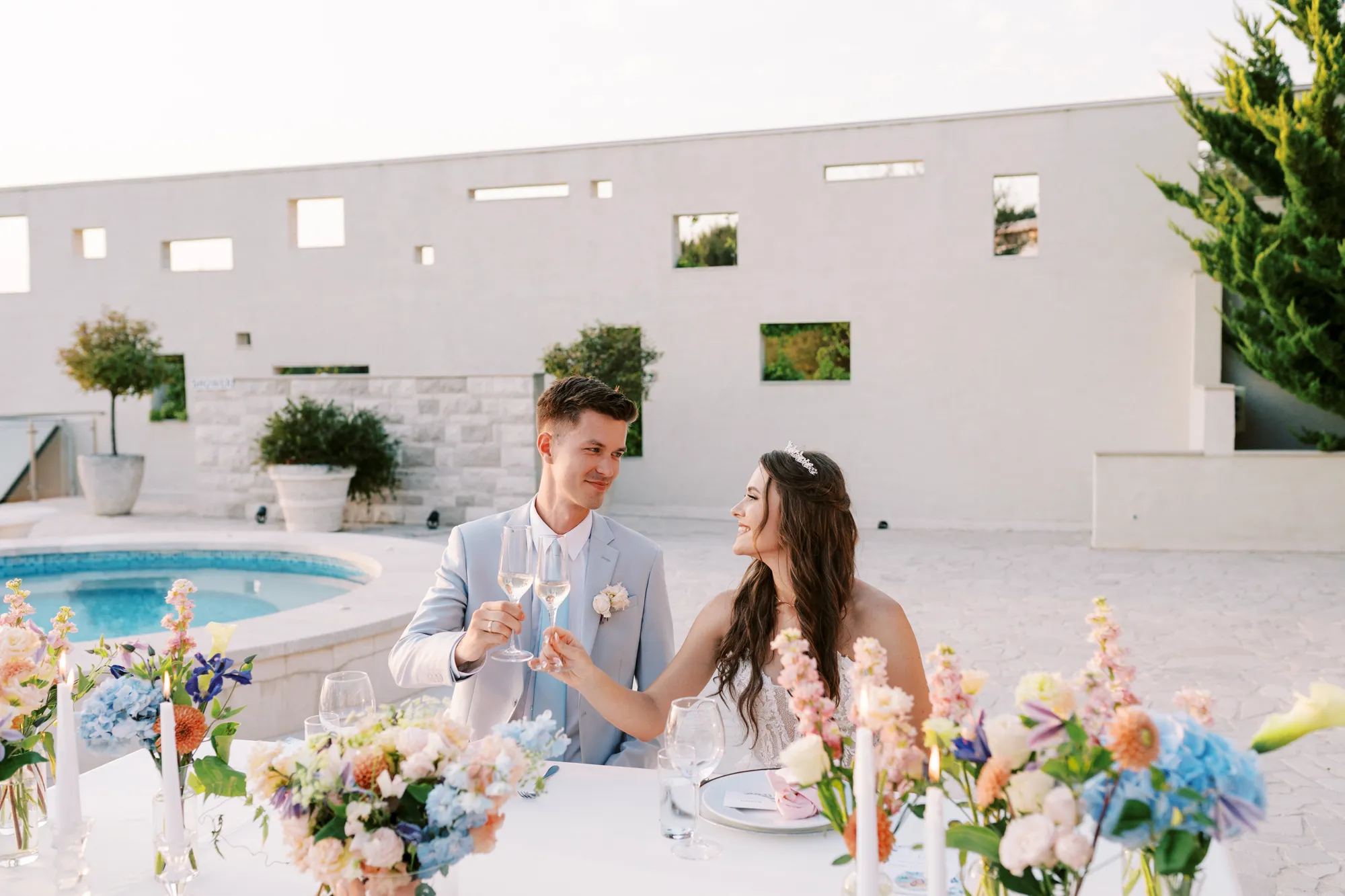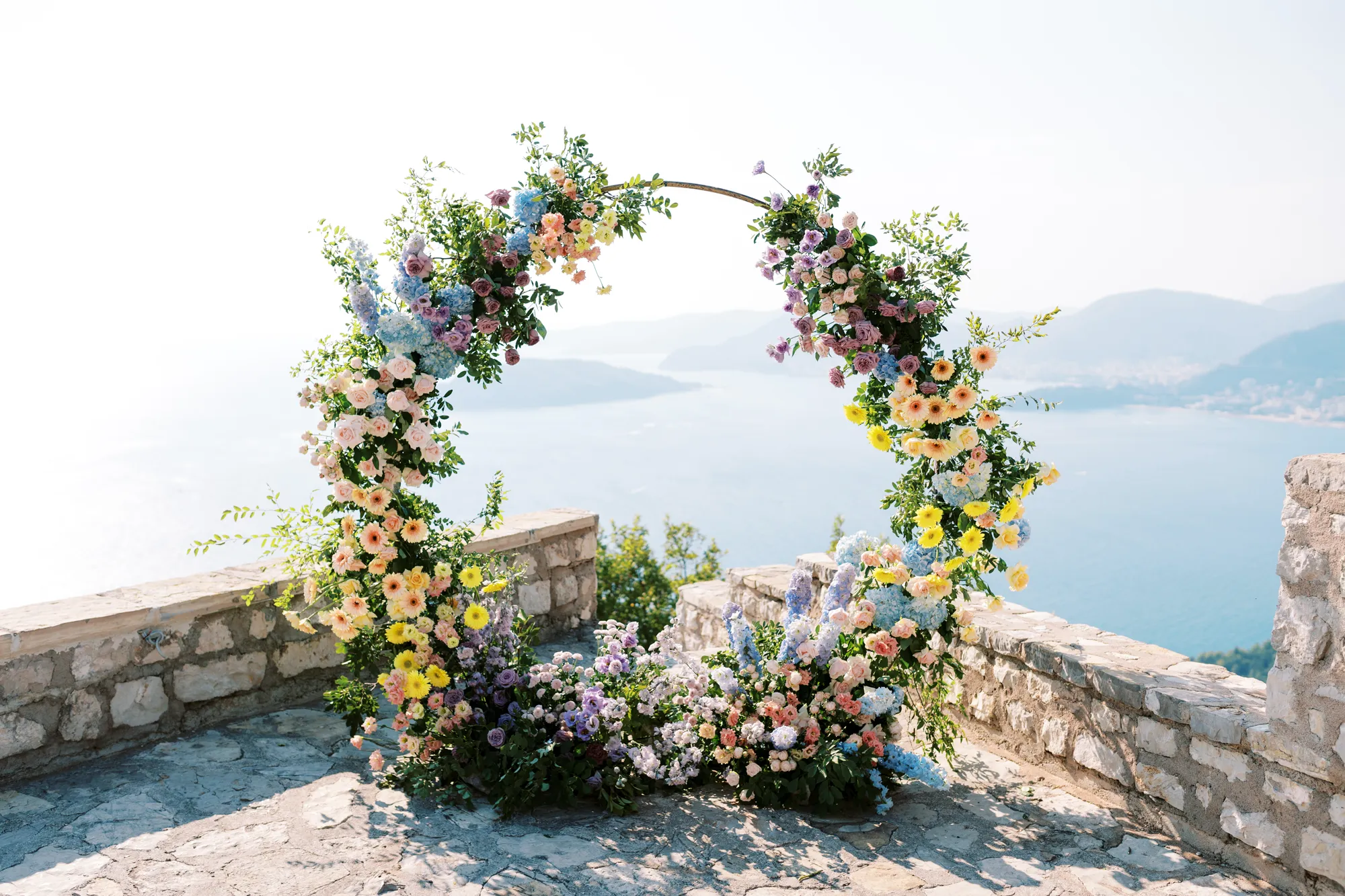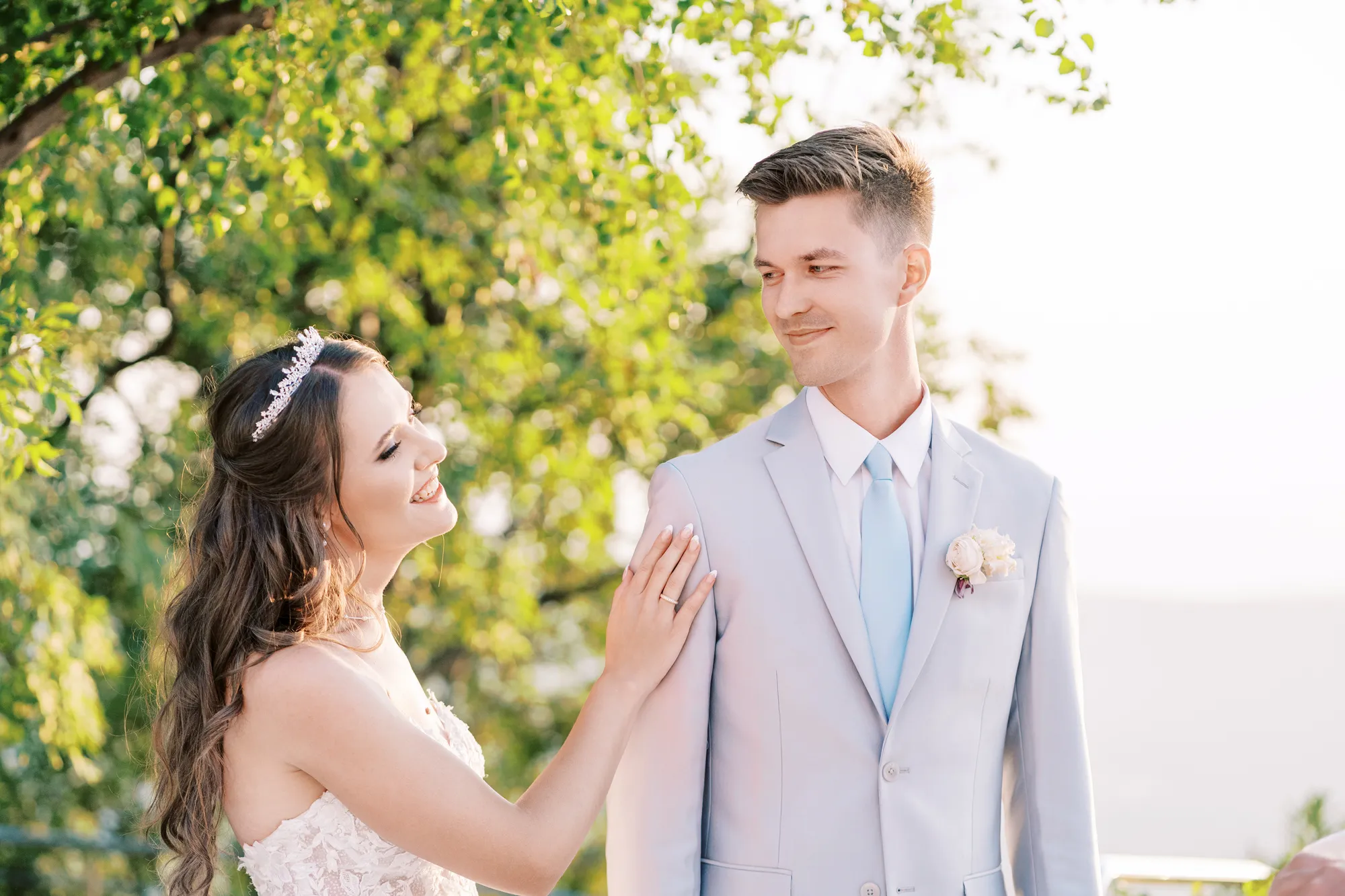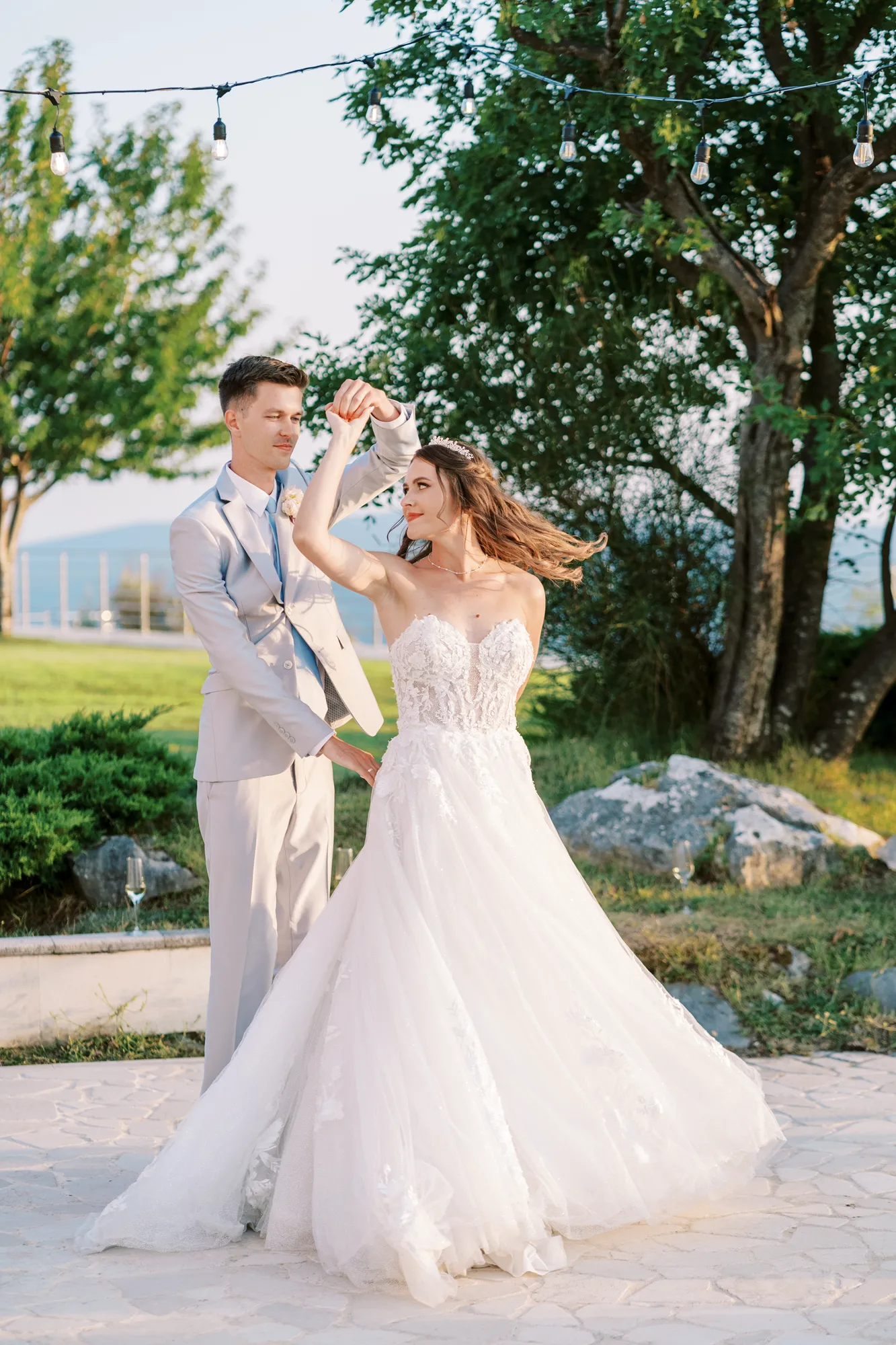 The ceremony took place on a panoramic terrace overlooking the iconic island of Sveti Stefan, one of the most picturesque locations for a wedding in Montenegro. This romantic spot became the symbol of their new life together.