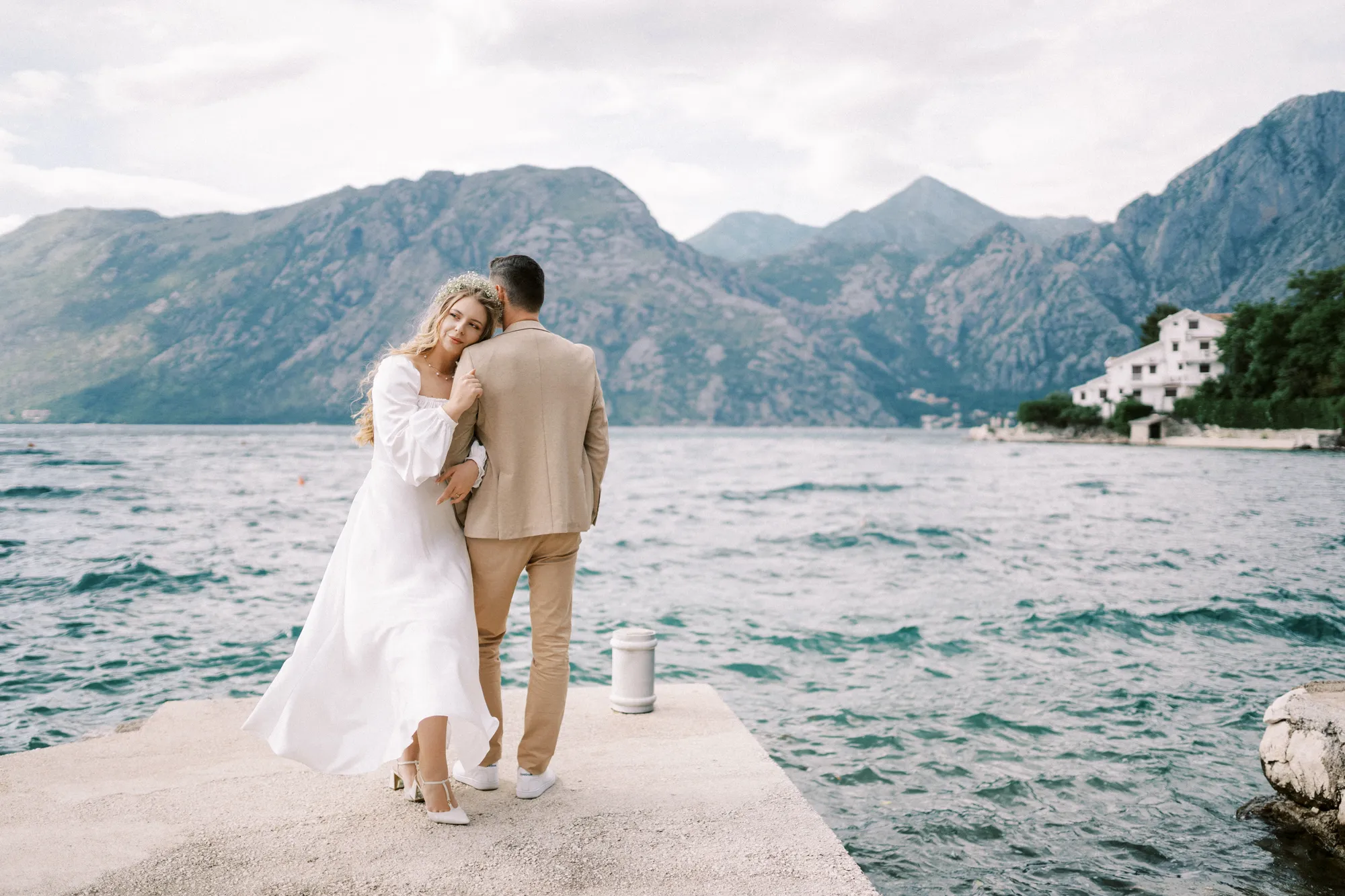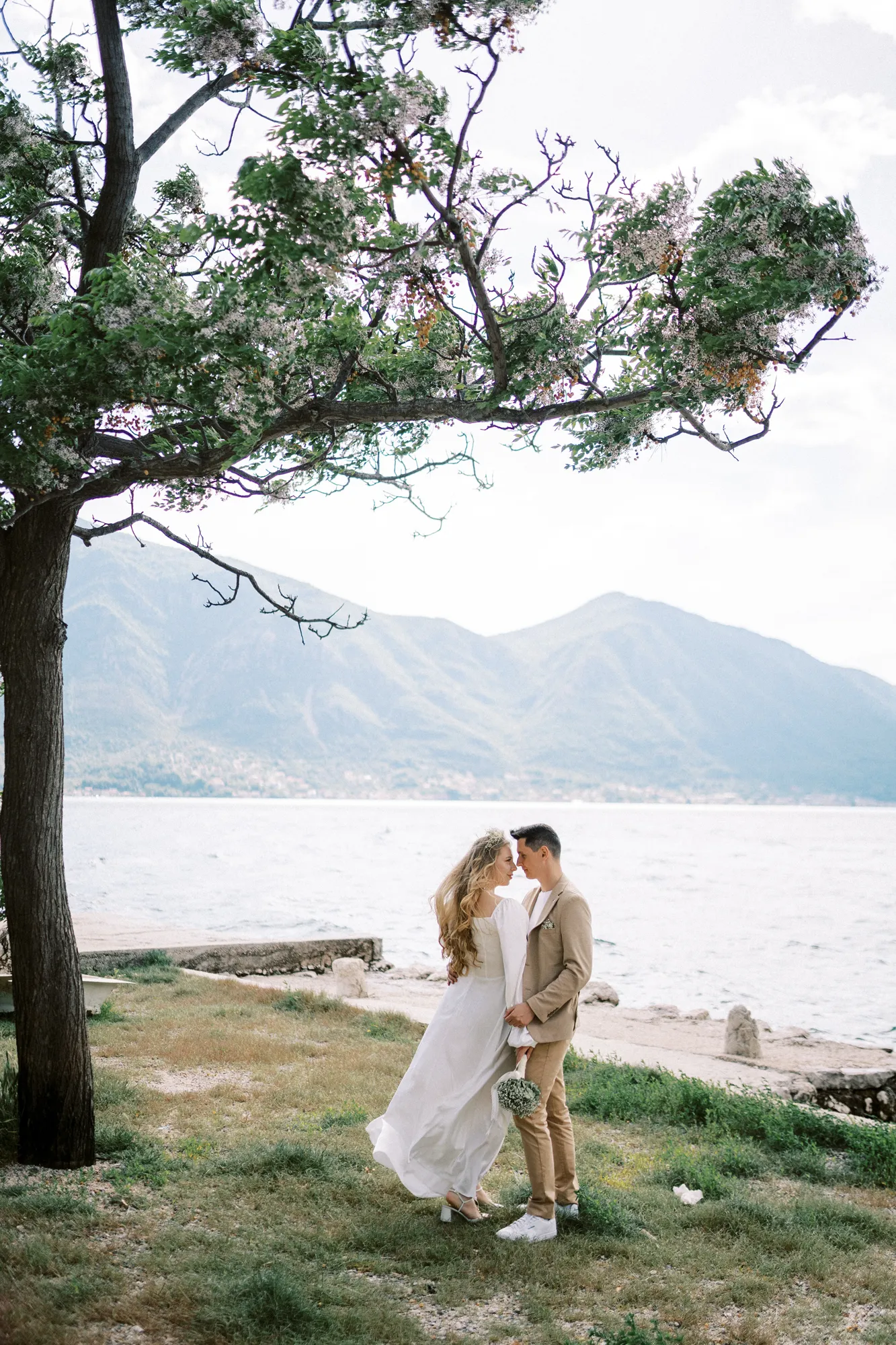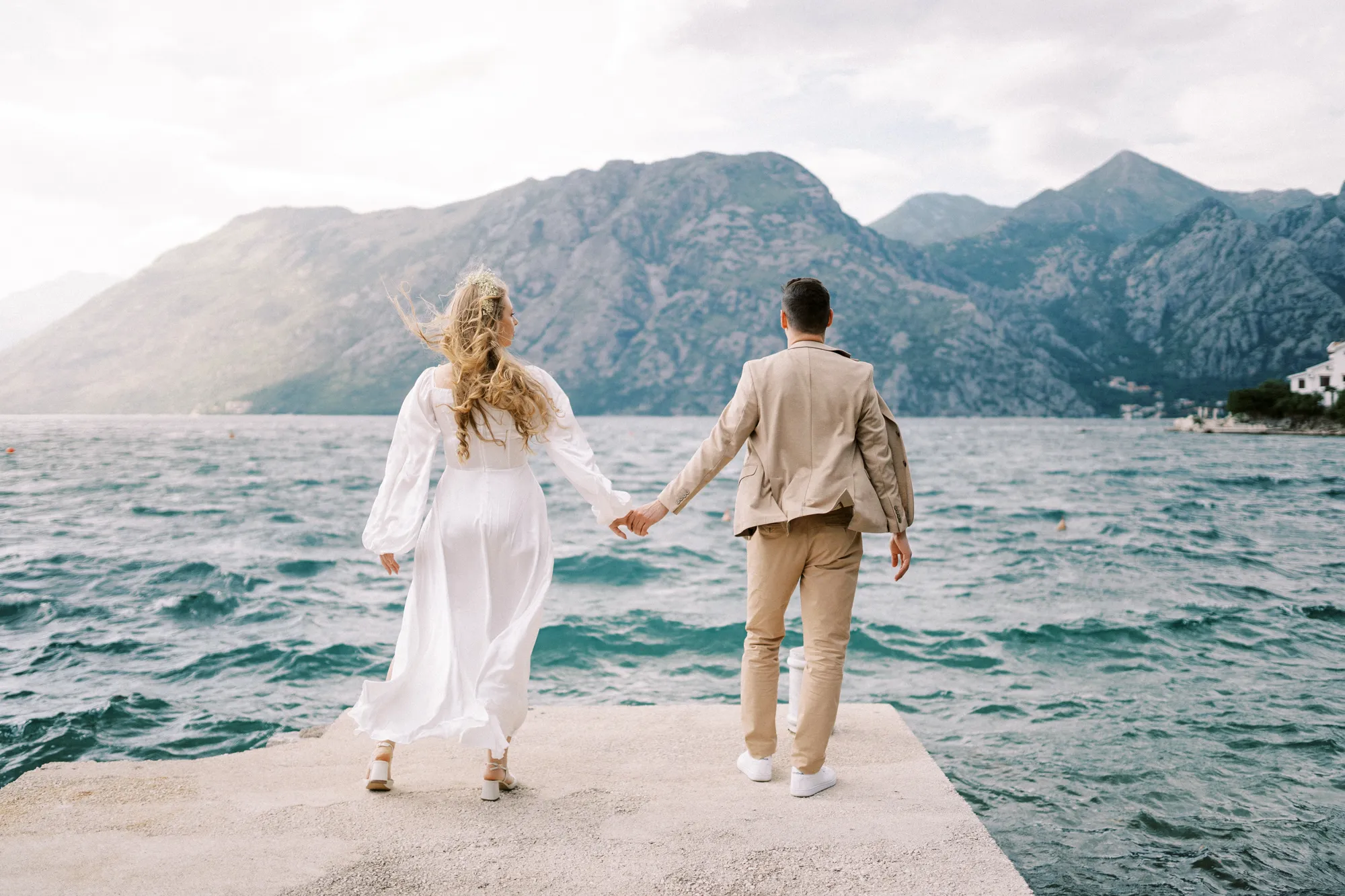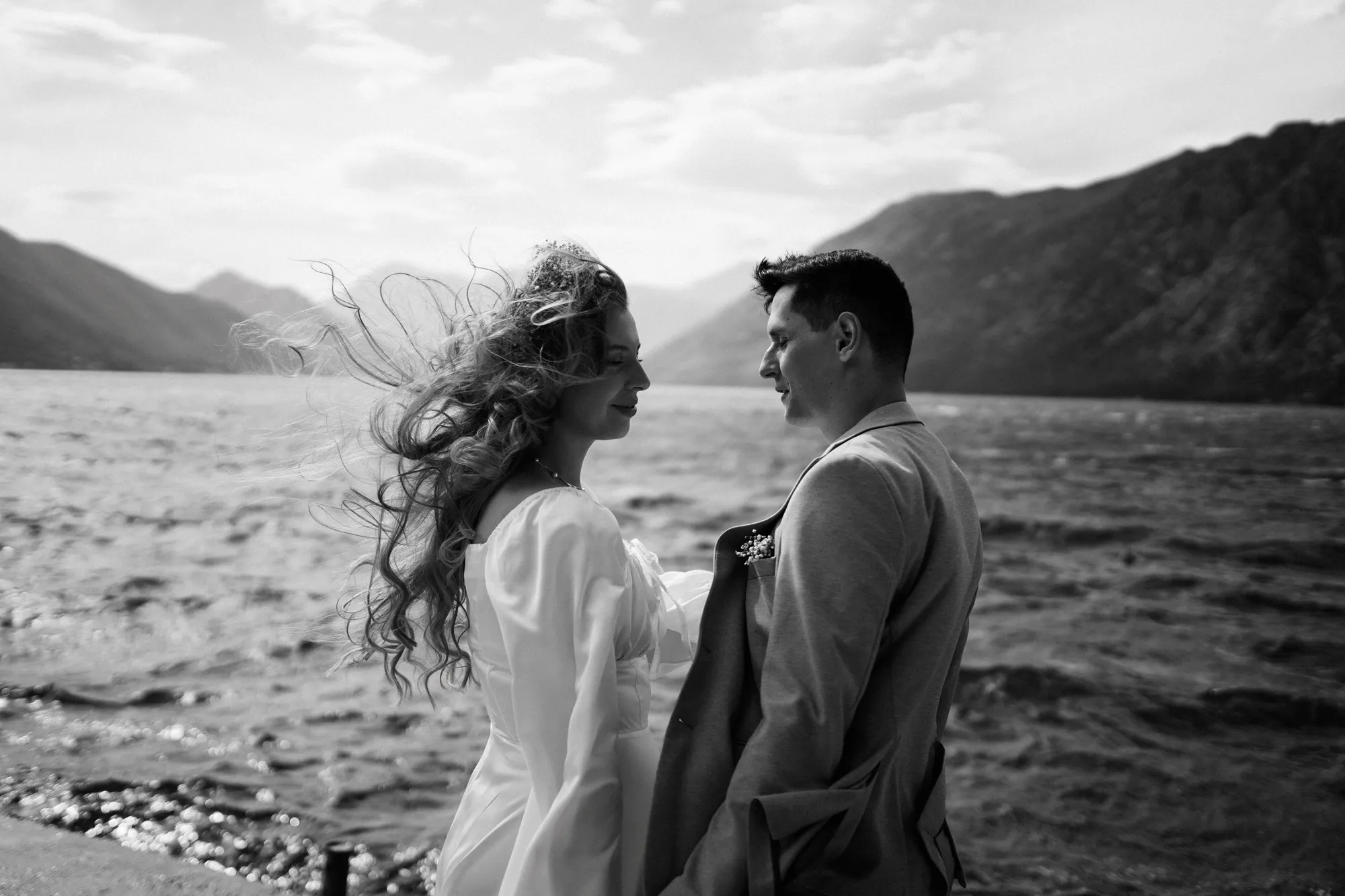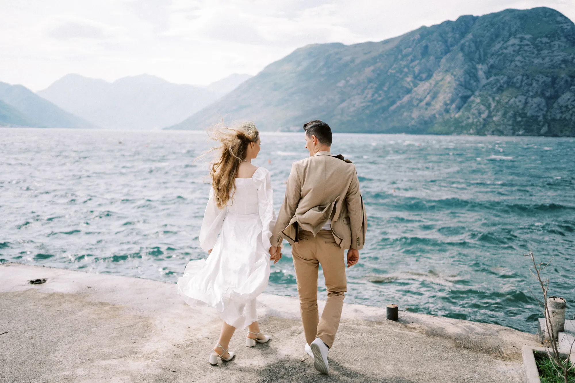 As a wedding photographer in Montenegro, I often shoot in Boka Kotorska Bay, but this windy wedding will stay with me forever. The young couple – he, confident and romantic; she, radiant and tender -met for the first time on a cliff overlooking the bay. Their boat stroll across the waters under gusts of wind was full of sparks: laughter, glances, light touches.