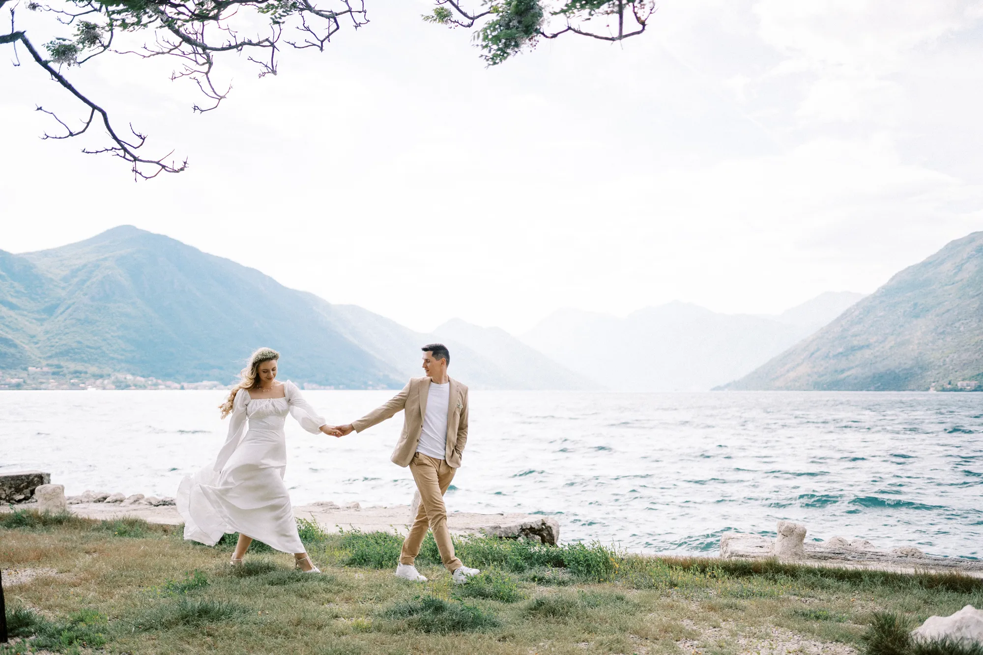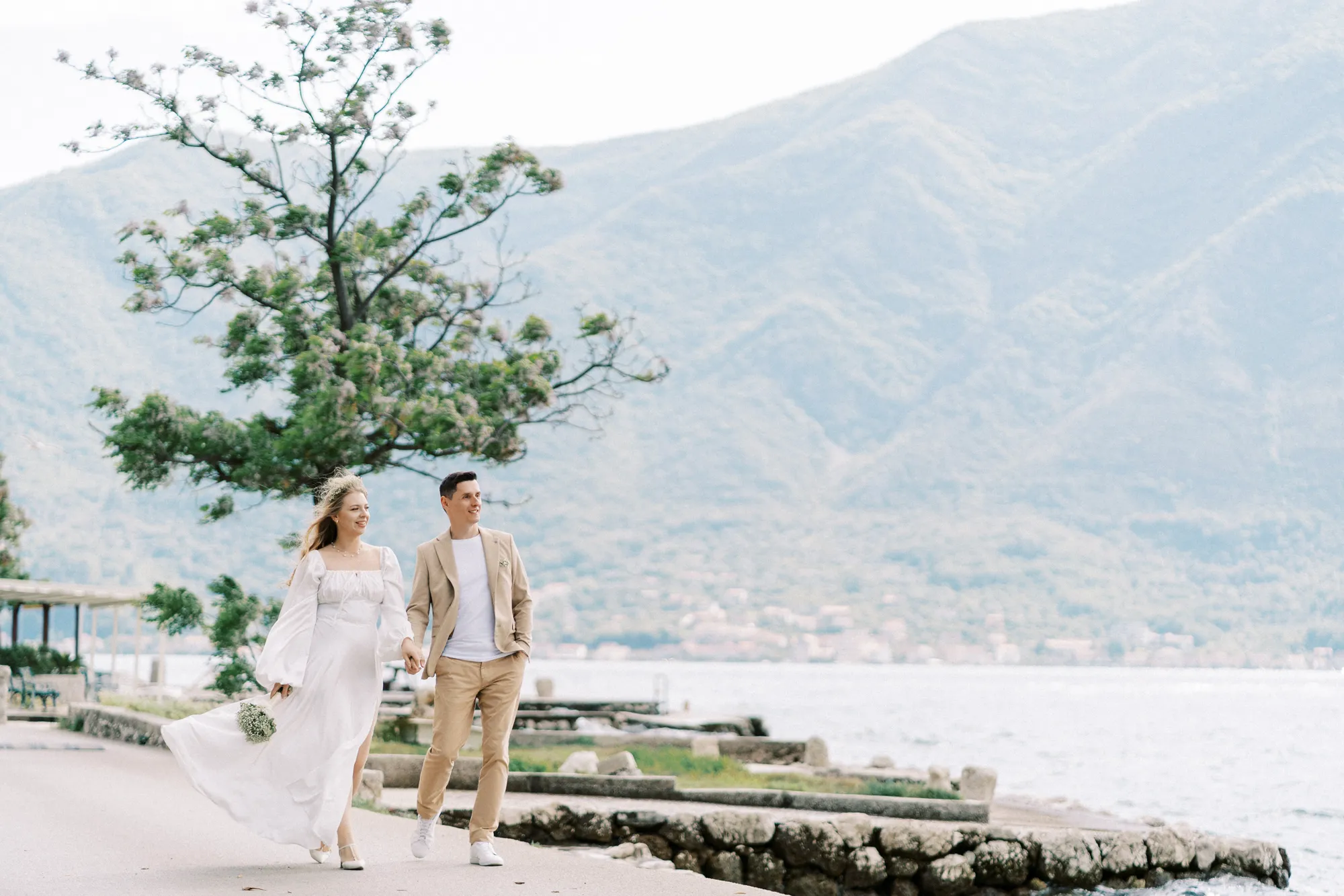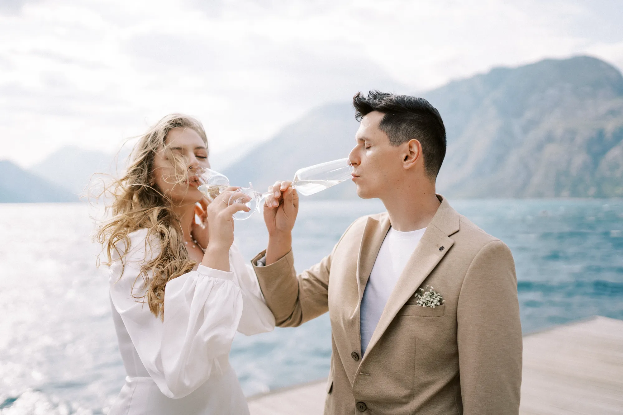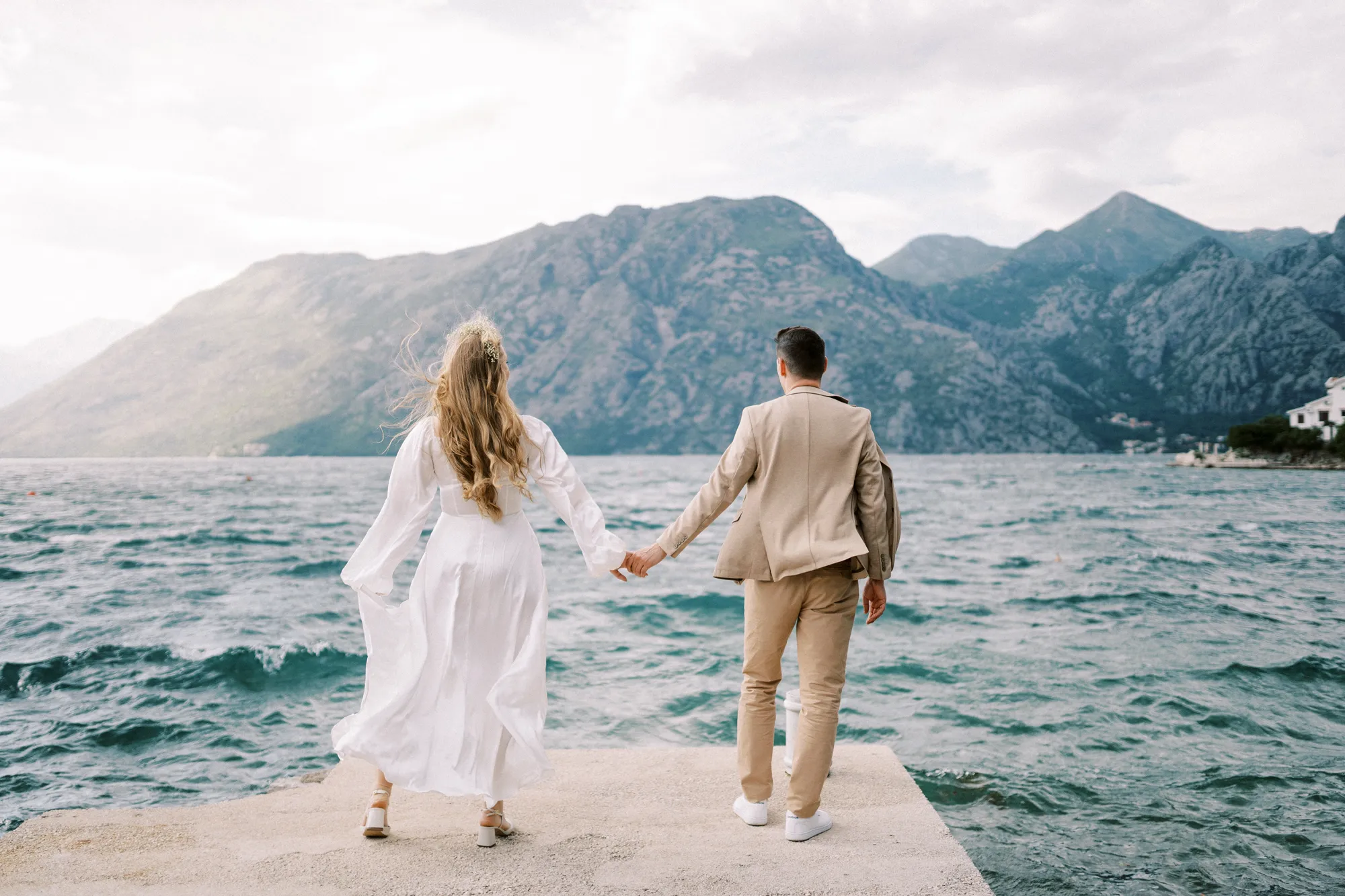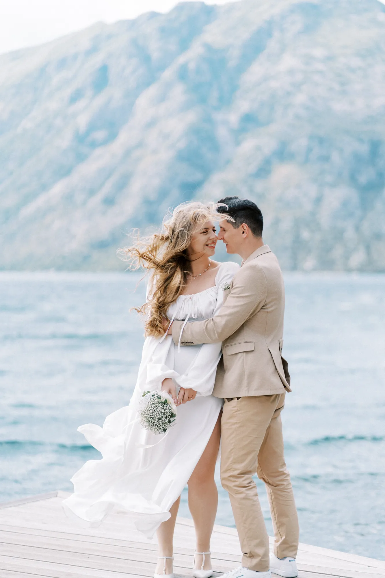 As a wedding photographer in Montenegro, I often shoot in Boka Kotorska Bay, but this windy wedding will stay with me forever. The young couple – he, confident and romantic; she, radiant and tender -met for the first time on a cliff overlooking the bay. Their boat stroll across the waters under gusts of wind was full of sparks: laughter, glances, light touches.