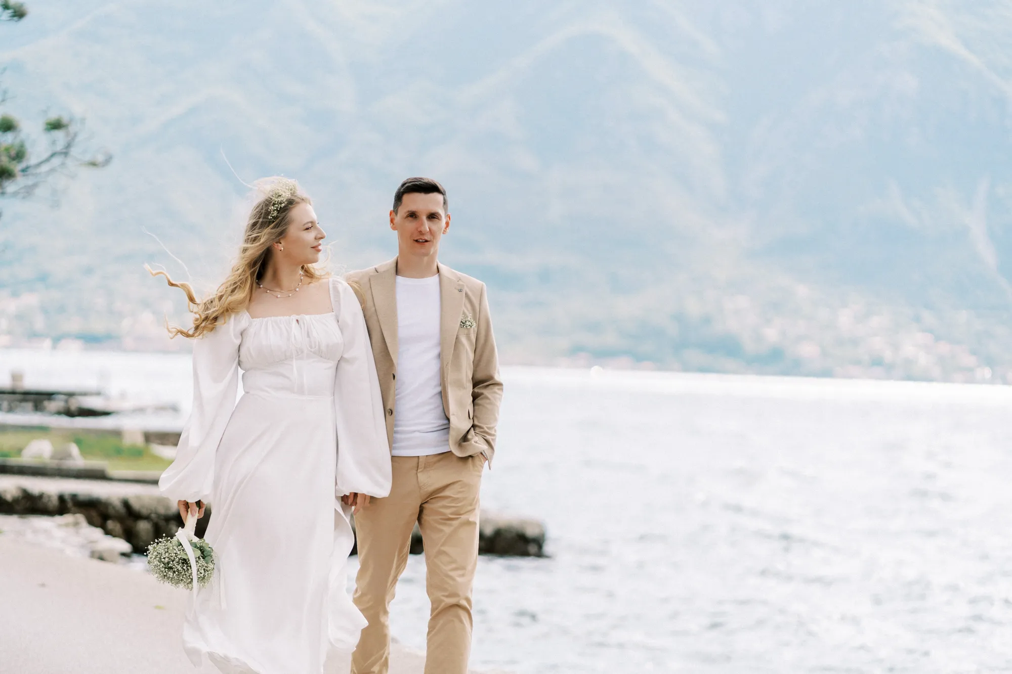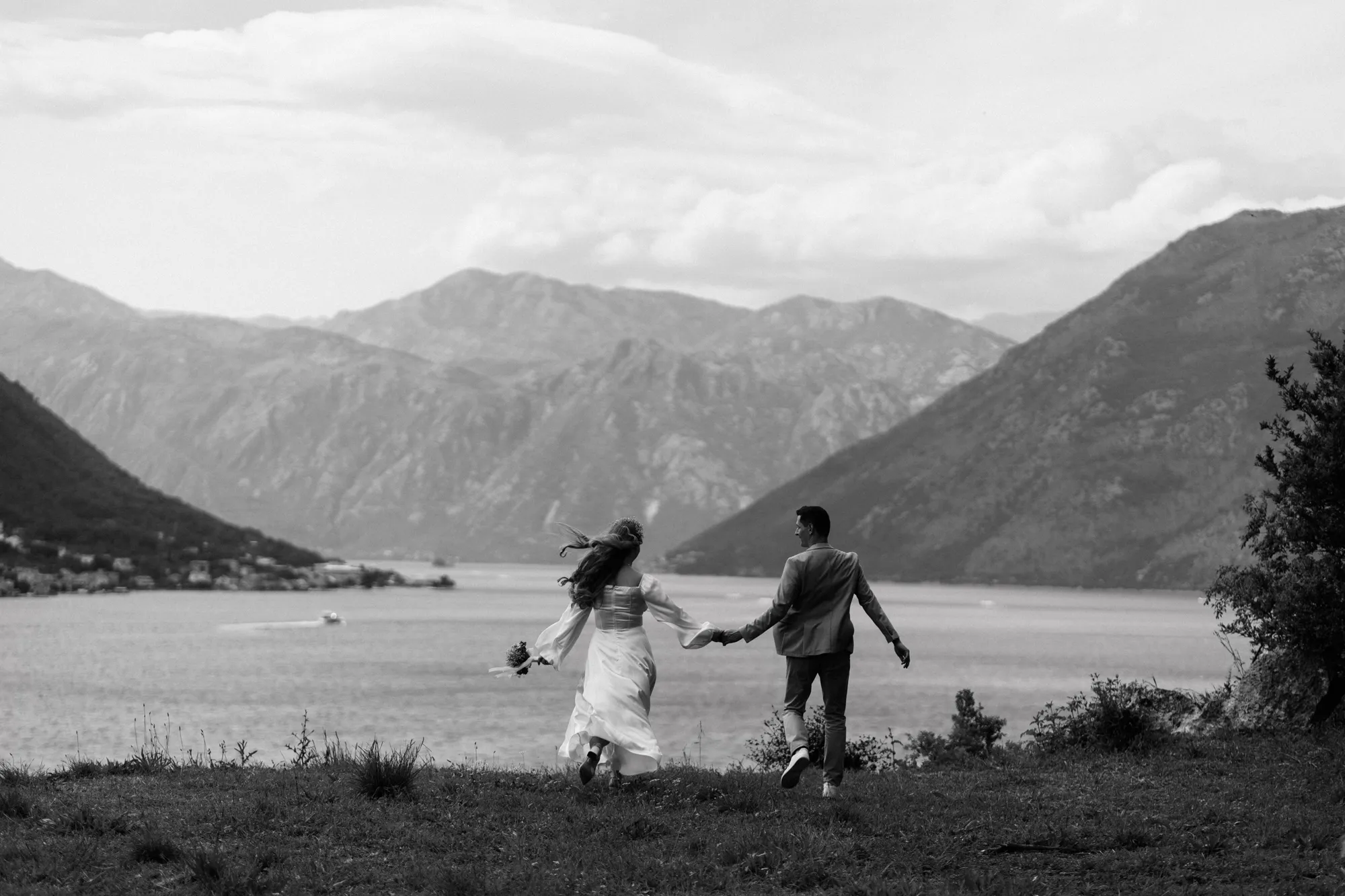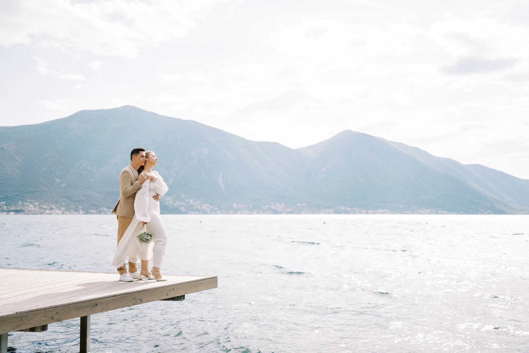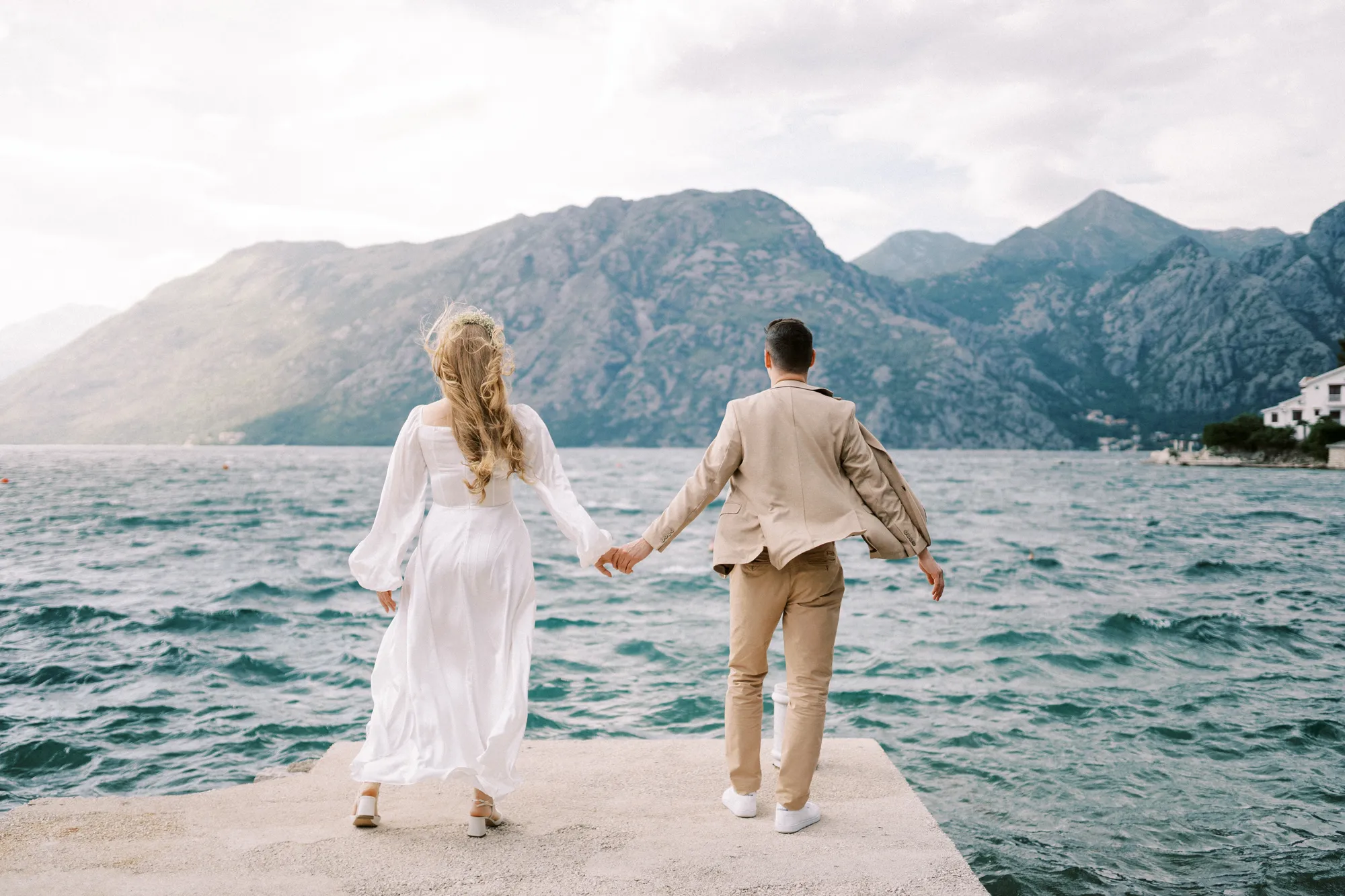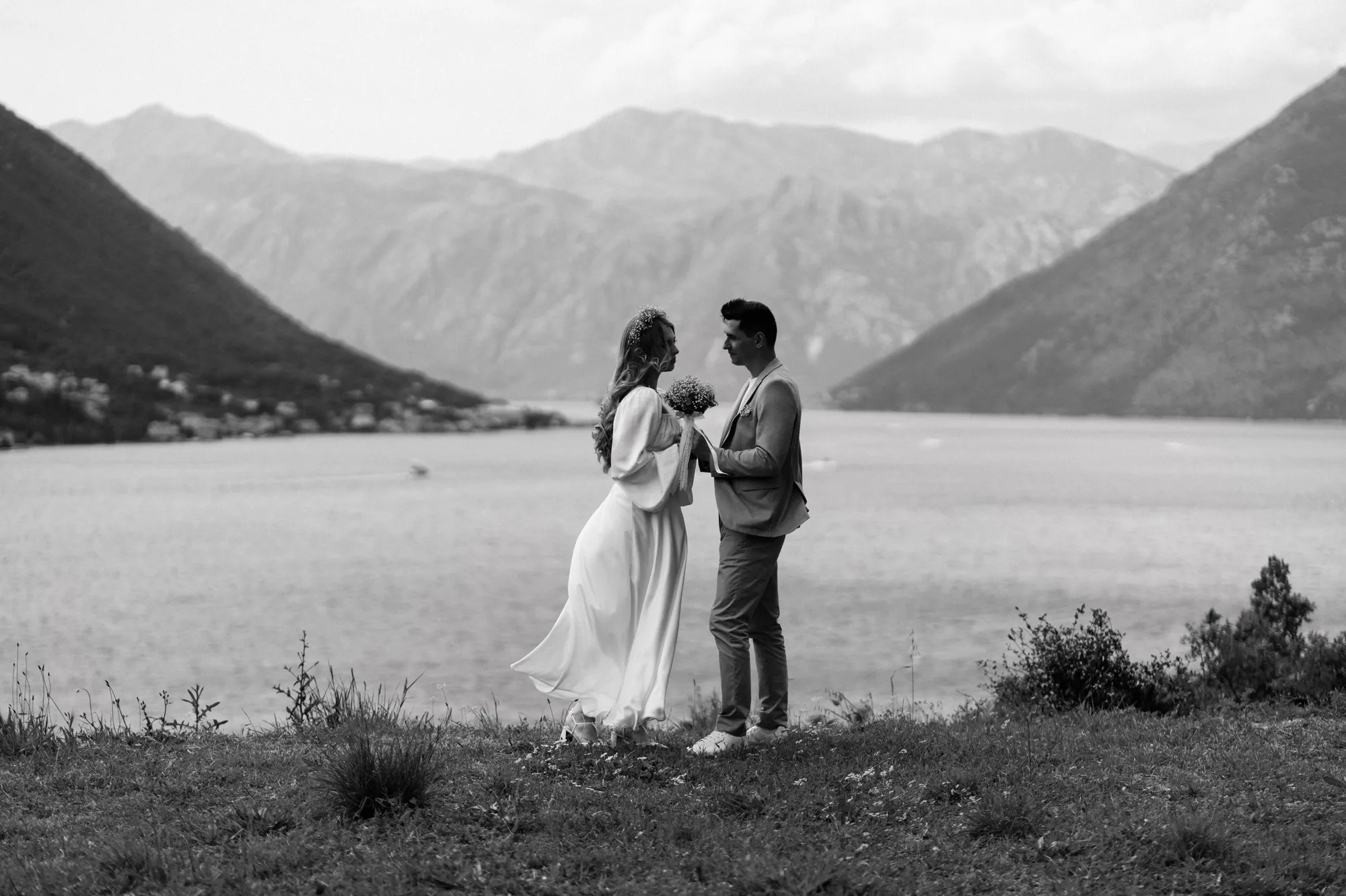 As a wedding photographer in Montenegro, I often shoot in Boka Kotorska Bay, but this windy wedding will stay with me forever. The young couple – he, confident and romantic; she, radiant and tender -met for the first time on a cliff overlooking the bay. Their boat stroll across the waters under gusts of wind was full of sparks: laughter, glances, light touches.