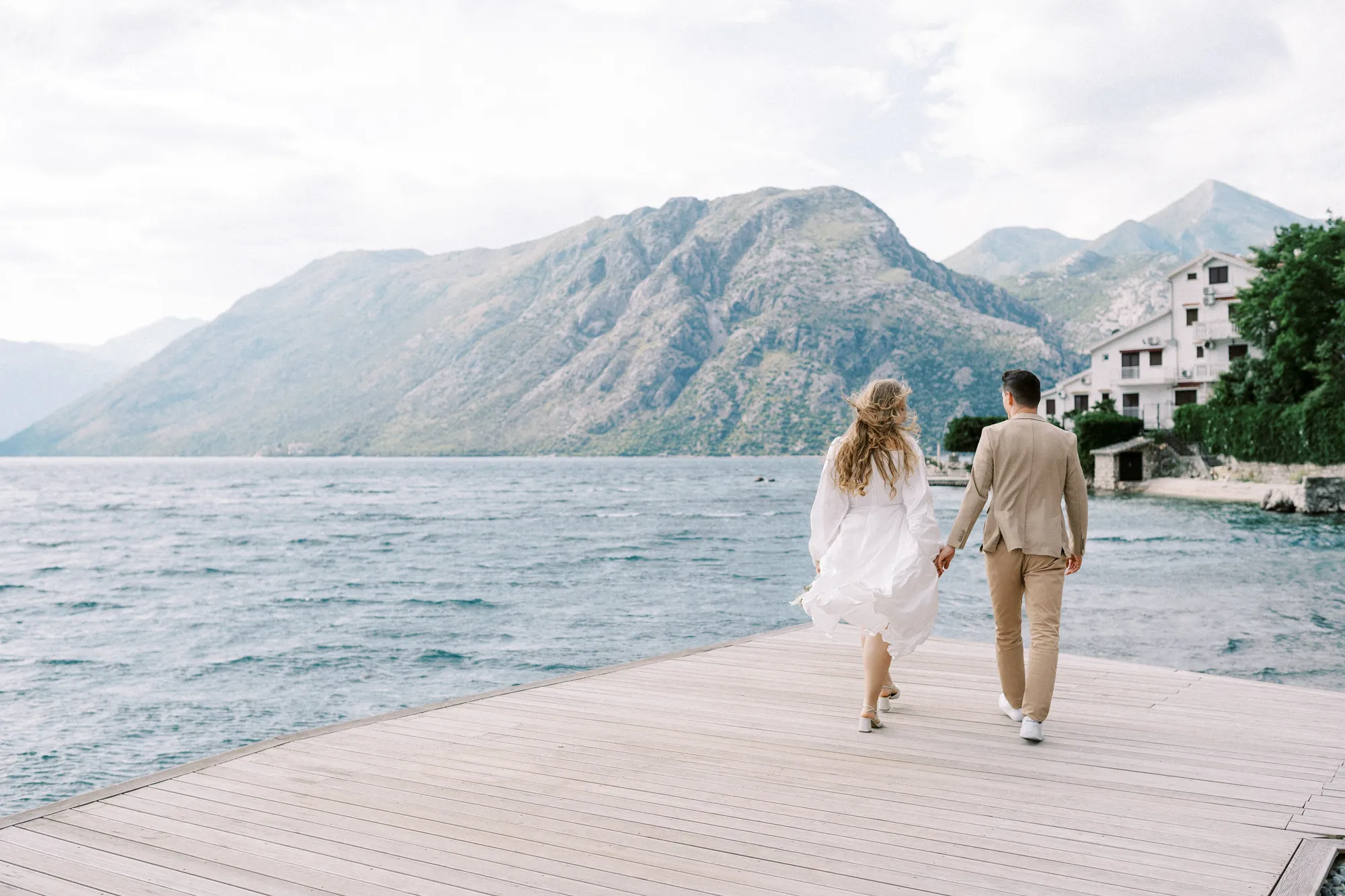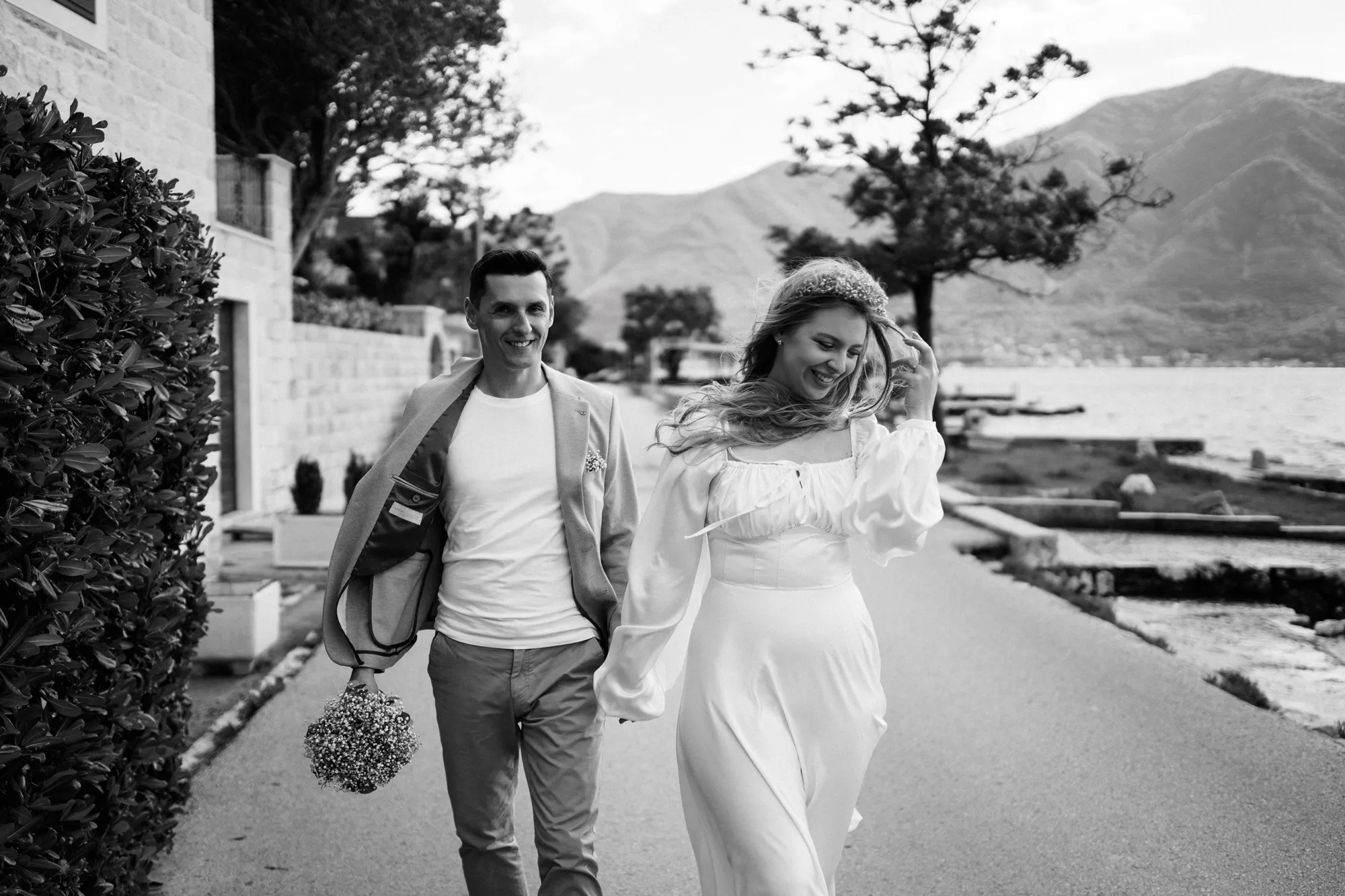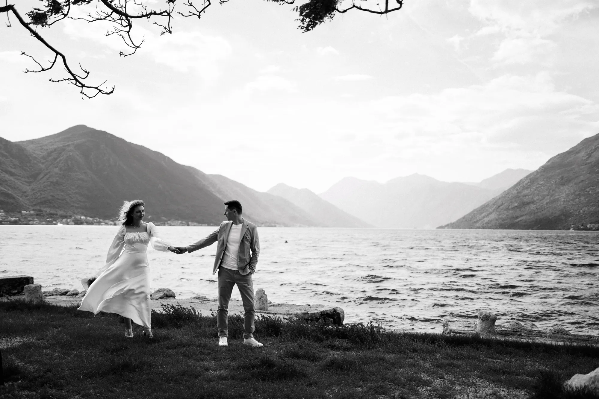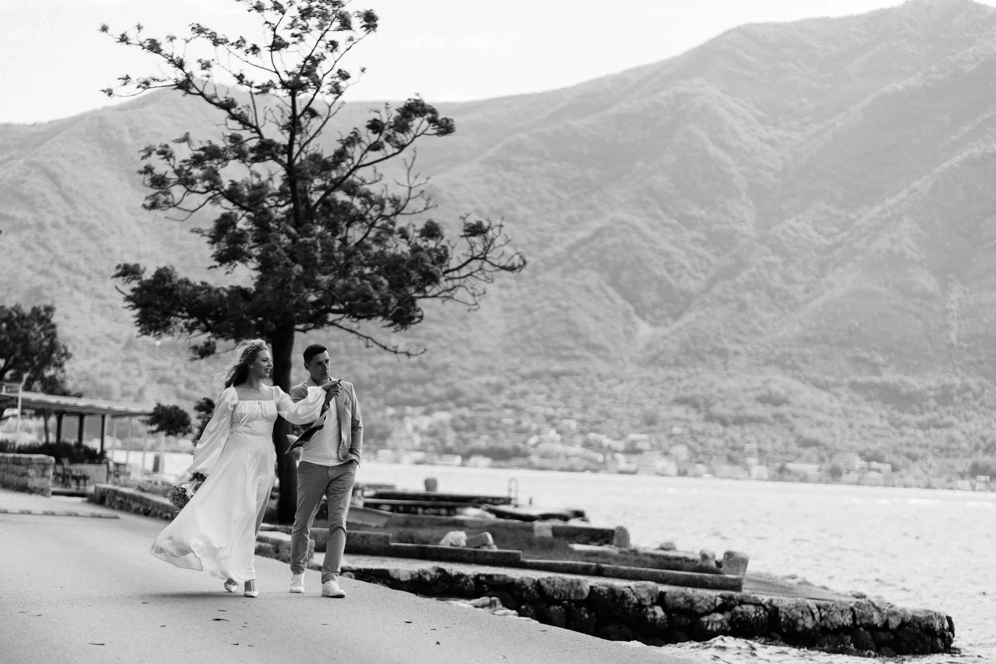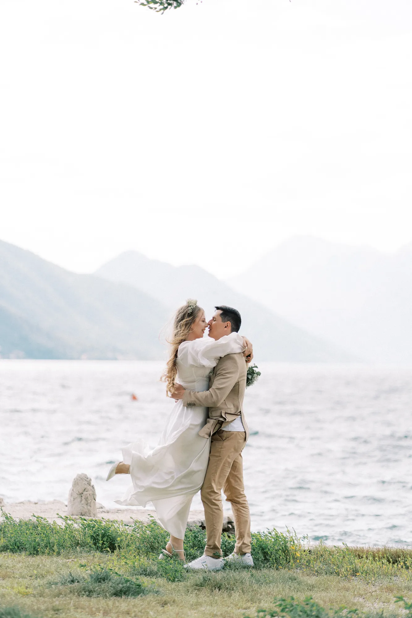 As a wedding photographer in Montenegro, I often shoot in Boka Kotorska Bay, but this windy wedding will stay with me forever. The young couple – he, confident and romantic; she, radiant and tender -met for the first time on a cliff overlooking the bay. Their boat stroll across the waters under gusts of wind was full of sparks: laughter, glances, light touches.