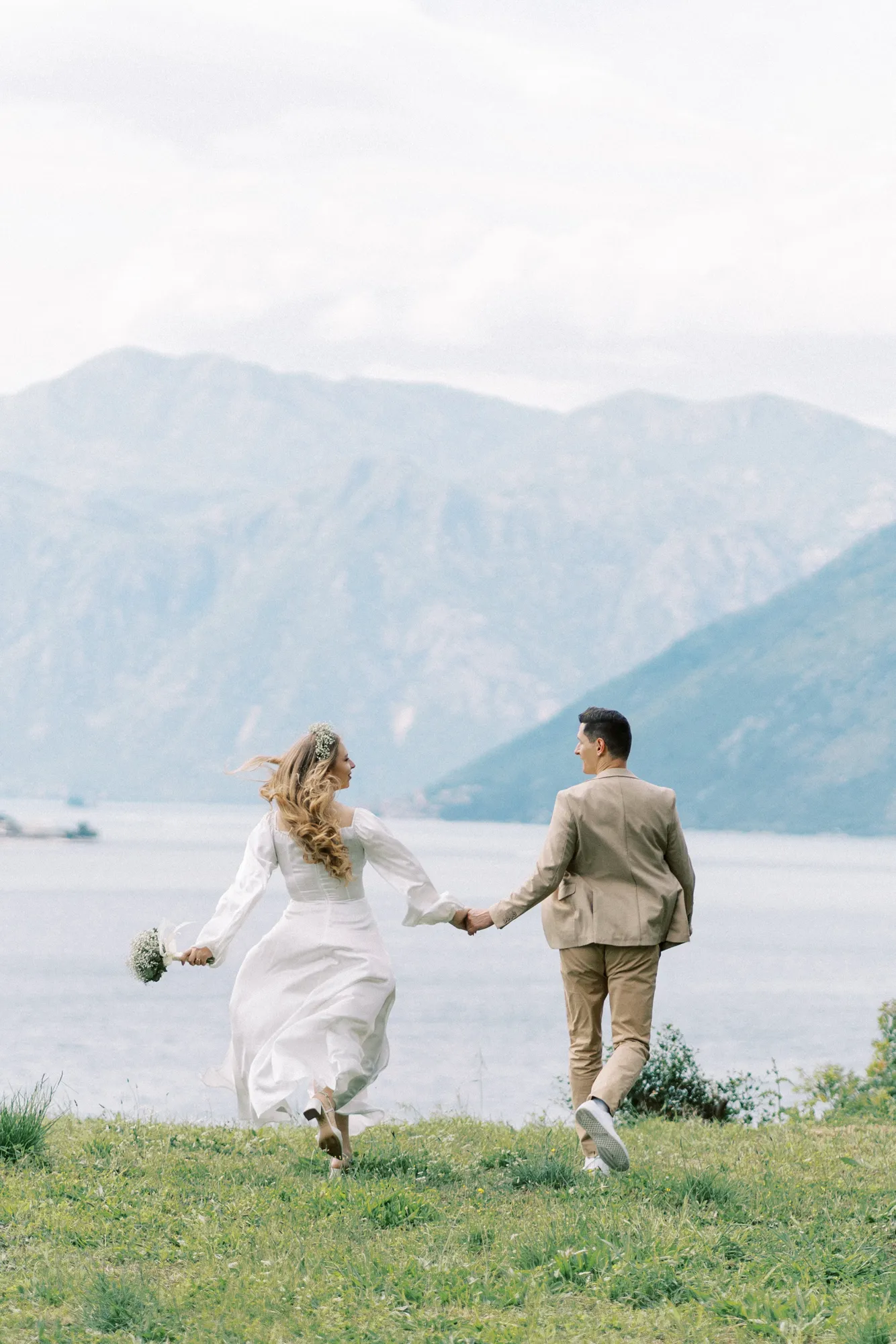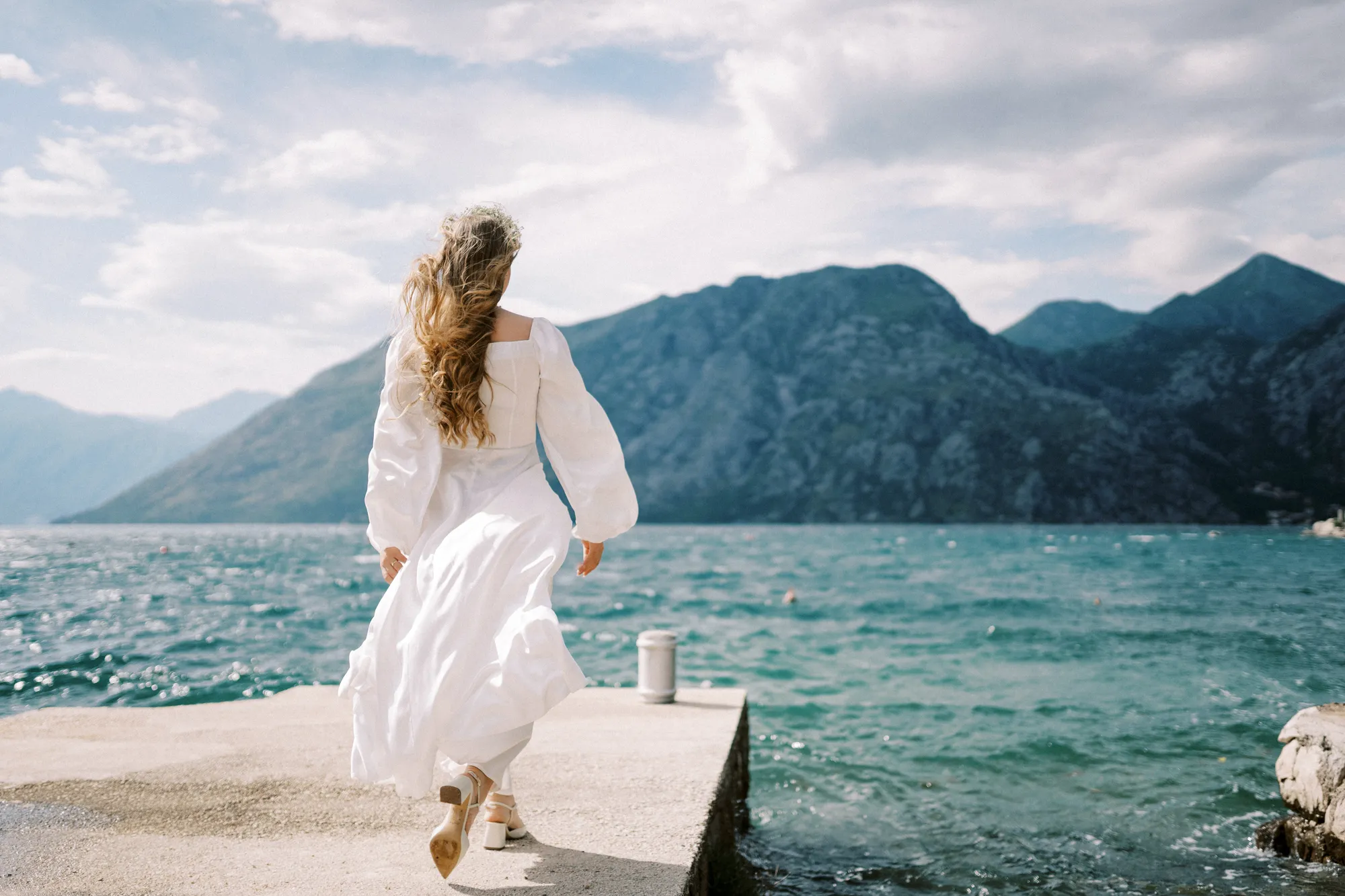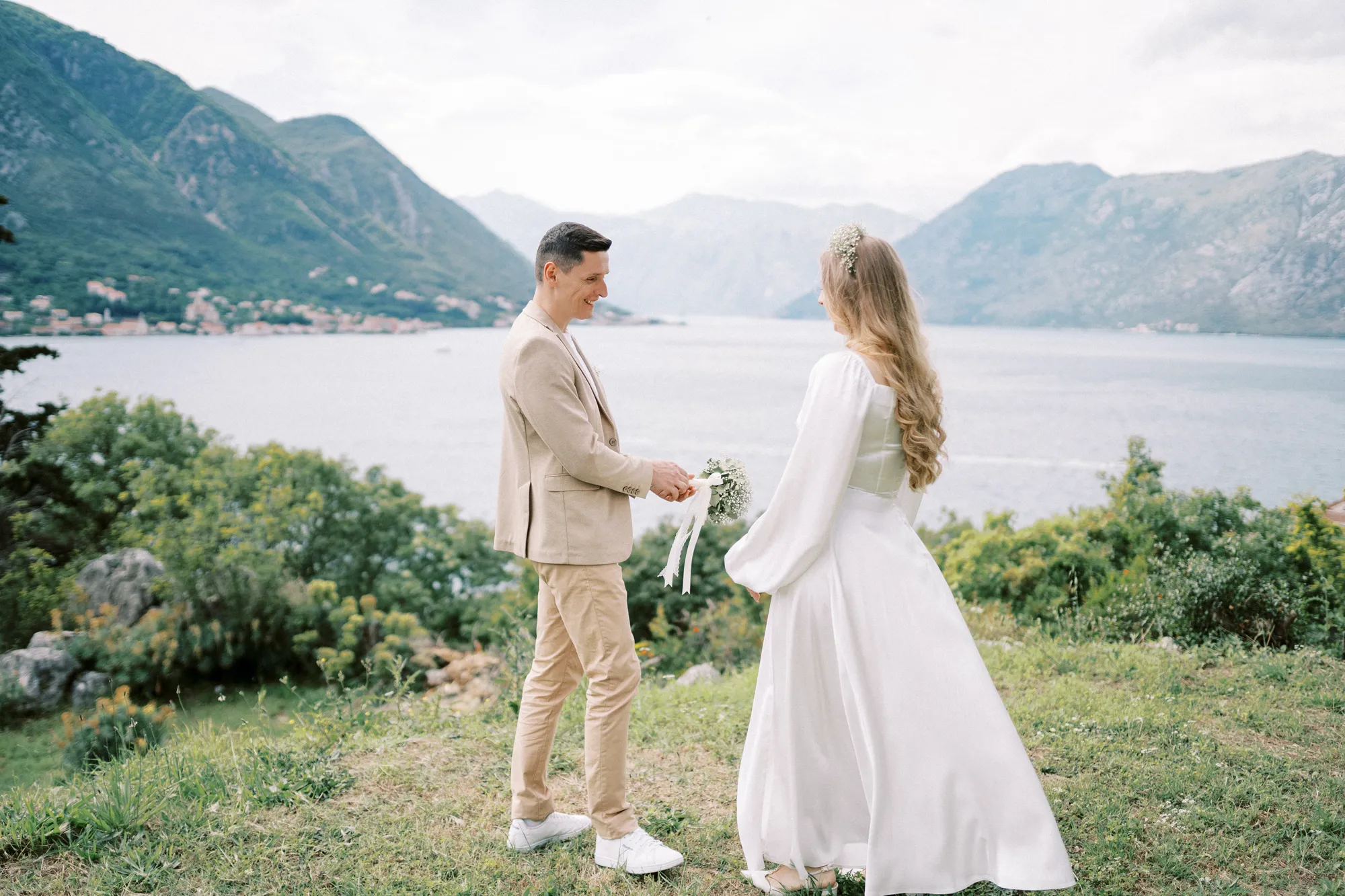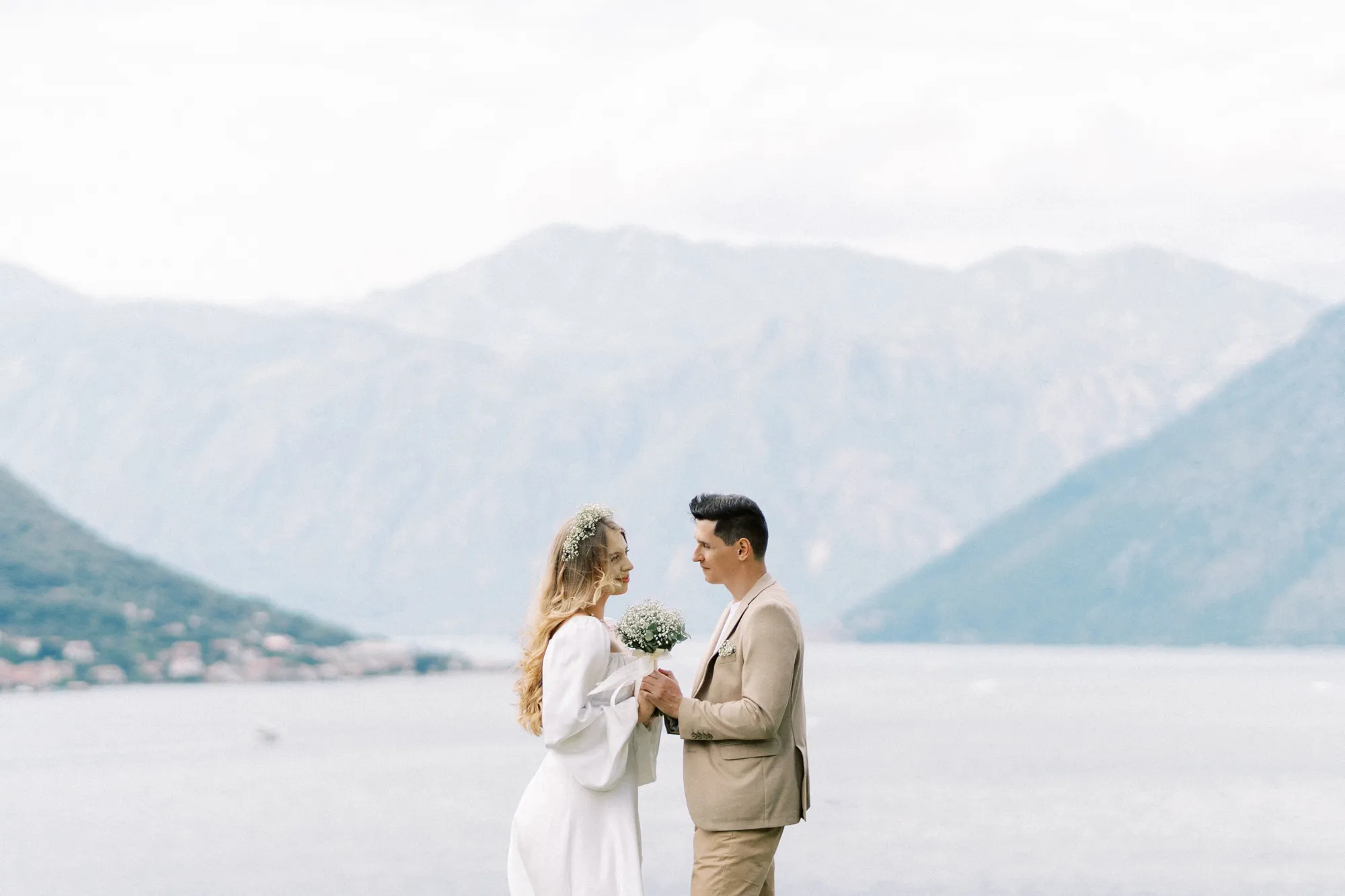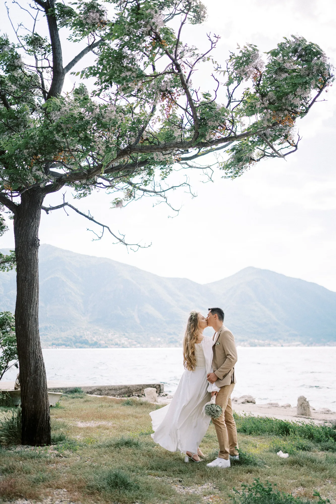As a wedding photographer in Montenegro, I often shoot in Boka Kotorska Bay, but this windy wedding will stay with me forever. The young couple – he, confident and romantic; she, radiant and tender -met for the first time on a cliff overlooking the bay. Their boat stroll across the waters under gusts of wind was full of sparks: laughter, glances, light touches.