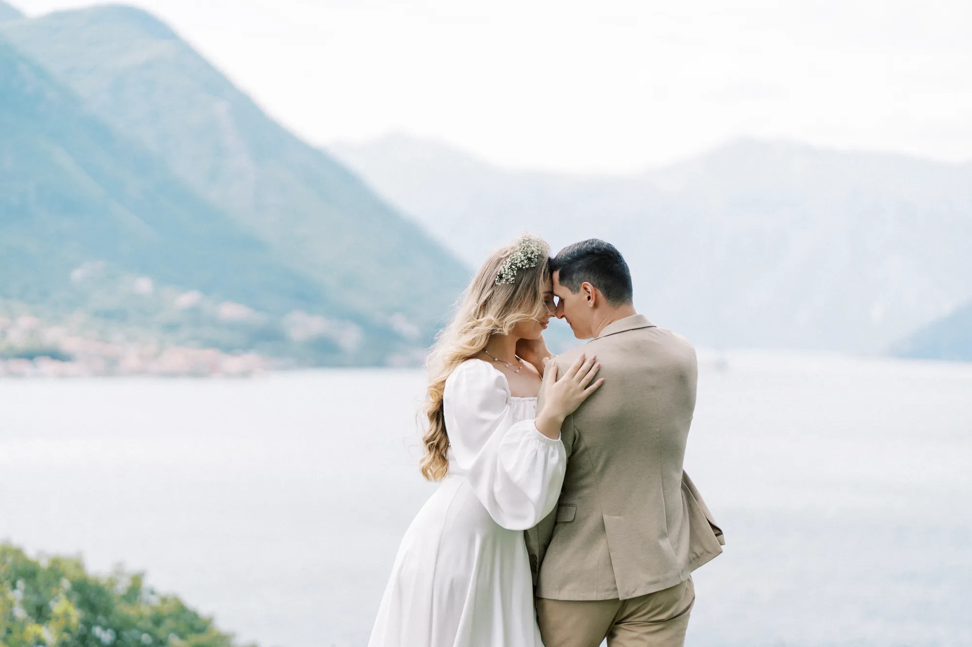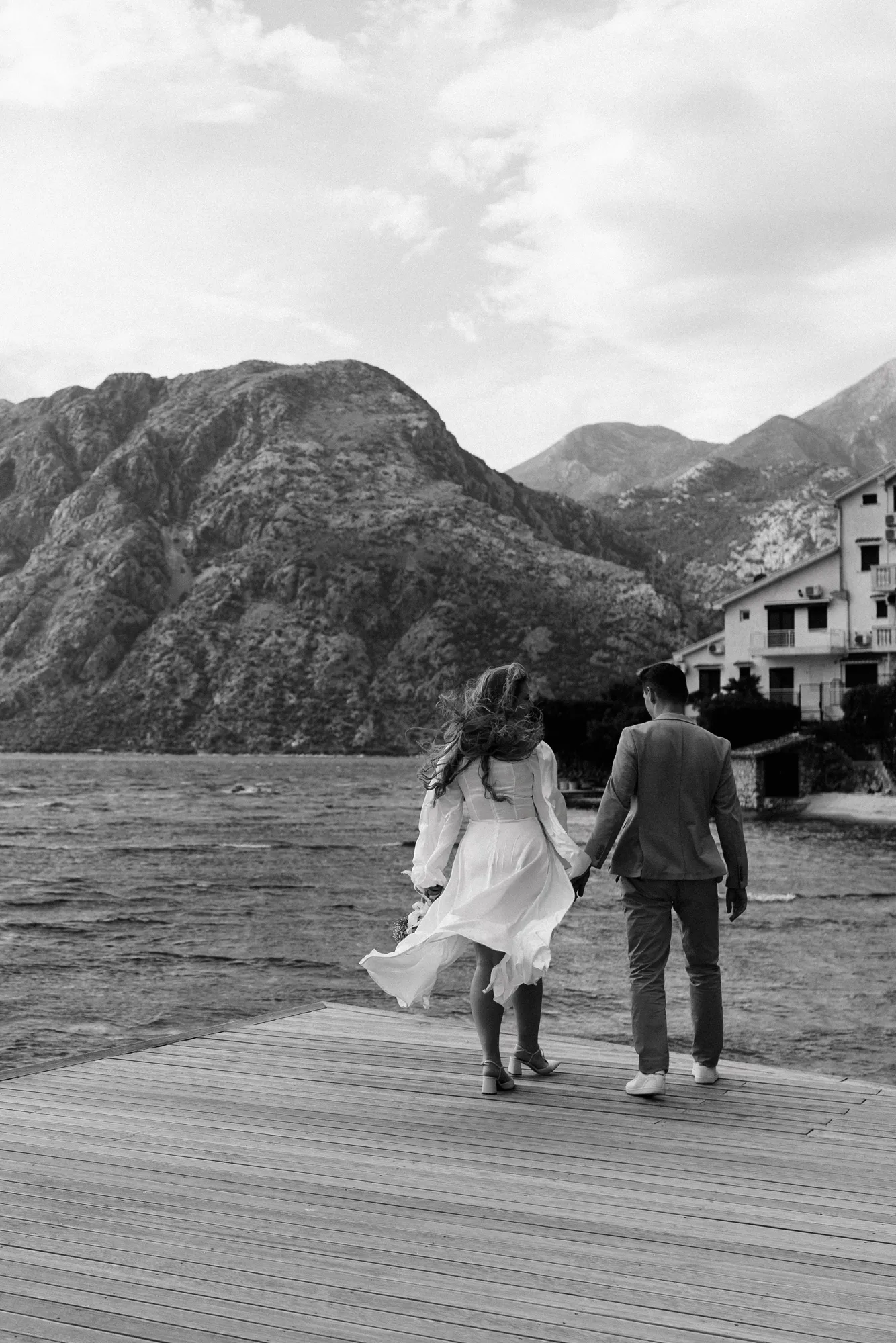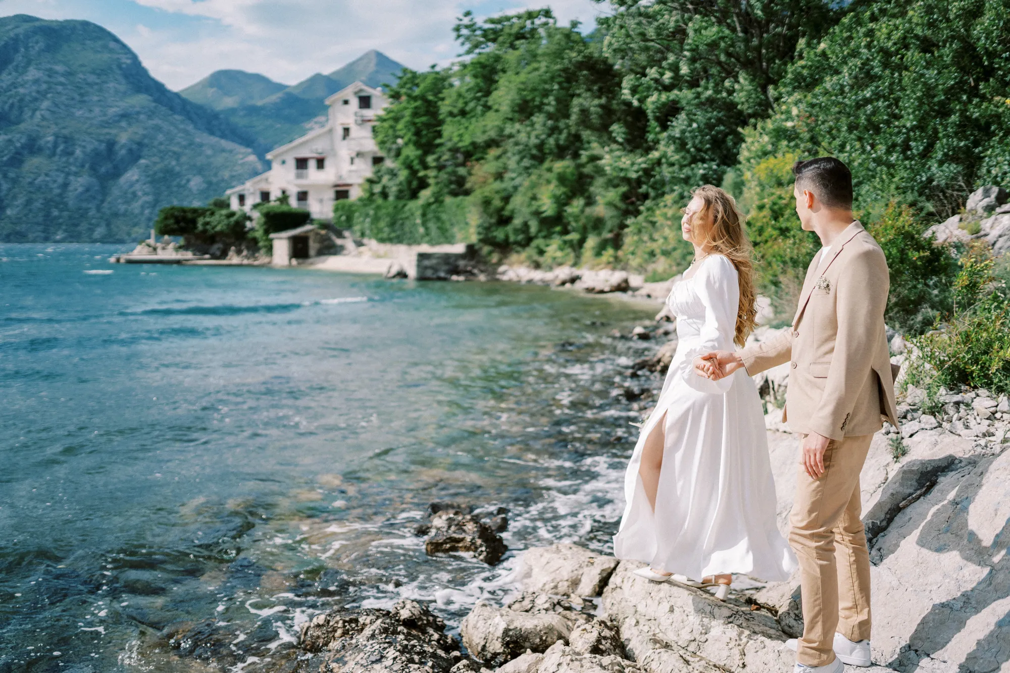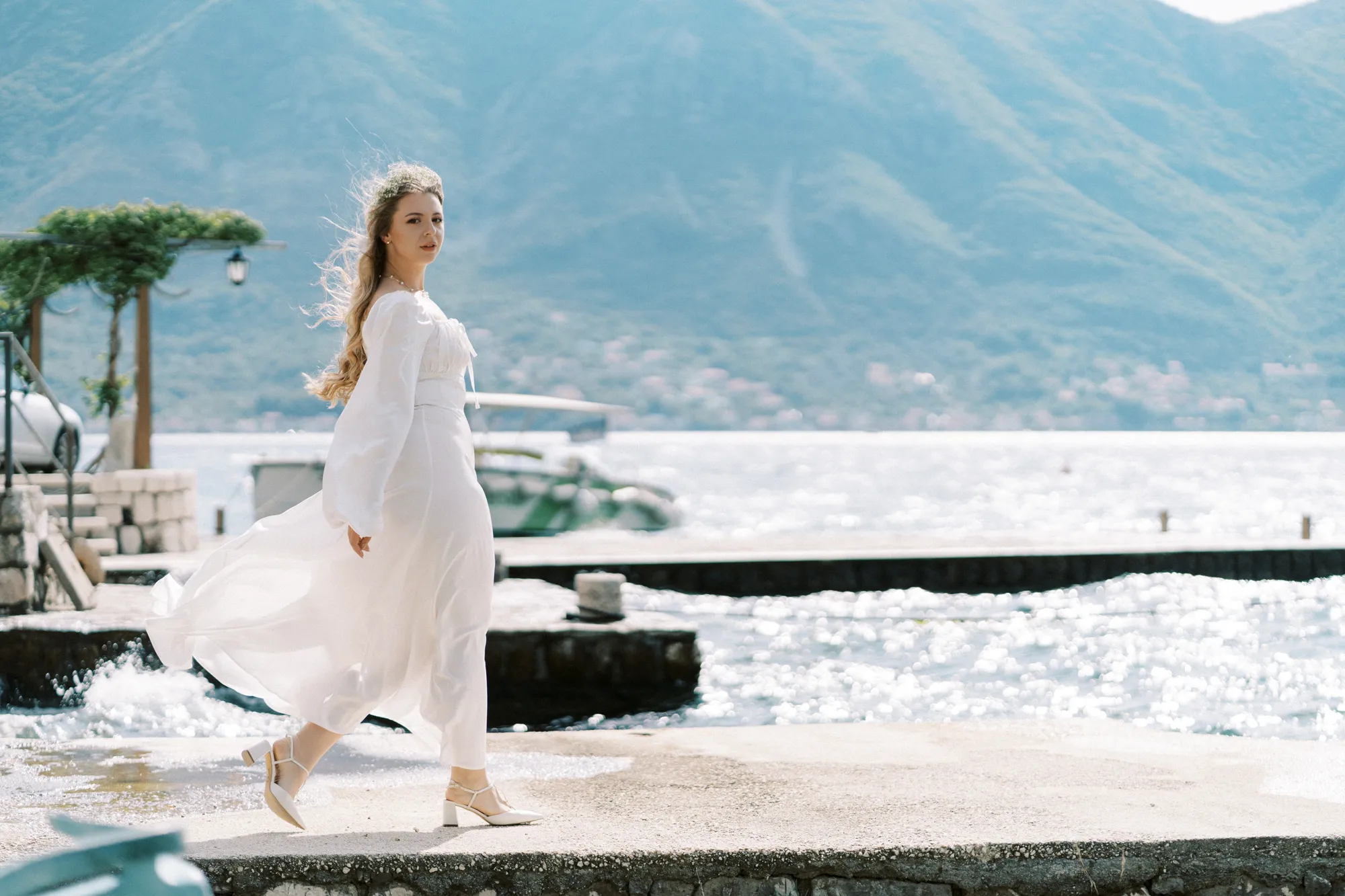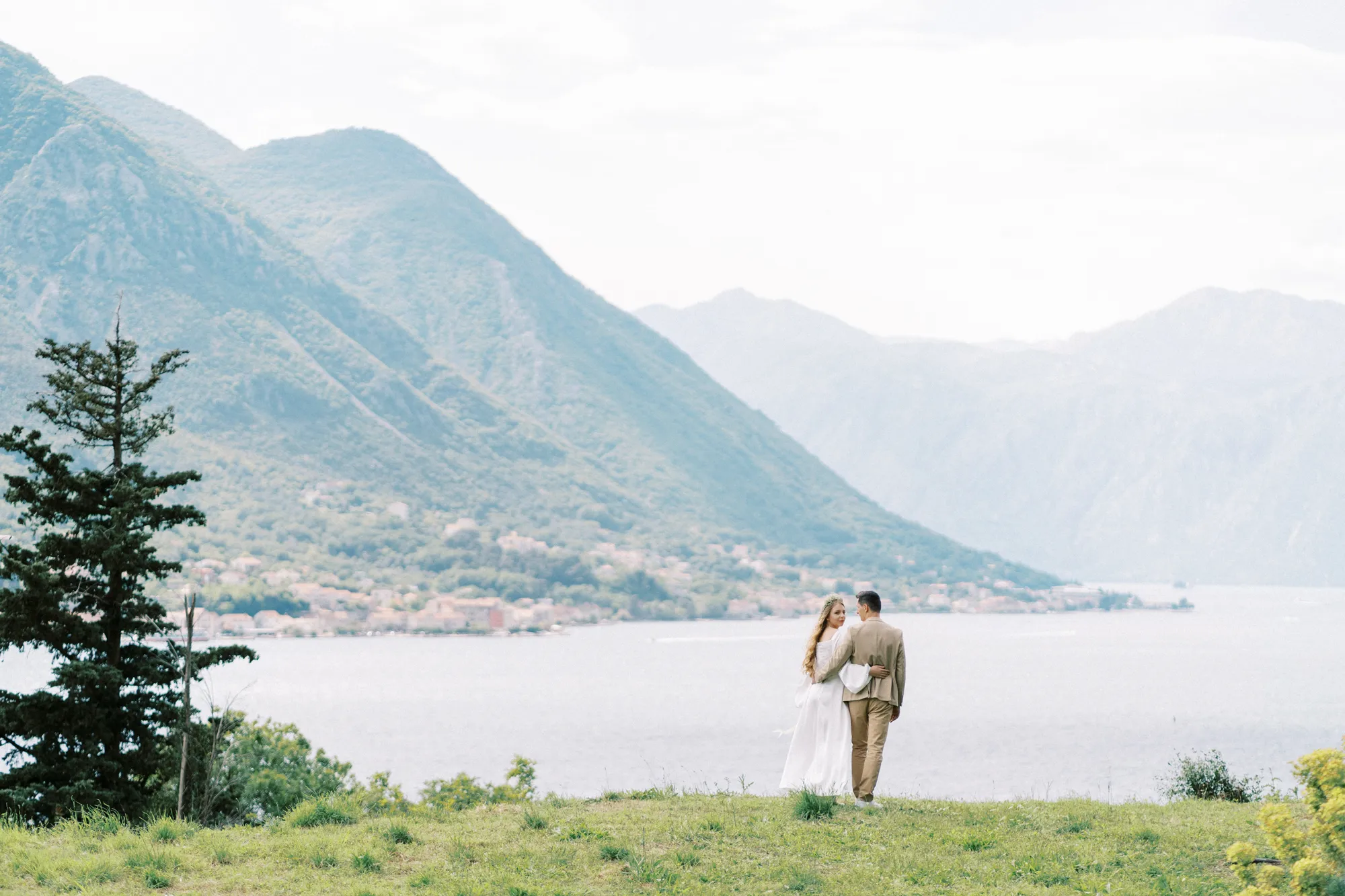 As a wedding photographer in Montenegro, I often shoot in Boka Kotorska Bay, but this windy wedding will stay with me forever. The young couple – he, confident and romantic; she, radiant and tender -met for the first time on a cliff overlooking the bay. Their boat stroll across the waters under gusts of wind was full of sparks: laughter, glances, light touches.