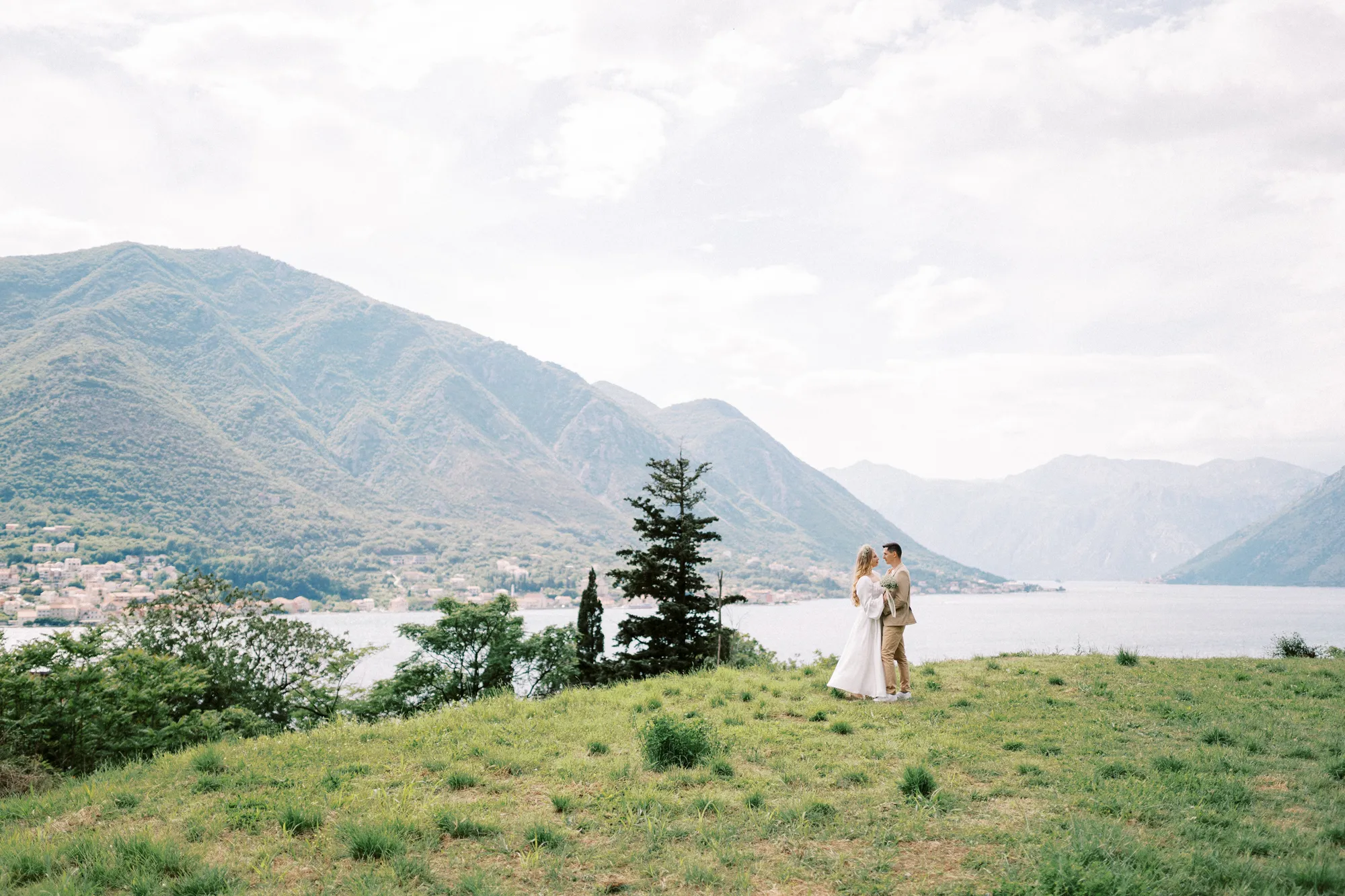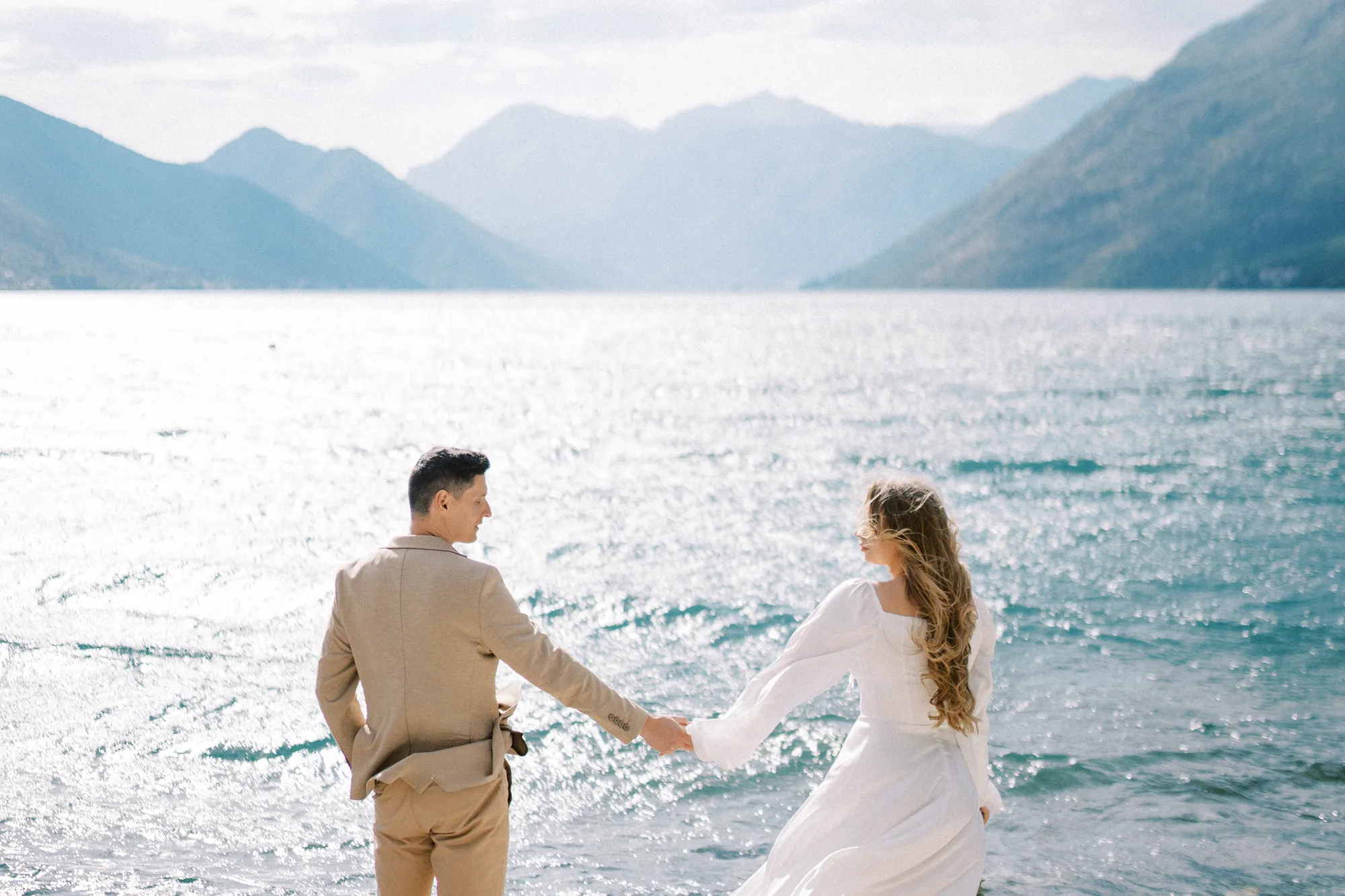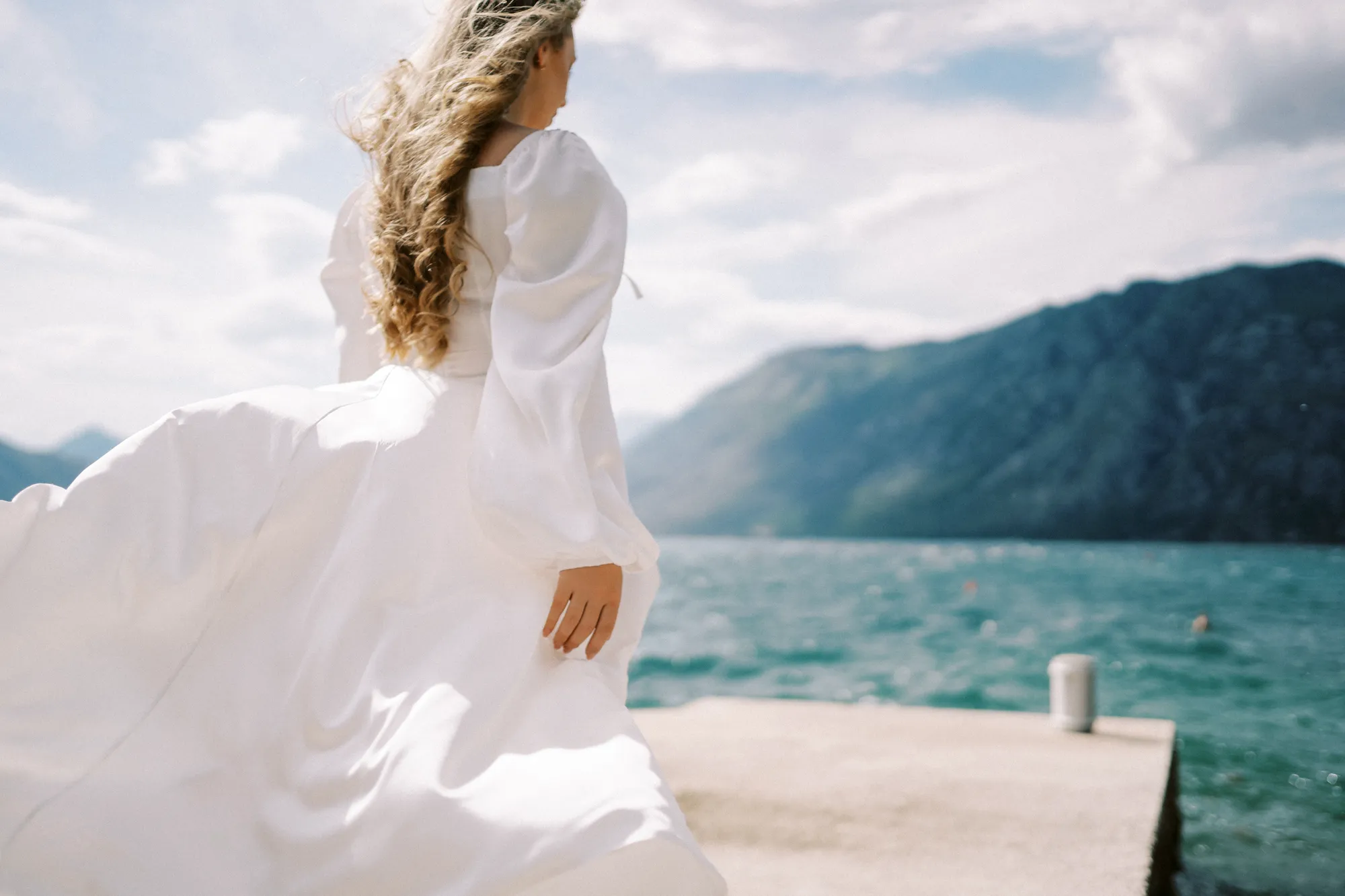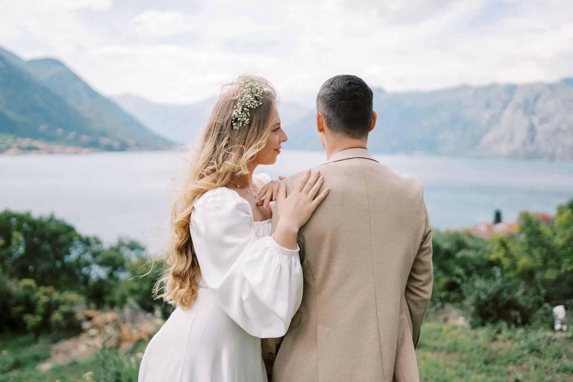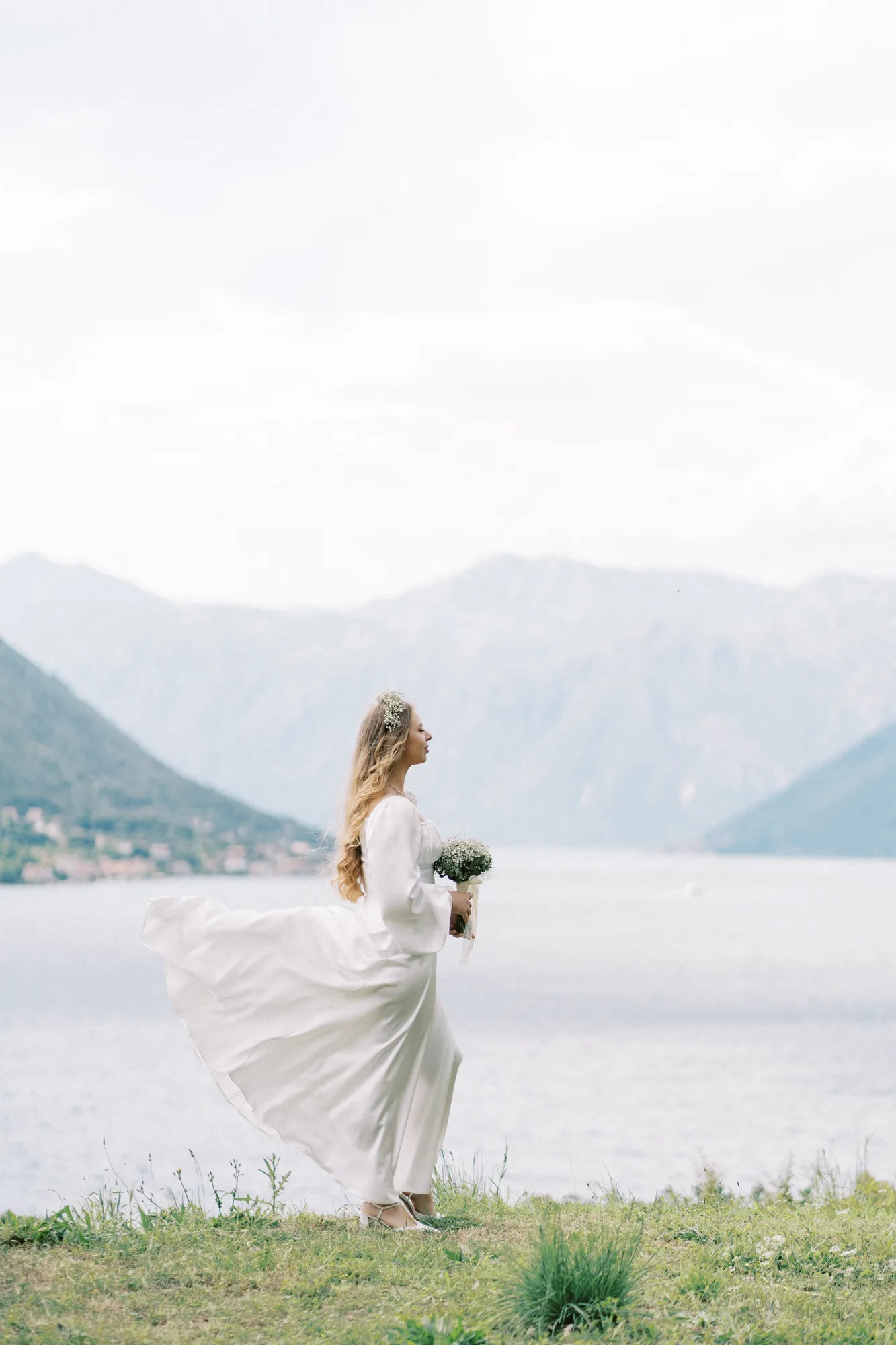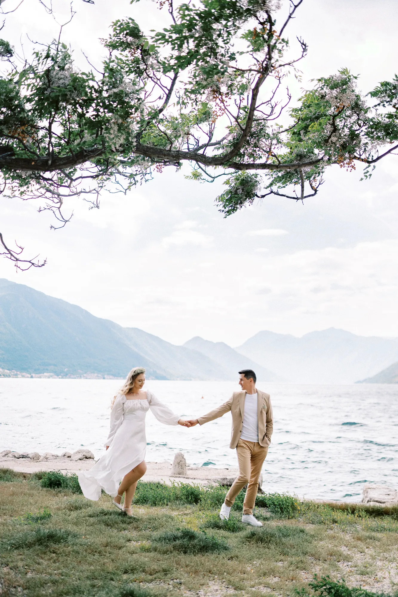 As a wedding photographer in Montenegro, I often shoot in Boka Kotorska Bay, but this windy wedding will stay with me forever. The young couple – he, confident and romantic; she, radiant and tender -met for the first time on a cliff overlooking the bay. Their boat stroll across the waters under gusts of wind was full of sparks: laughter, glances, light touches.
