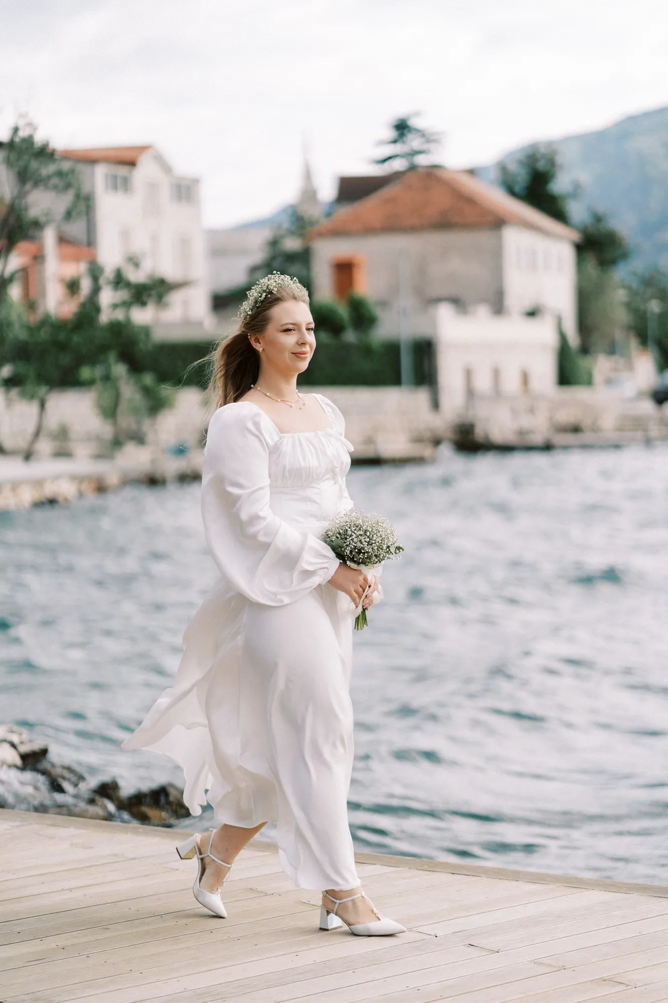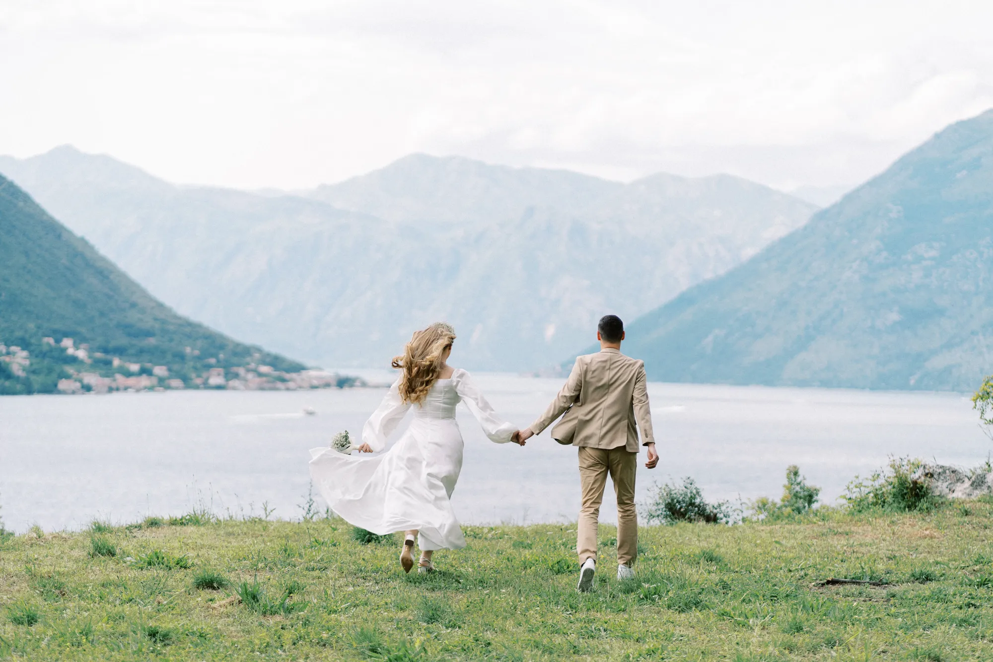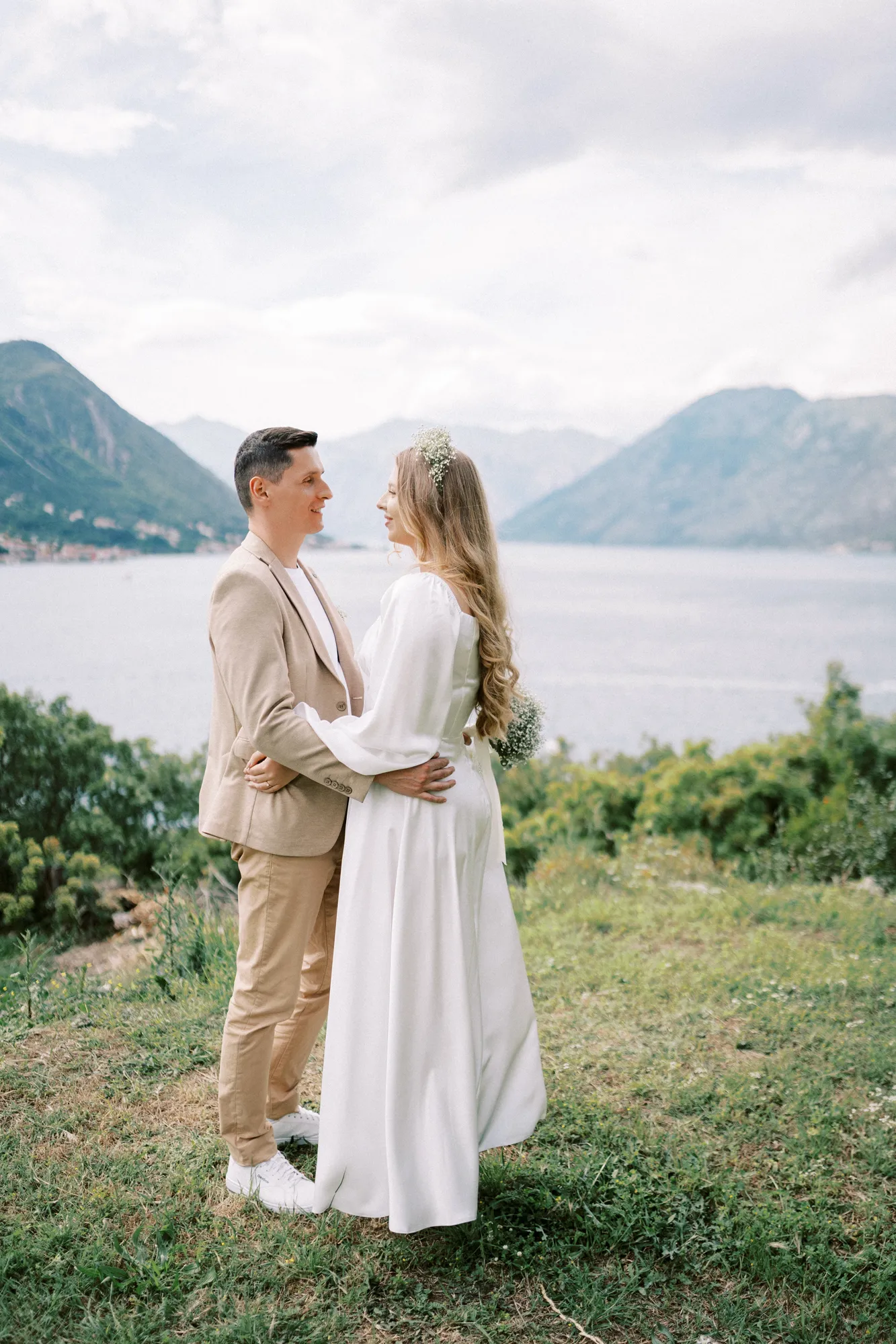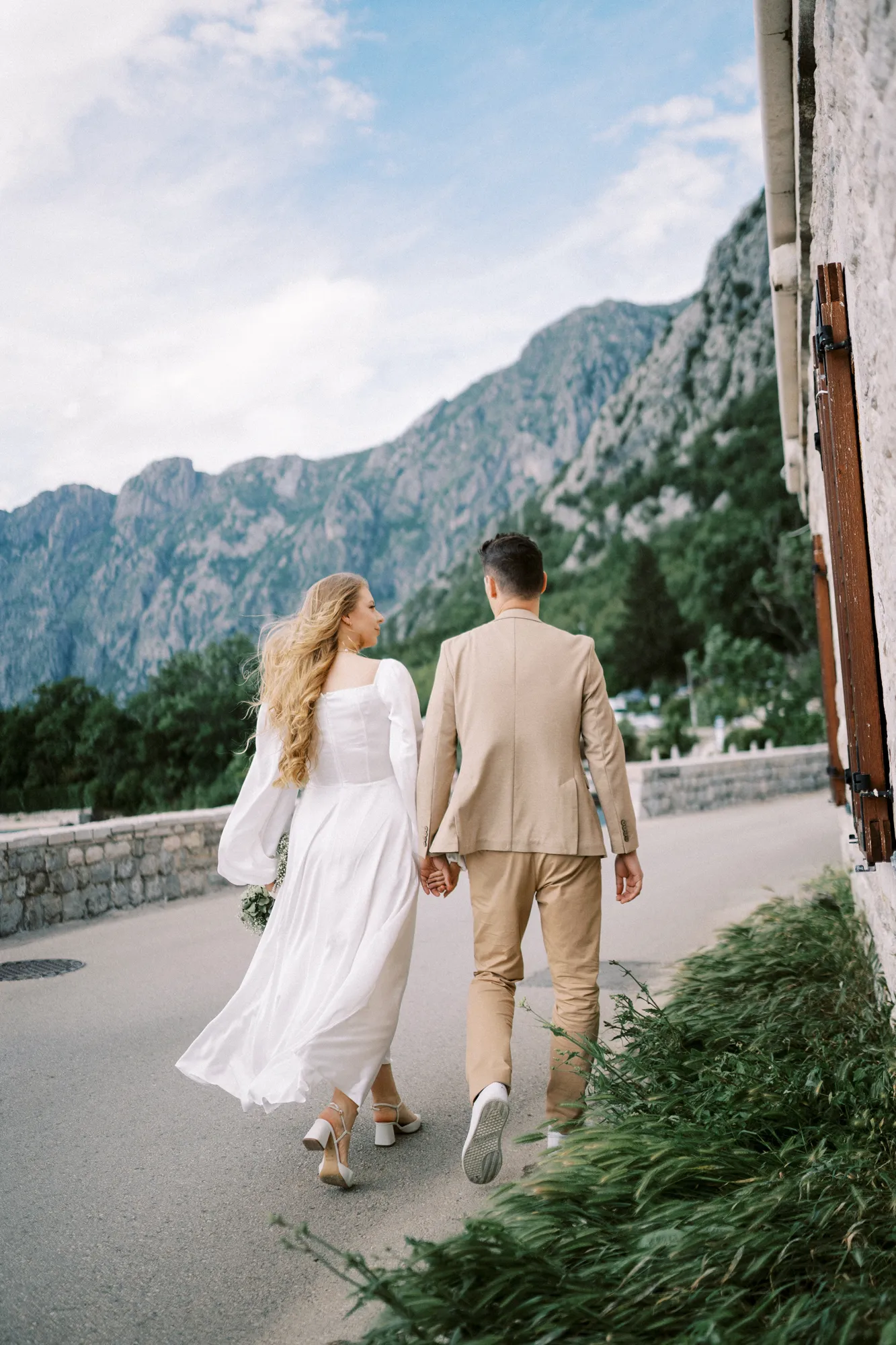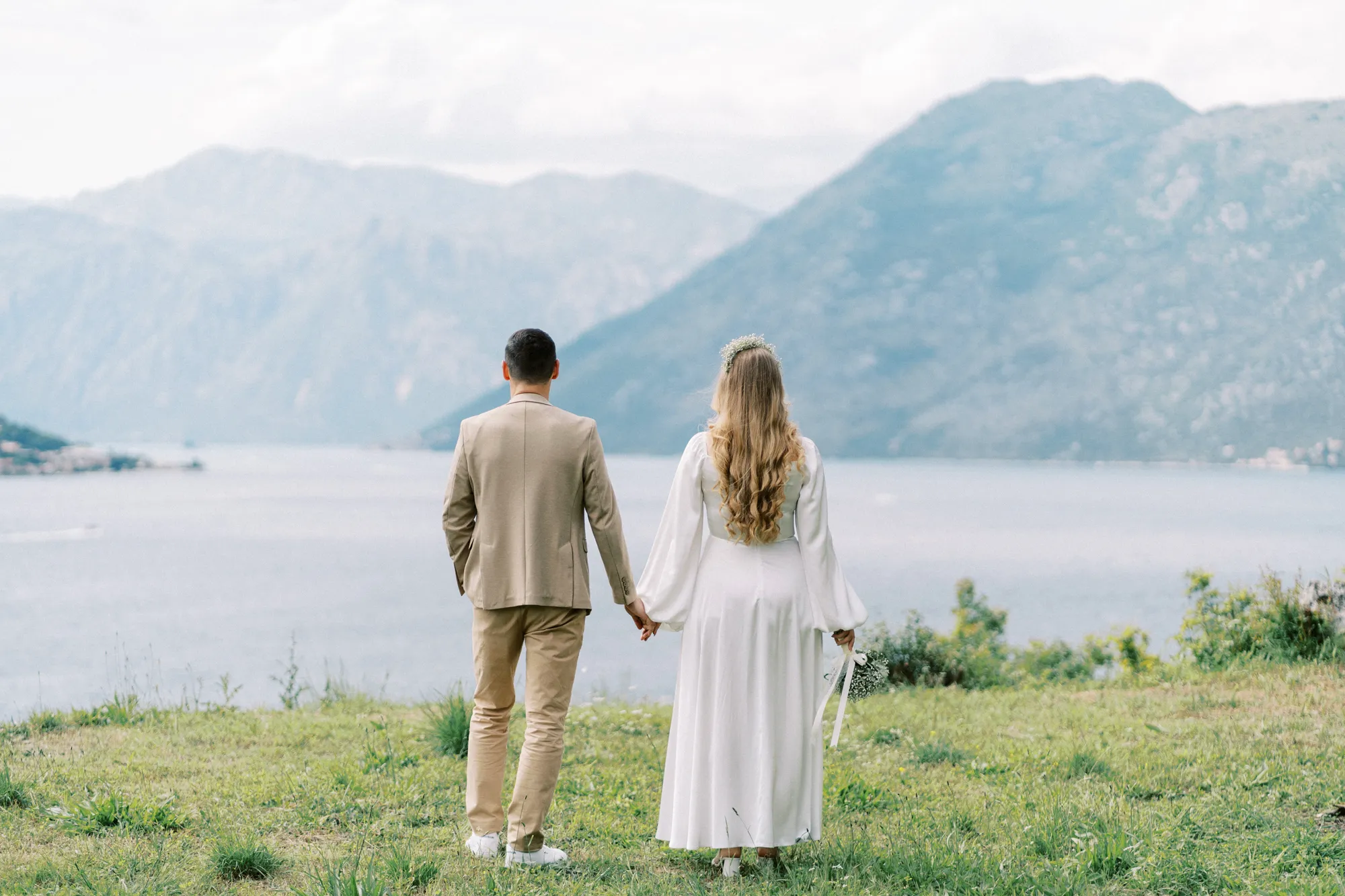 As a wedding photographer in Montenegro, I often shoot in Boka Kotorska Bay, but this windy wedding will stay with me forever. The young couple – he, confident and romantic; she, radiant and tender -met for the first time on a cliff overlooking the bay. Their boat stroll across the waters under gusts of wind was full of sparks: laughter, glances, light touches.