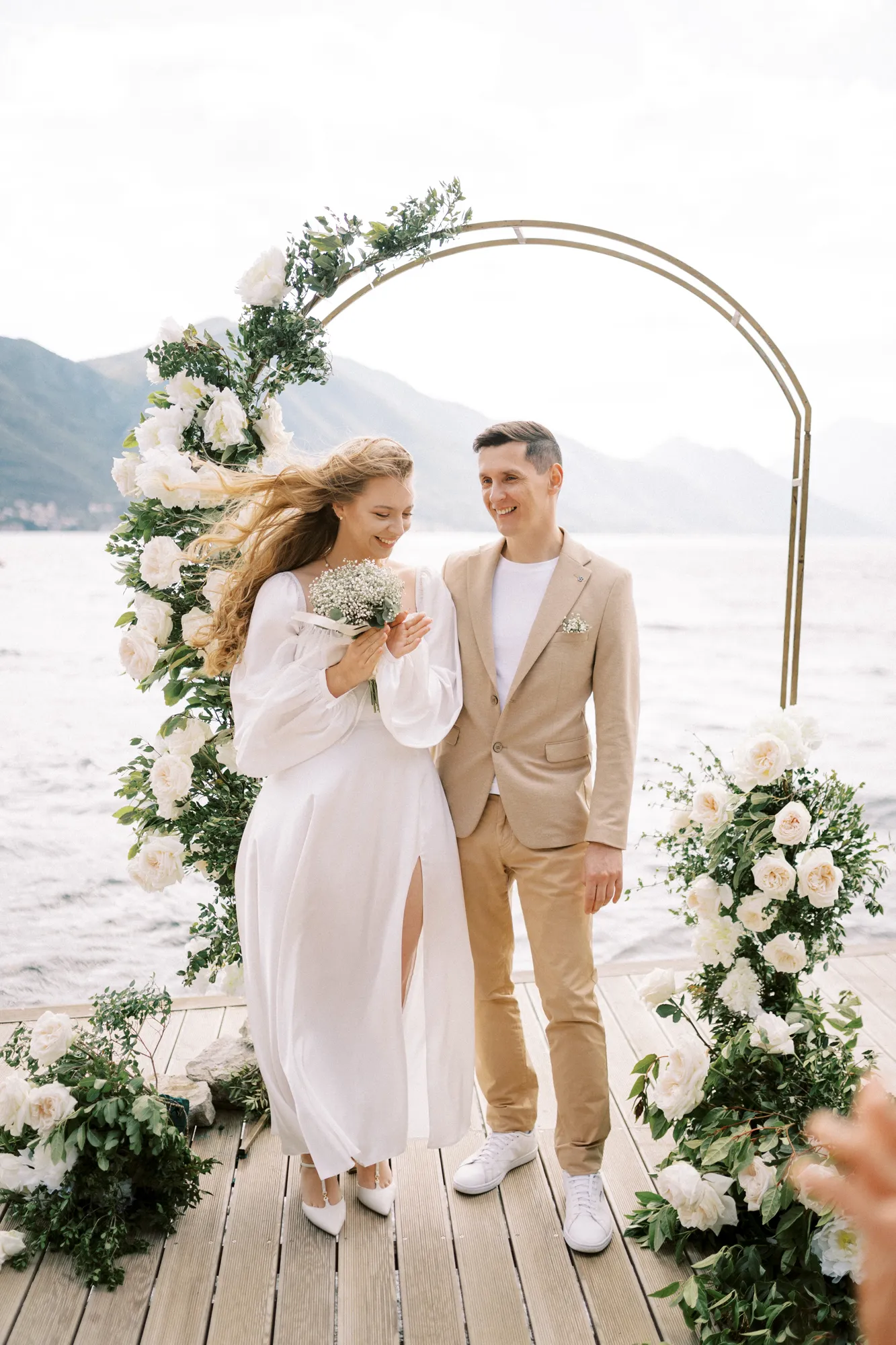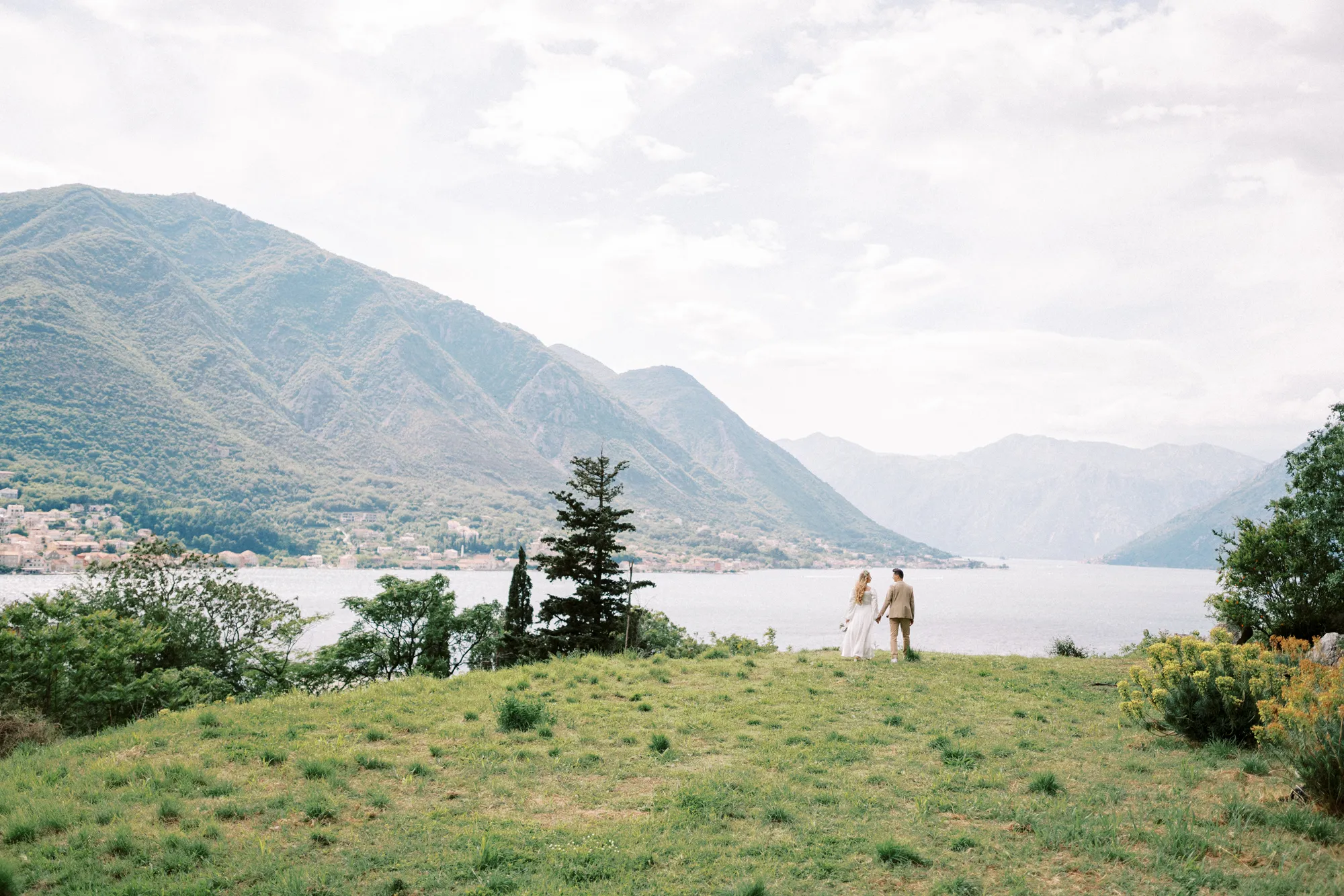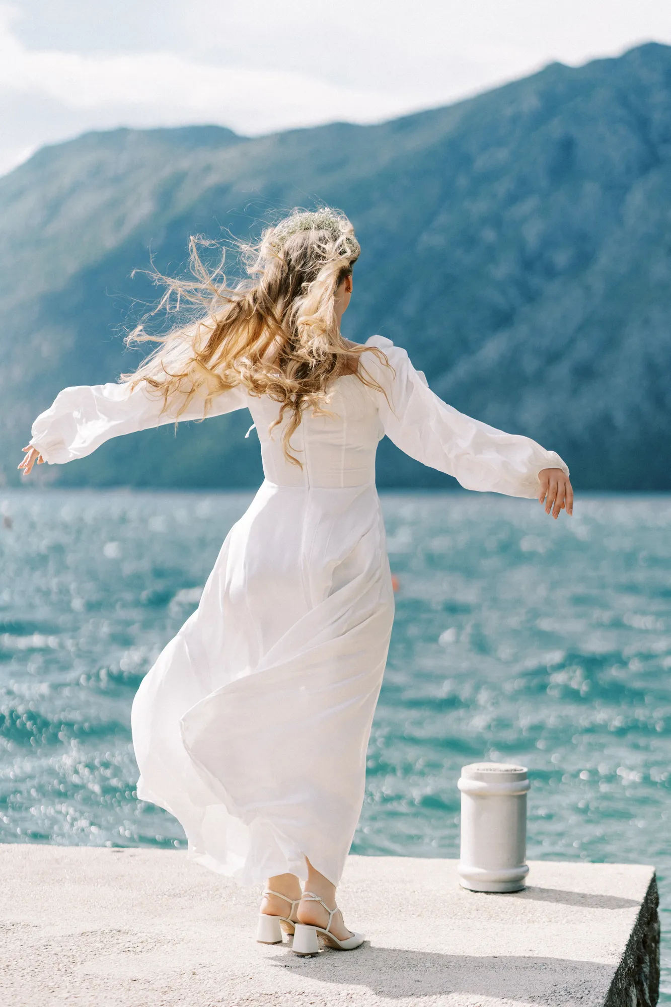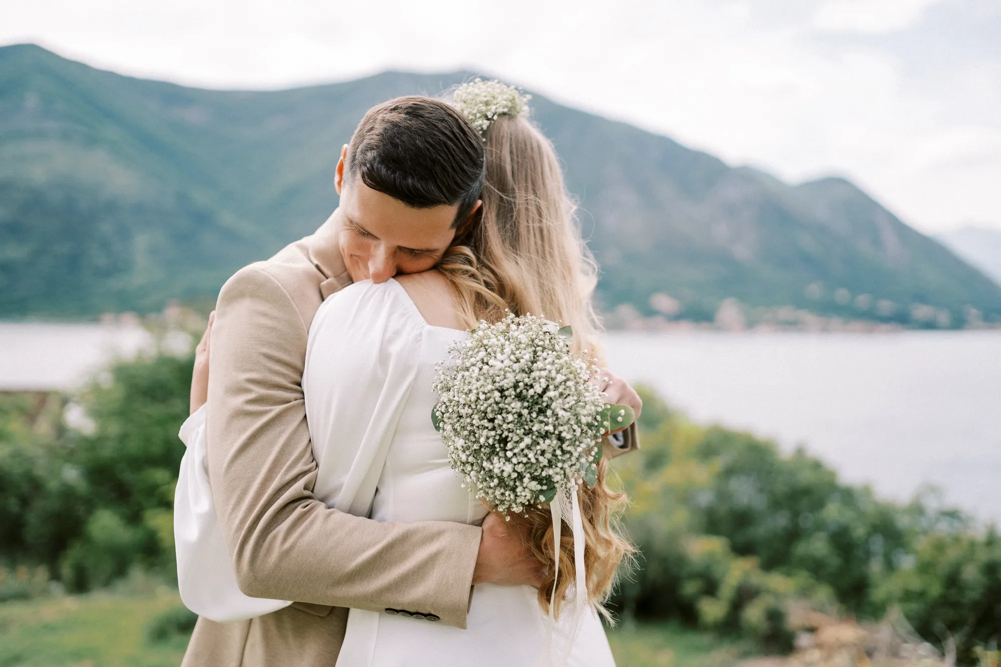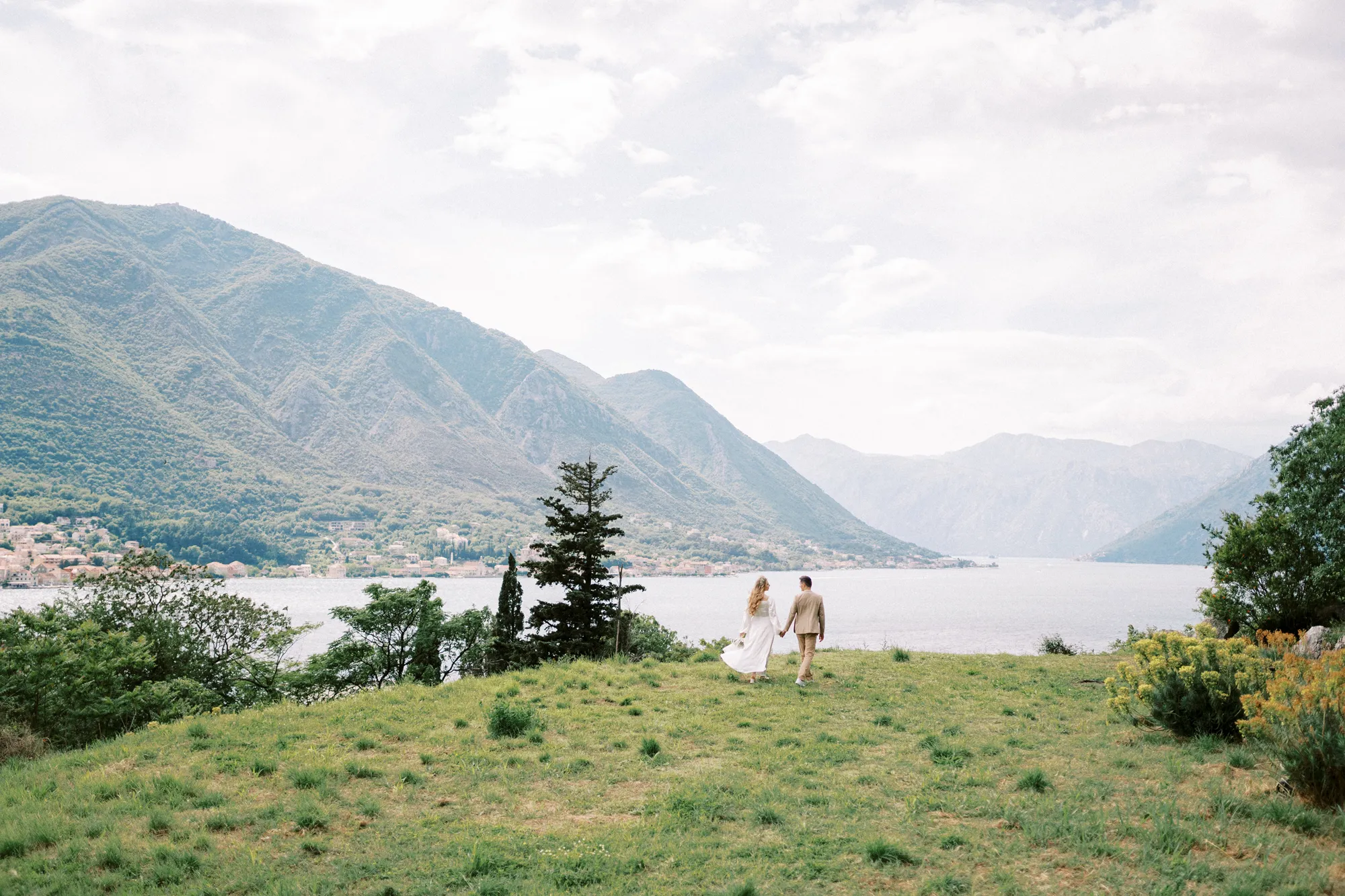 As a wedding photographer in Montenegro, I often shoot in Boka Kotorska Bay, but this windy wedding will stay with me forever. The young couple – he, confident and romantic; she, radiant and tender -met for the first time on a cliff overlooking the bay. Their boat stroll across the waters under gusts of wind was full of sparks: laughter, glances, light touches.