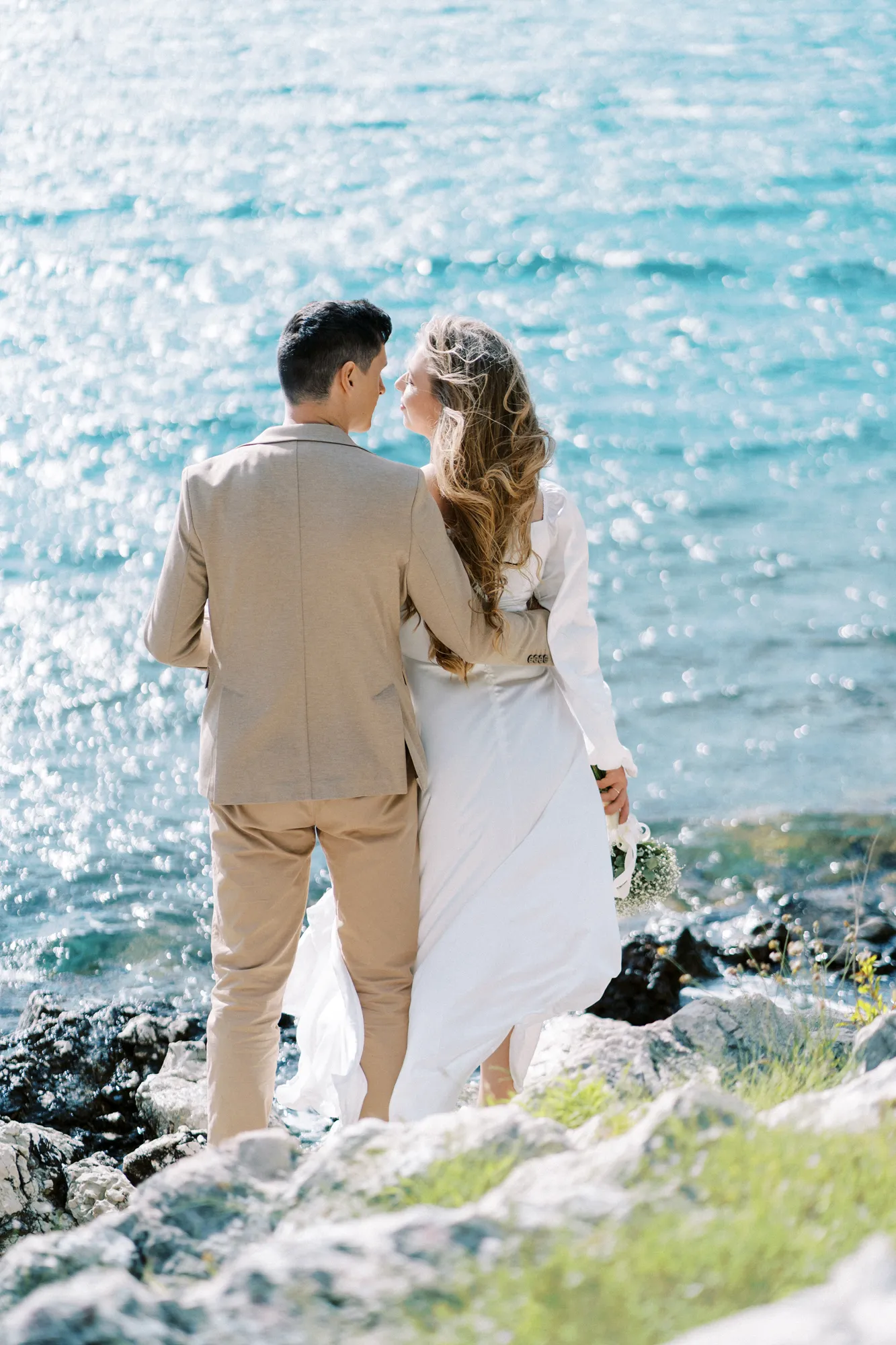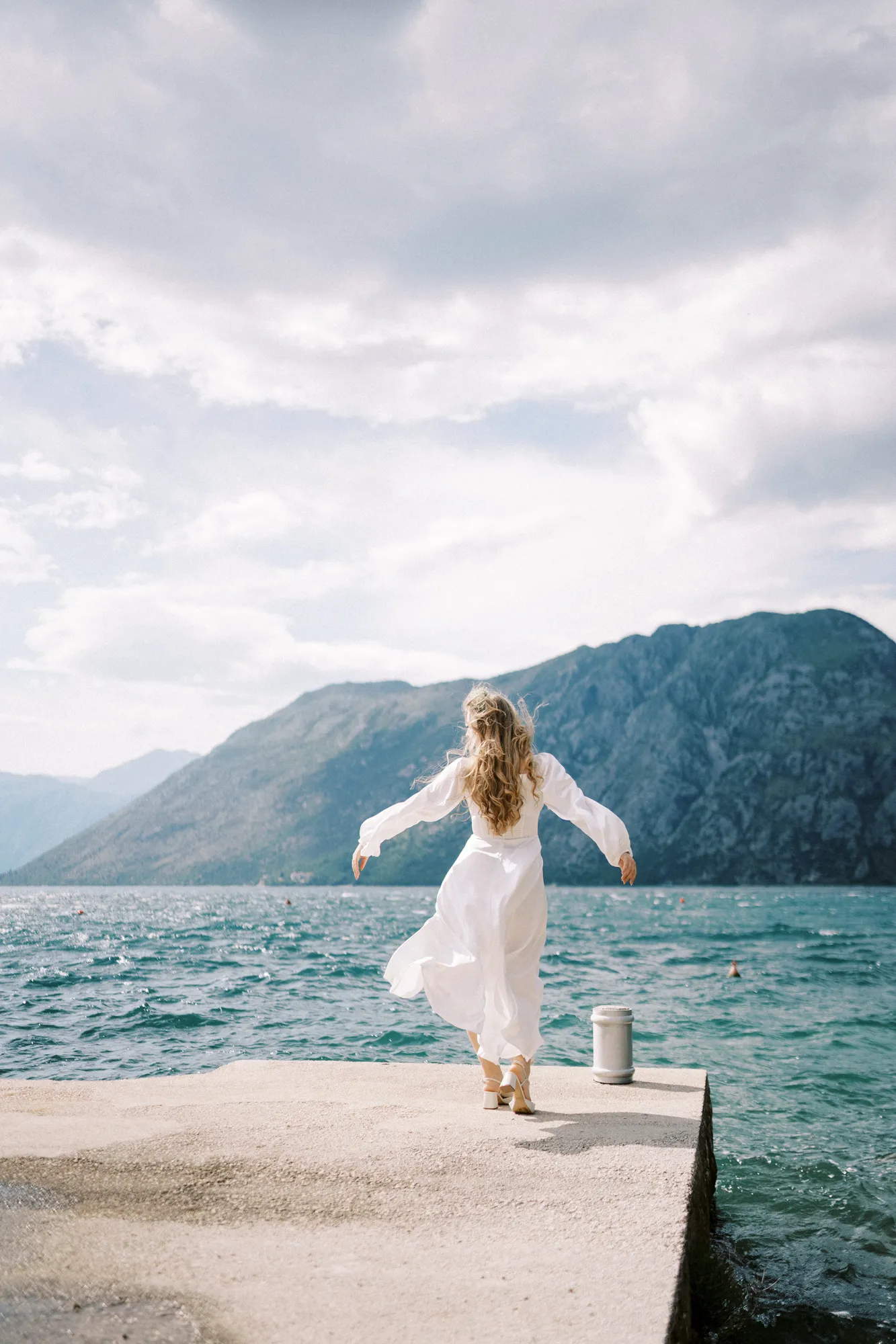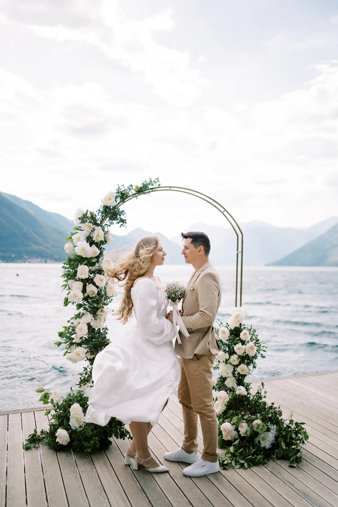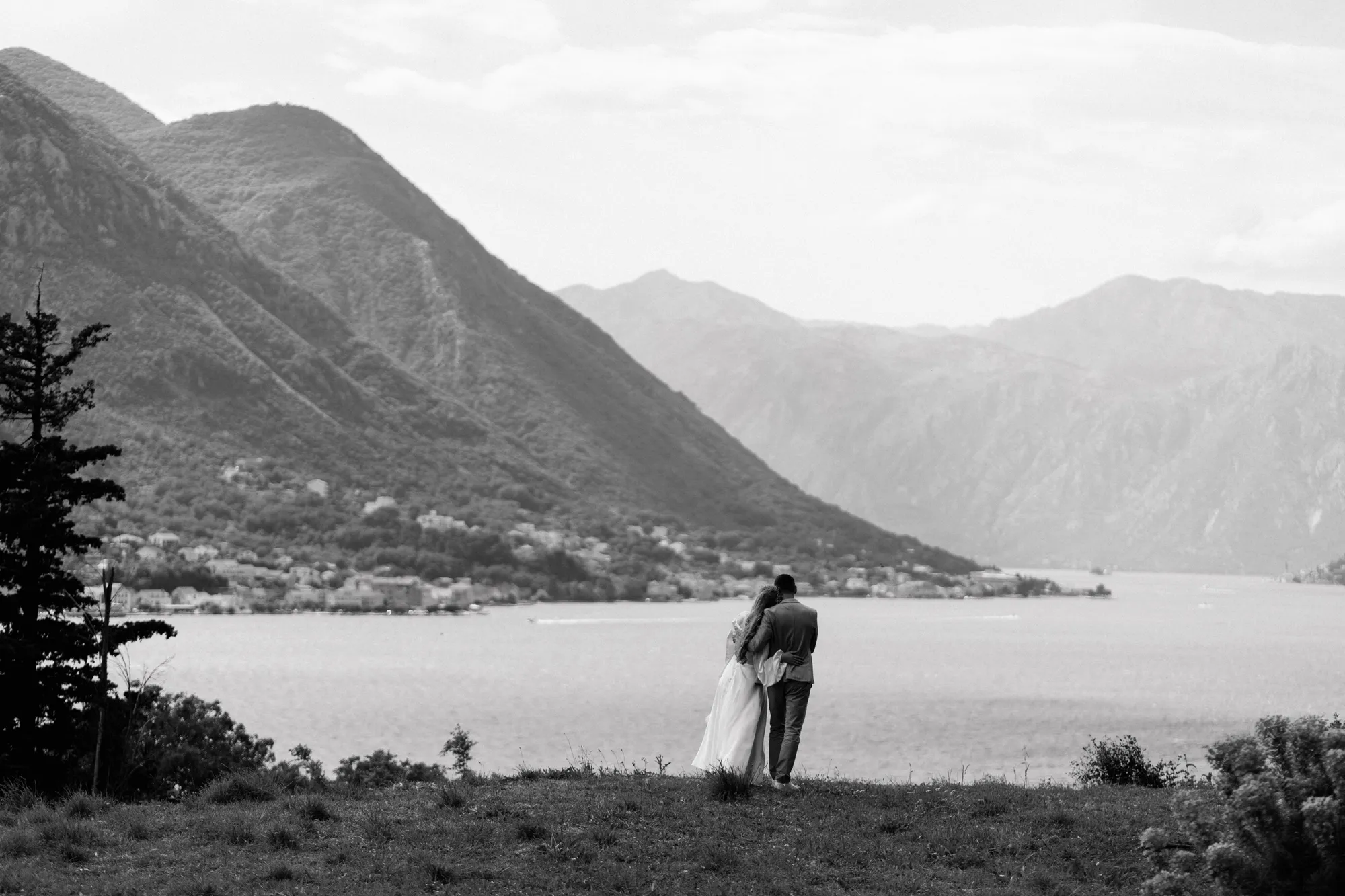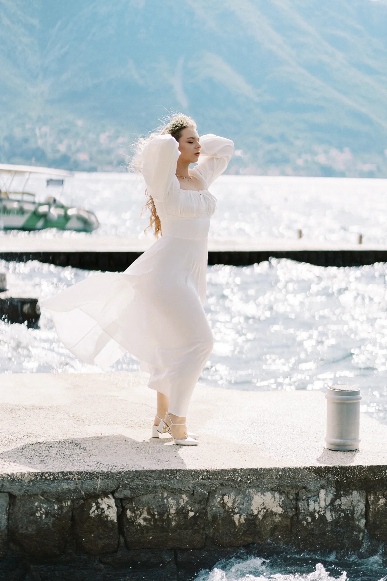 As a wedding photographer in Montenegro, I often shoot in Boka Kotorska Bay, but this windy wedding will stay with me forever. The young couple – he, confident and romantic; she, radiant and tender -met for the first time on a cliff overlooking the bay. Their boat stroll across the waters under gusts of wind was full of sparks: laughter, glances, light touches.