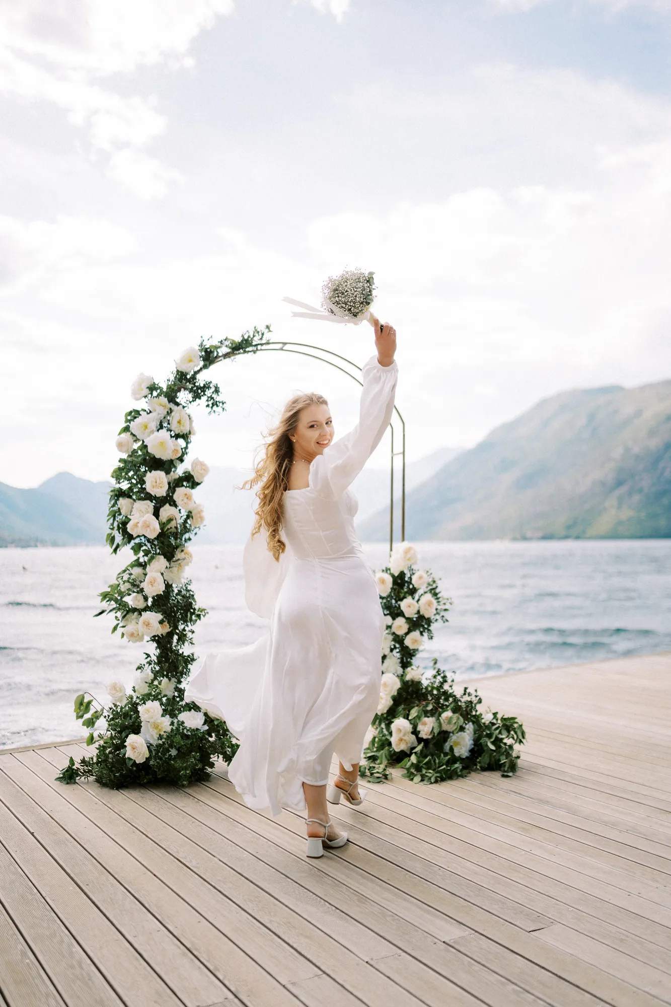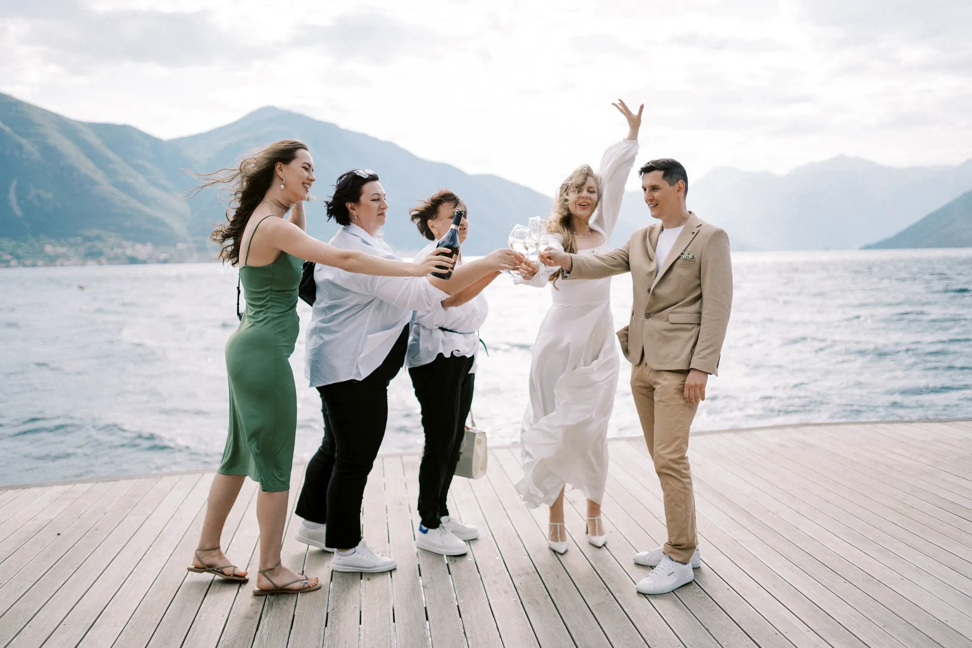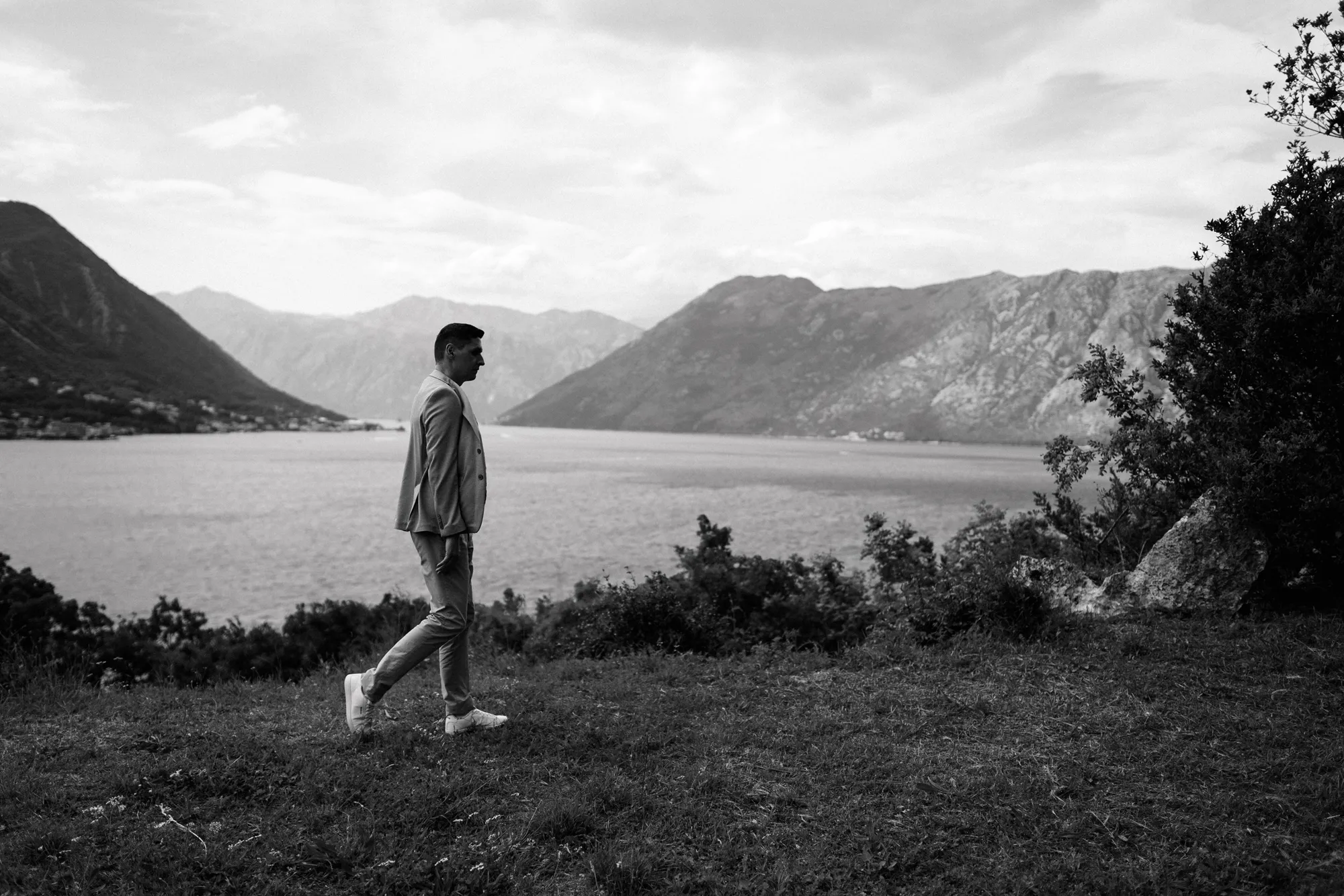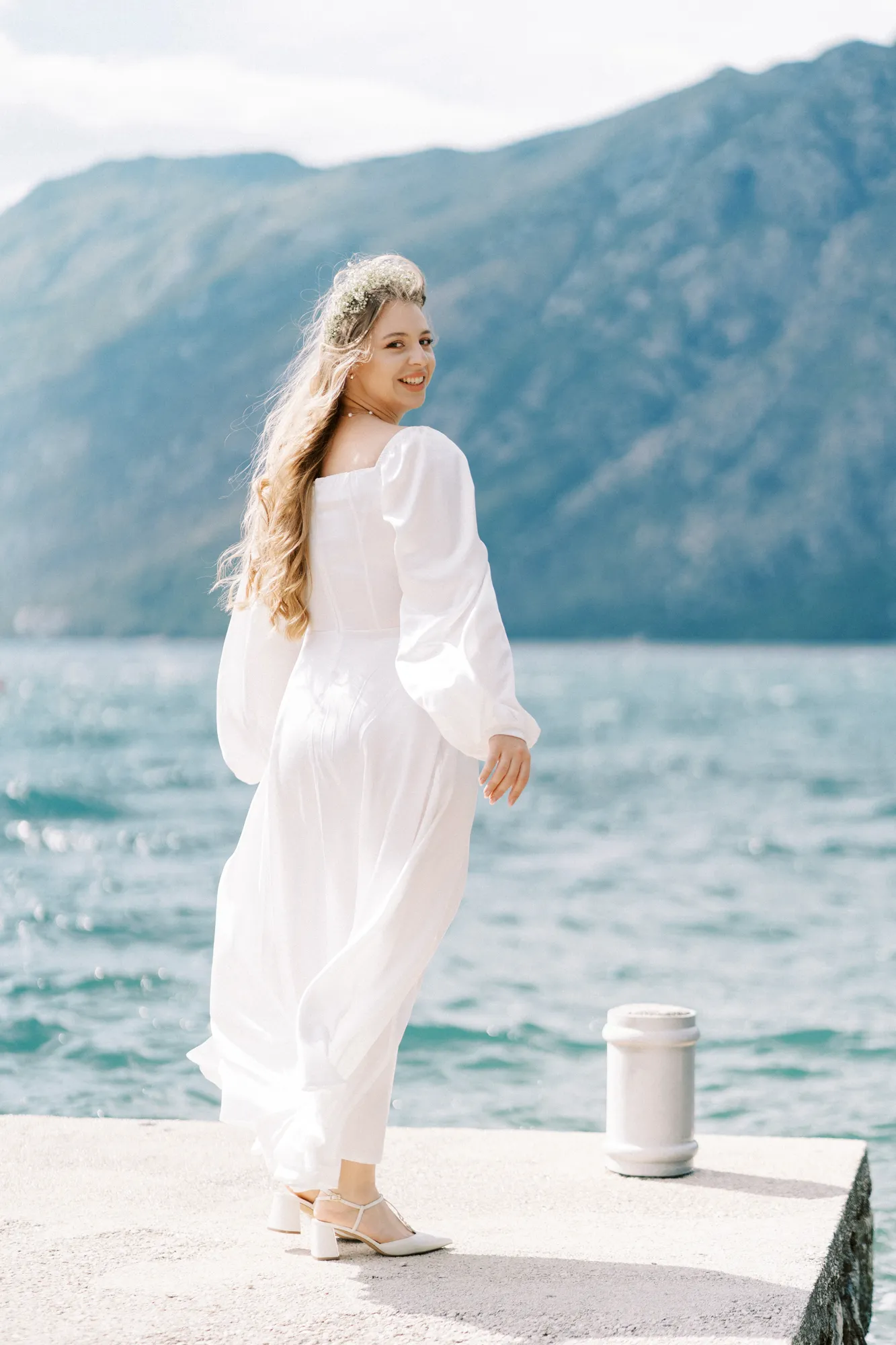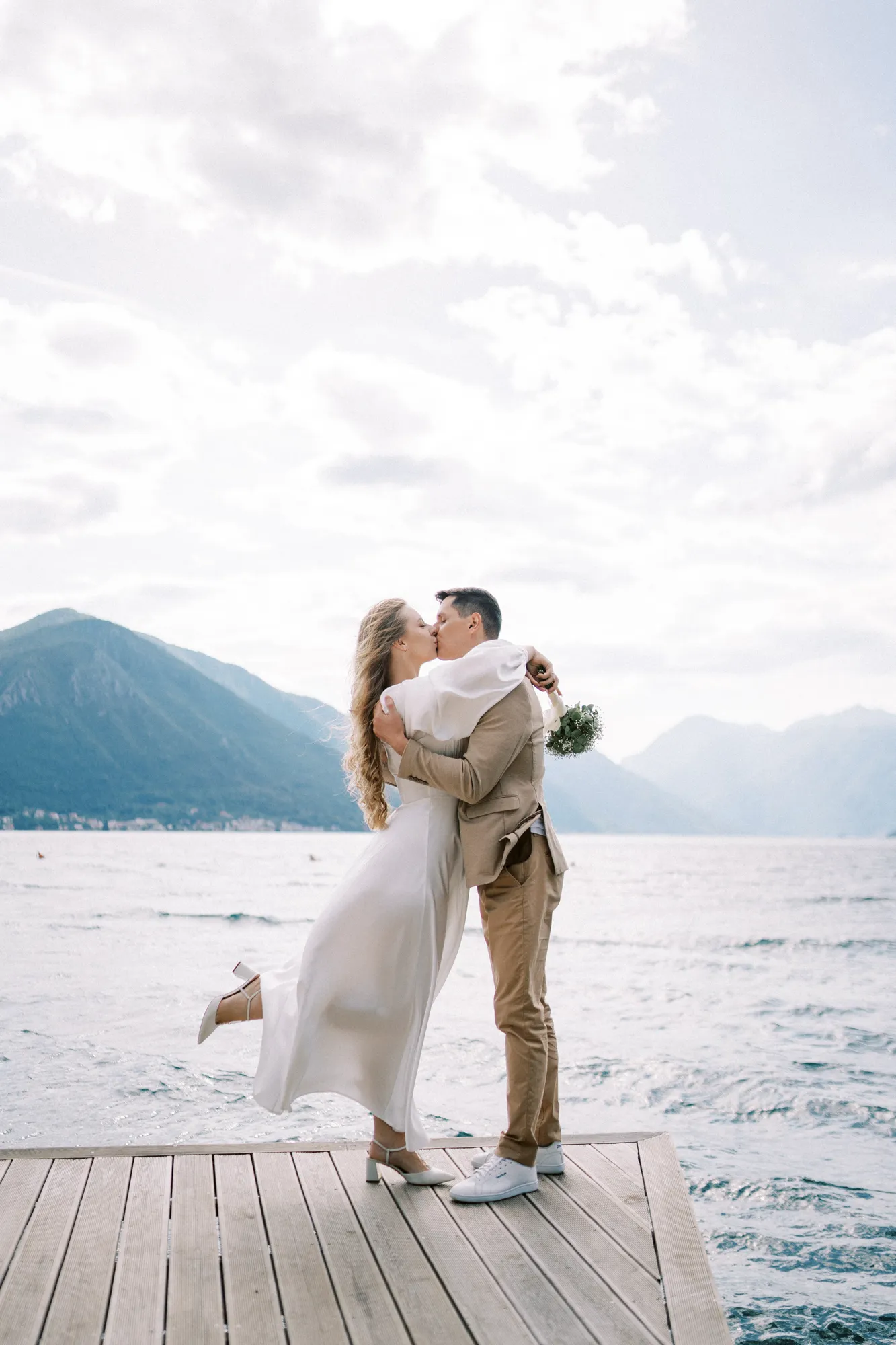 As a wedding photographer in Montenegro, I often shoot in Boka Kotorska Bay, but this windy wedding will stay with me forever. The young couple – he, confident and romantic; she, radiant and tender -met for the first time on a cliff overlooking the bay. Their boat stroll across the waters under gusts of wind was full of sparks: laughter, glances, light touches.